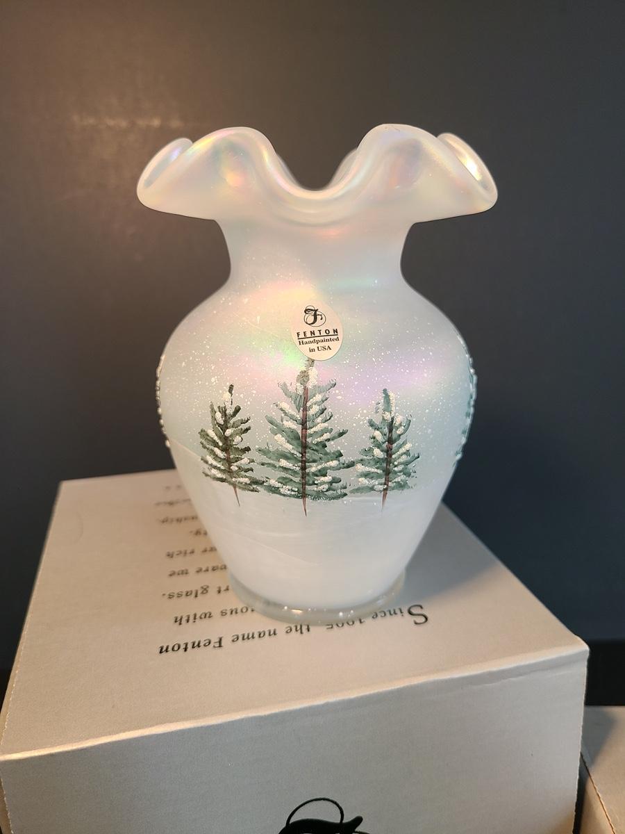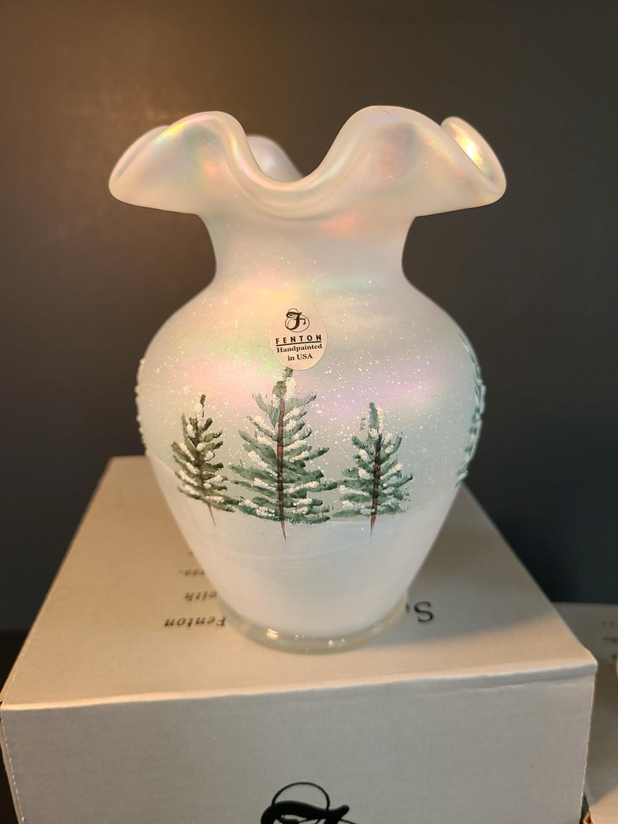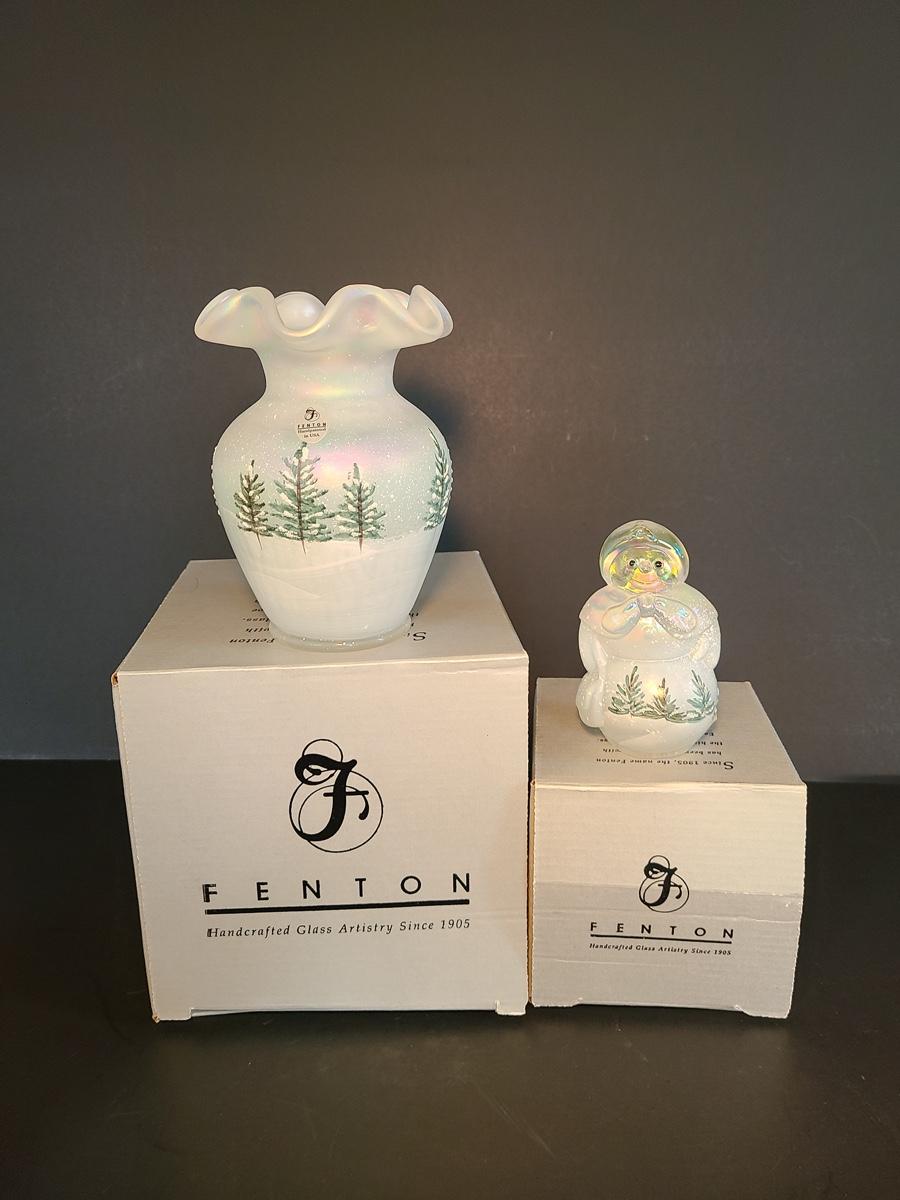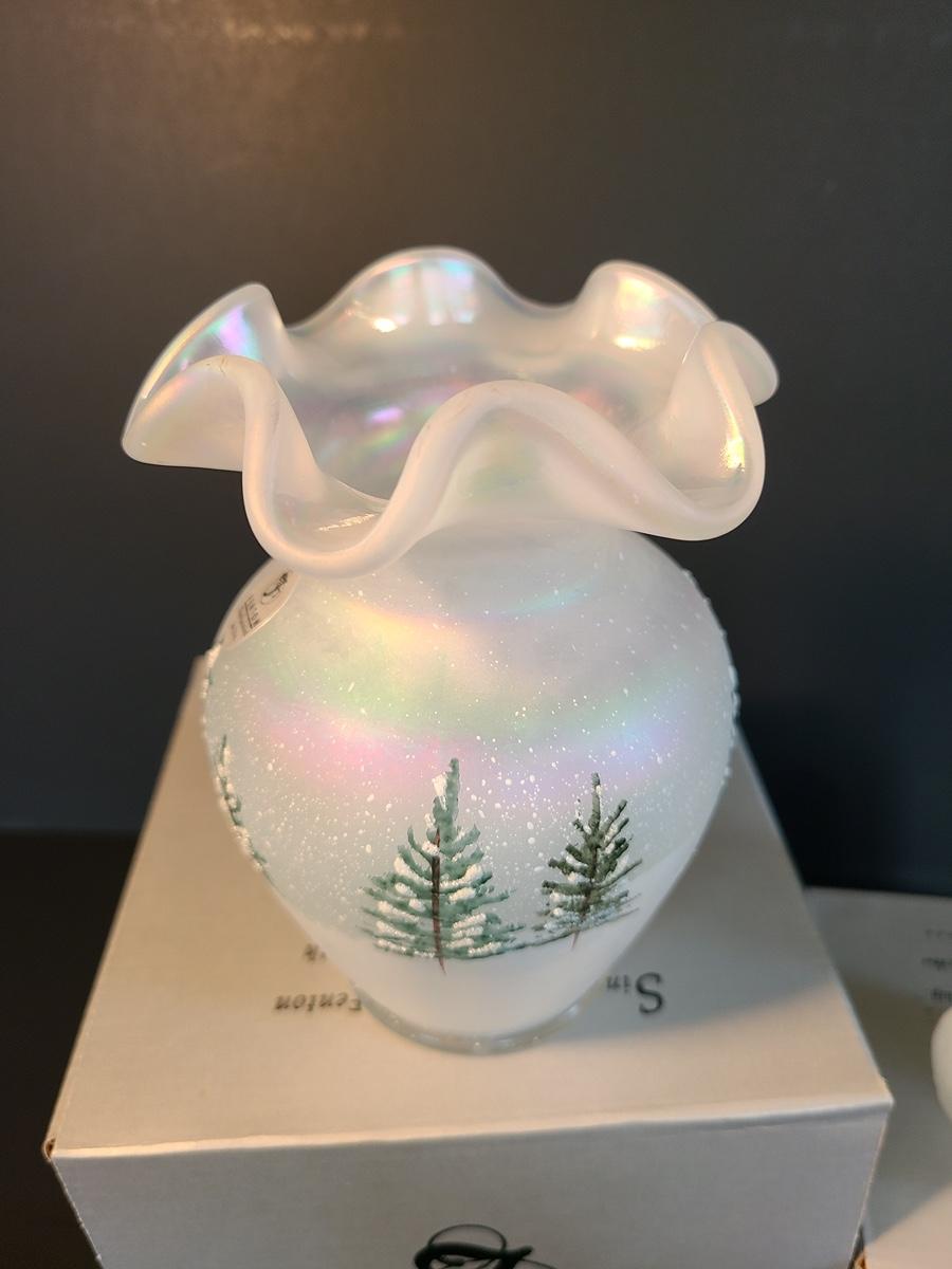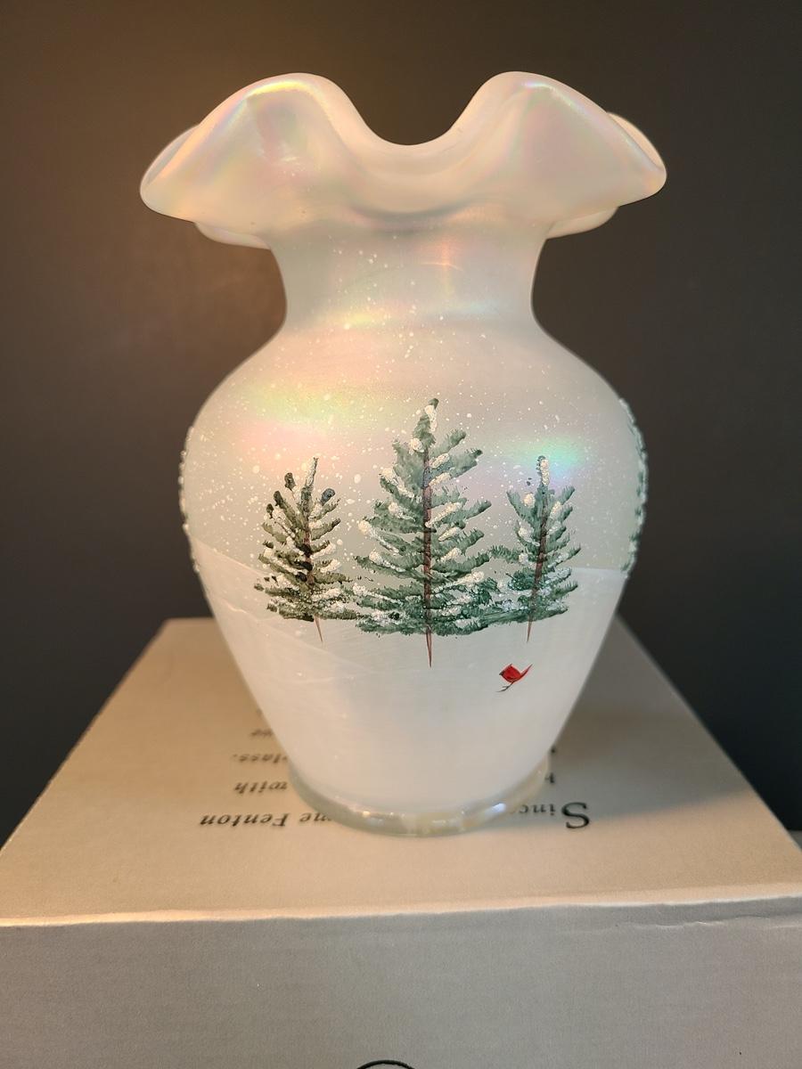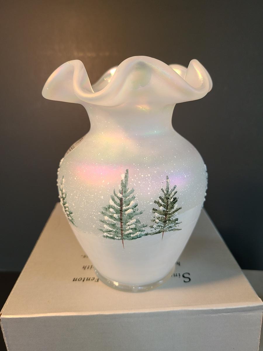 Lot 174: Fenton Woodland Frost Holiday Vase and Snowlady (Evergreens/Cardinals)