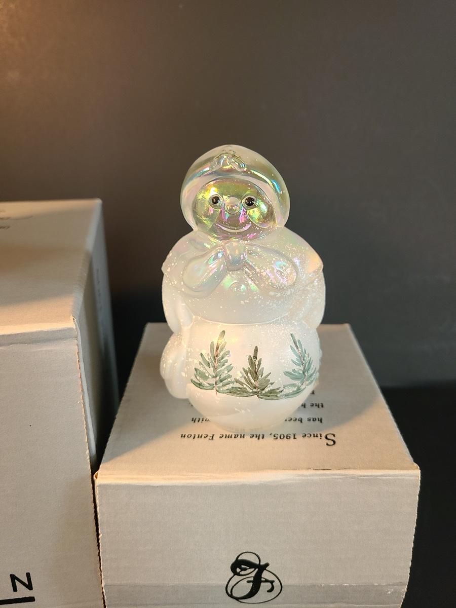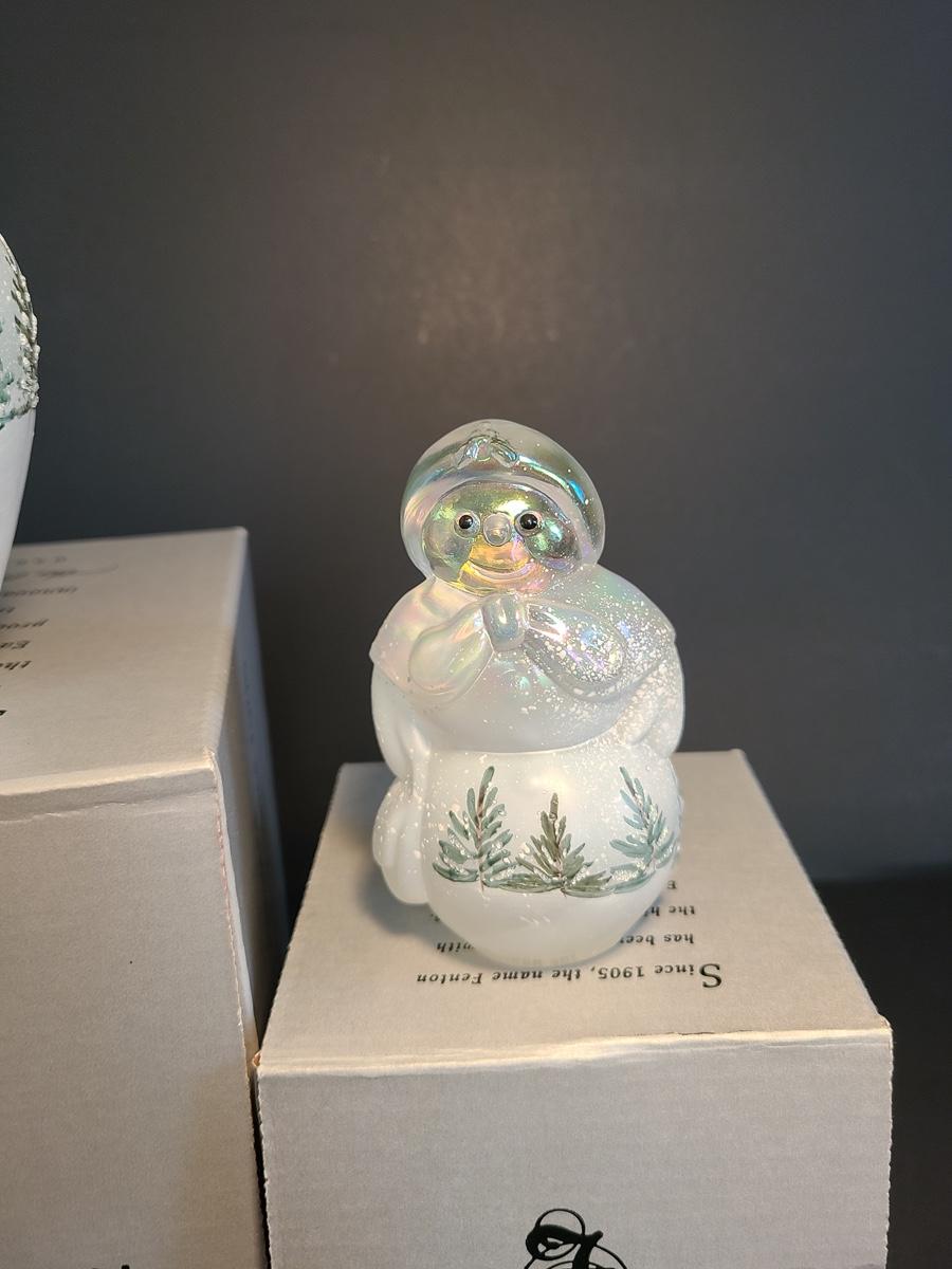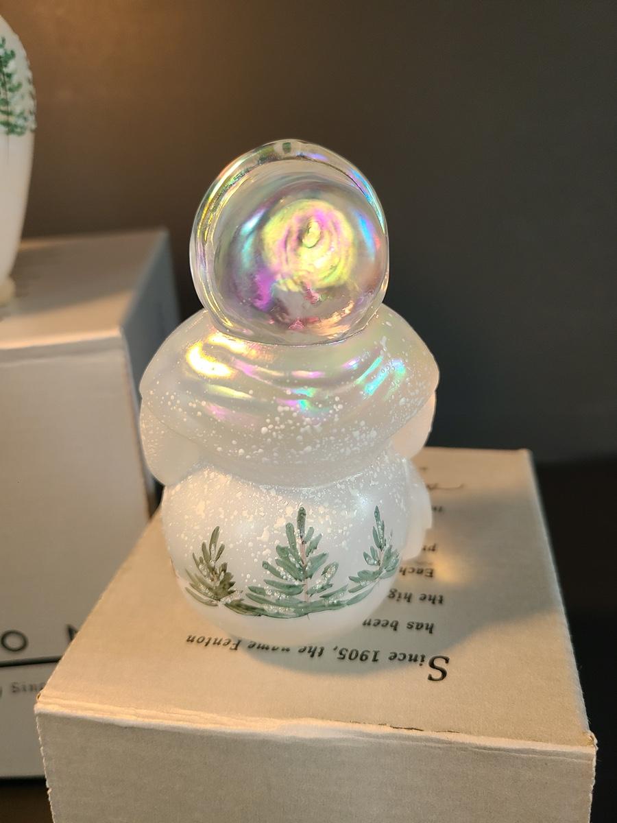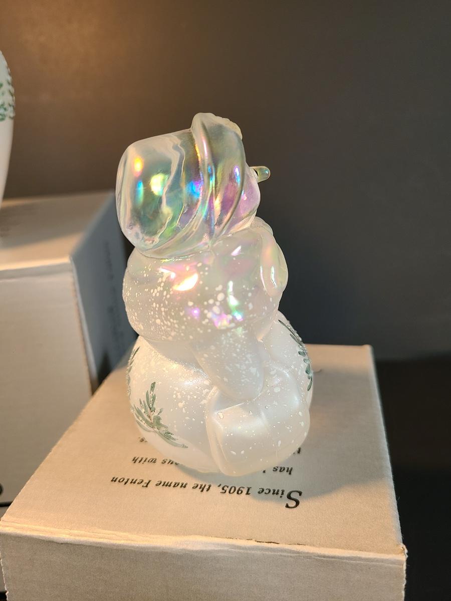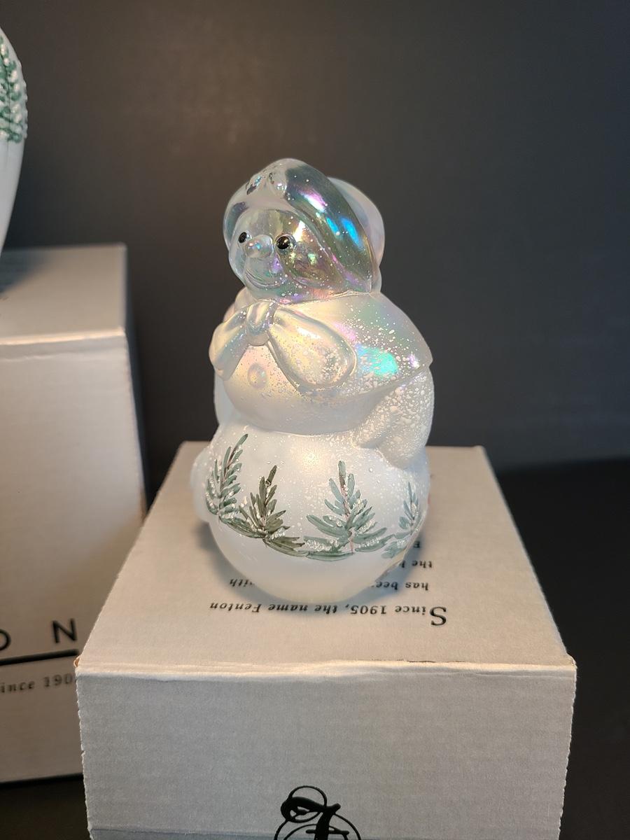 Lot 174: Fenton Woodland Frost Holiday Vase and Snowlady (Evergreens/Cardinals)