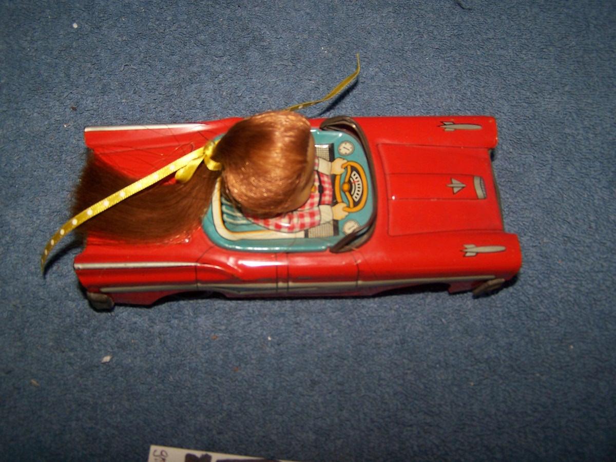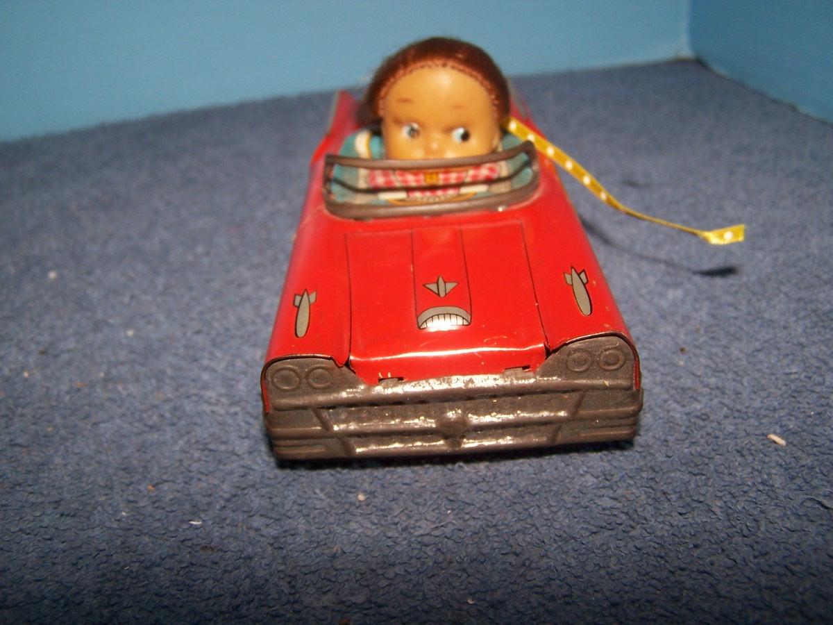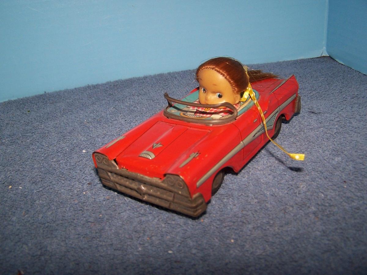 THIS IS A GRAND VINTAGE TIN LITHO FRICTION GIRL in CAR!!! SHE IS LITTLE SUZY.. WORKS.. 6'' LONG.. SOME WEAR..