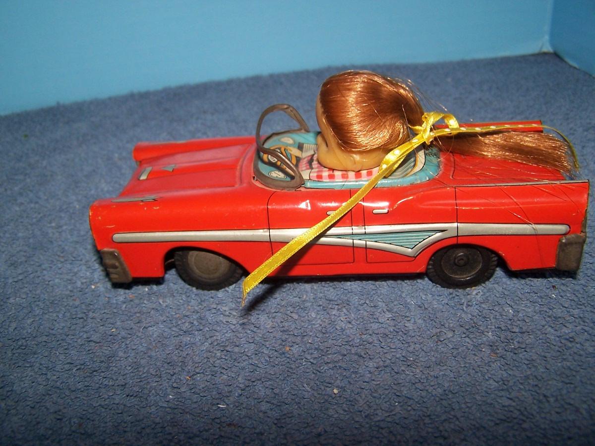 LOT 174 GRAND VINTAGE TIN LITHO FRICTION GIRL in CAR