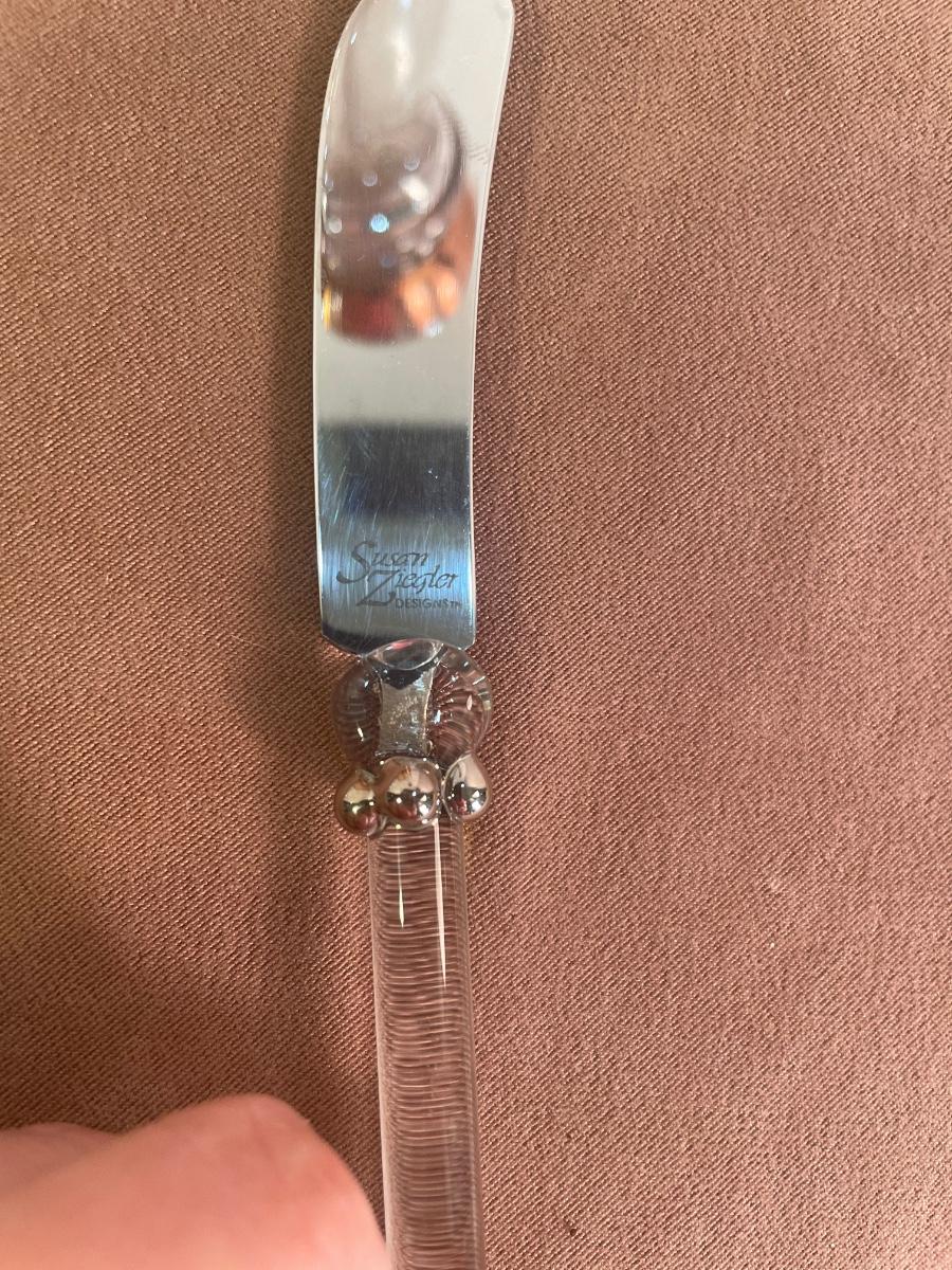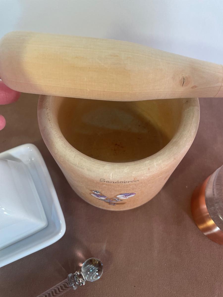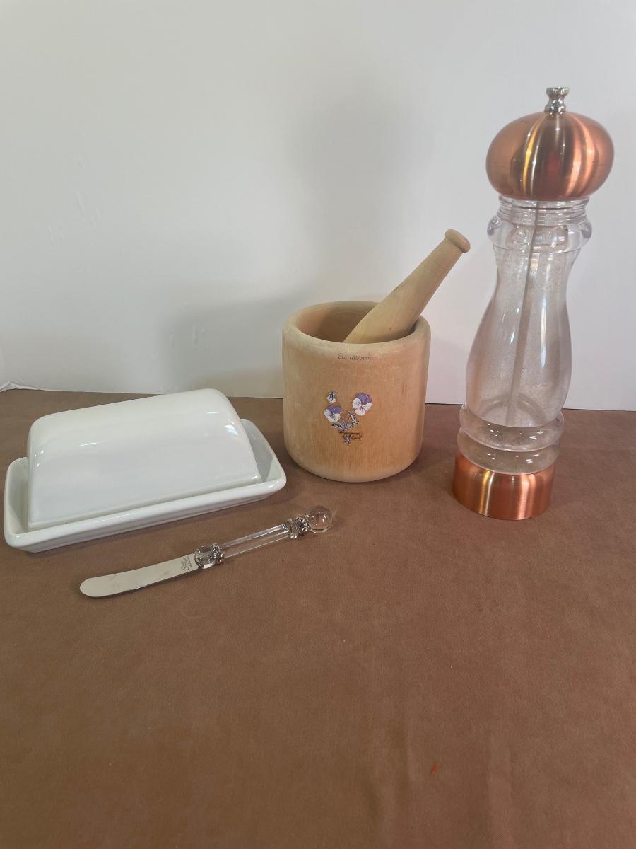 Pepper grinder, ceramic butter dish, lucite butter knife and wooden mortar and pestle