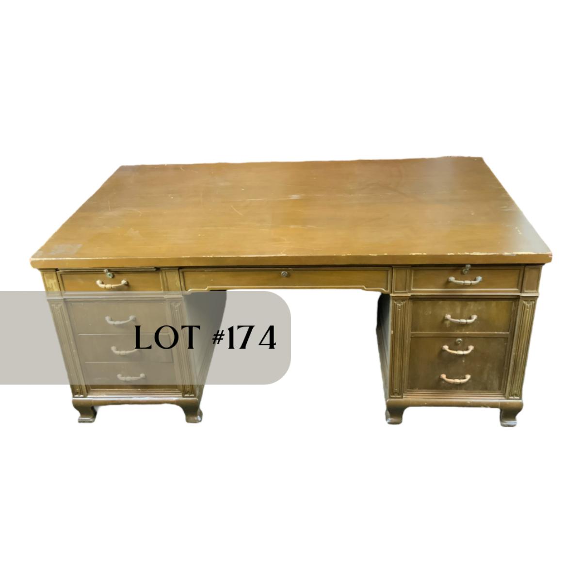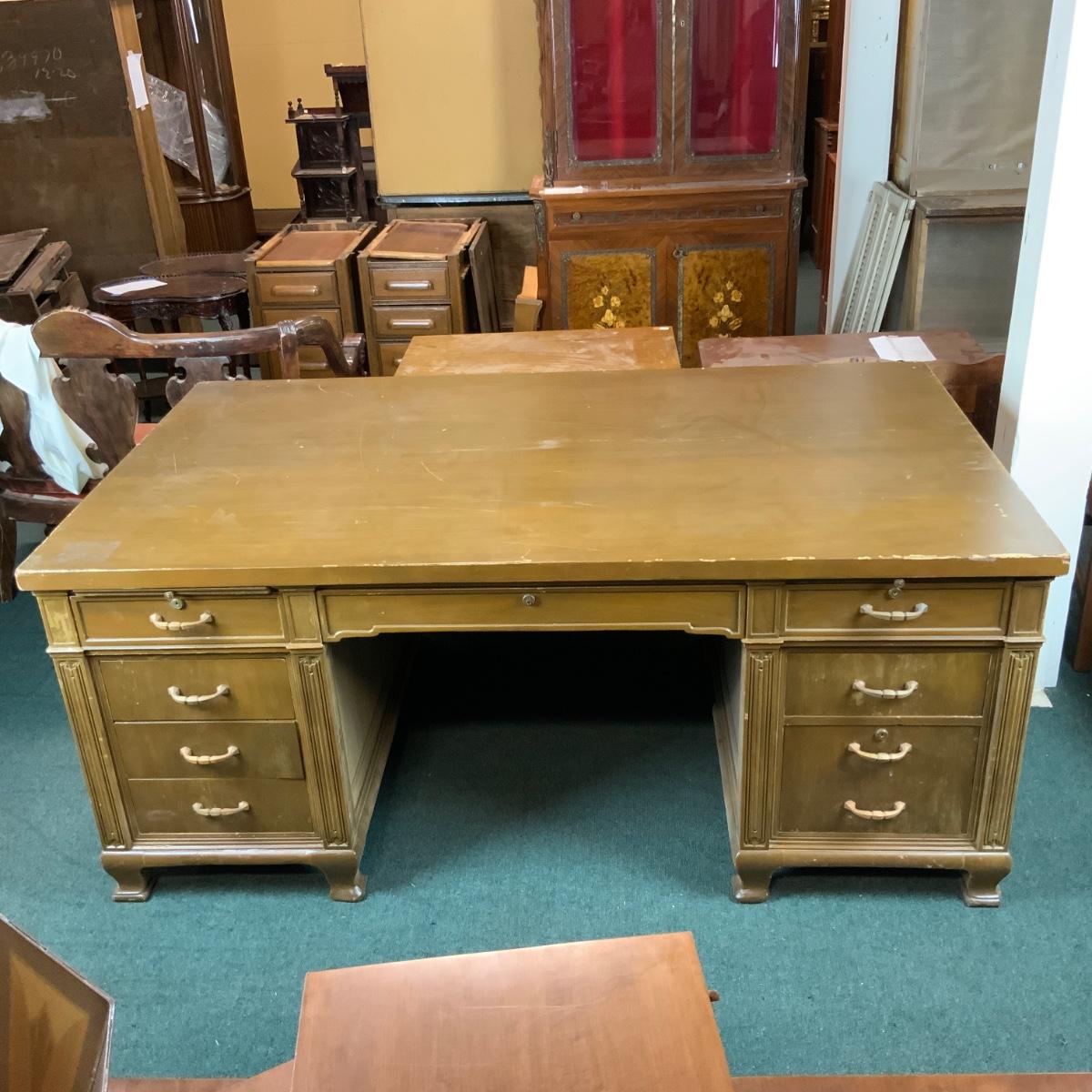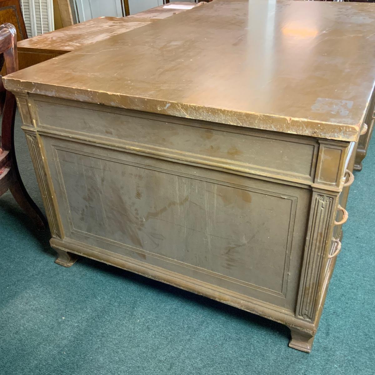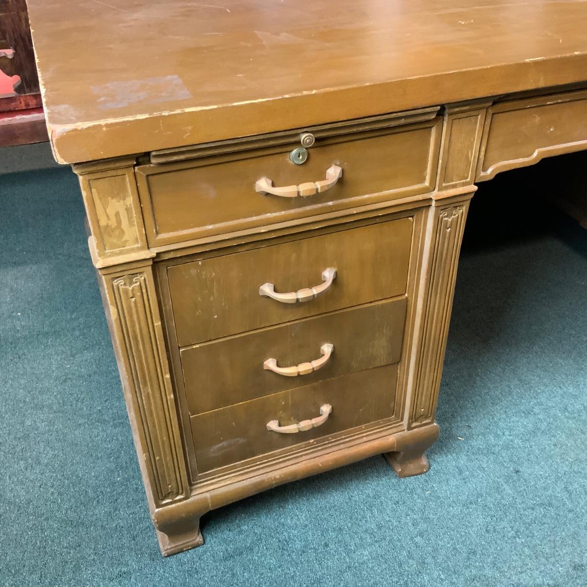 Massive Dolton Dunton Desk with Privacy Panel. An impressive desk for an impressive person: you! //::\\ Please see photos for details and condition. No attempt has been made to hide any imperfections. All items listed in this auction are warehouse items, and need to be cleaned. A majority of the items need restoration as well. All items are sold AS IS and WITHOUT GUARANTEE. If you are uncertain about an item, DO NOT BID. Due to the nature of this online auction in-person inspection is HIGHLY recommended. All Sales are FINAL. Pick Up Times are FIRM. Please confirm with your own schedule that you can pick up in the scheduled times listed in the Terms and Conditions. Any questions please message the auctioneer. DO NOT Contact The Harp Gallery.