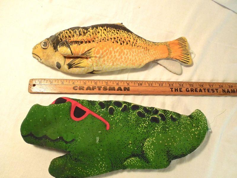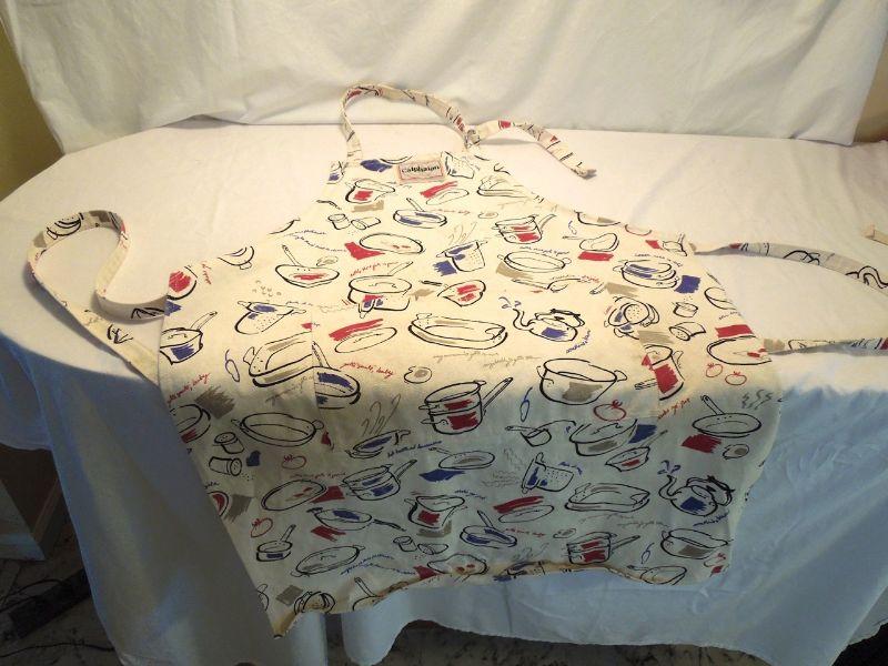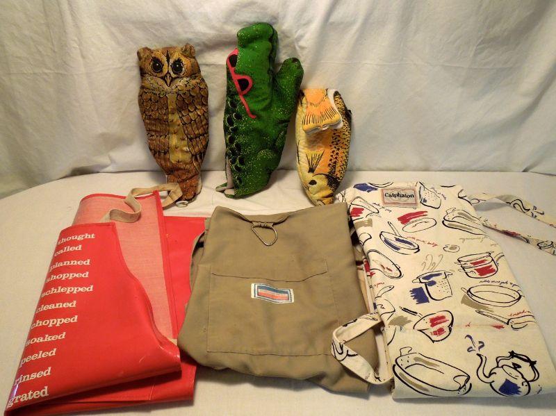 3 animal kitchen mitts slightly used and 3 aprons. The Cordon Blue tan apron is a half apron. The Calaphon apron is canvas and clean.