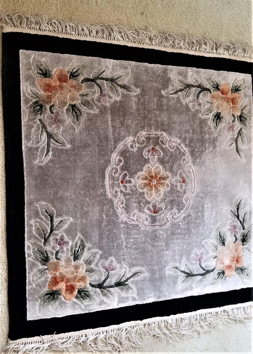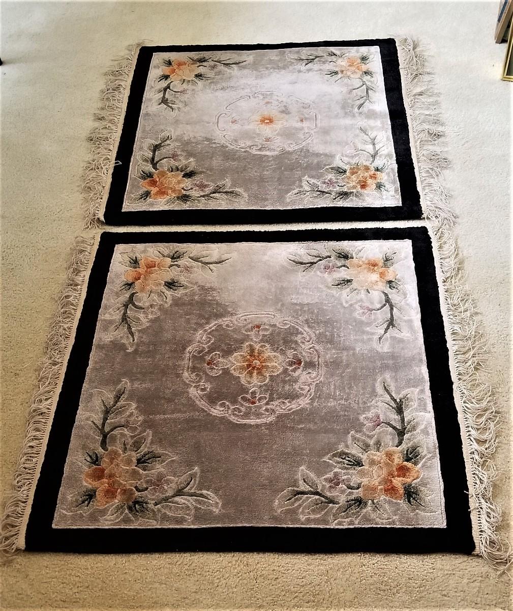 Matched pair (each 31" x 29.5" not counting fringe) of "Double Peach" hand knitted carpets. Soft and smooth - traditional Asian design. Good condition.