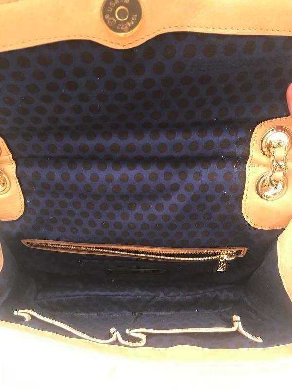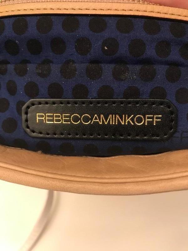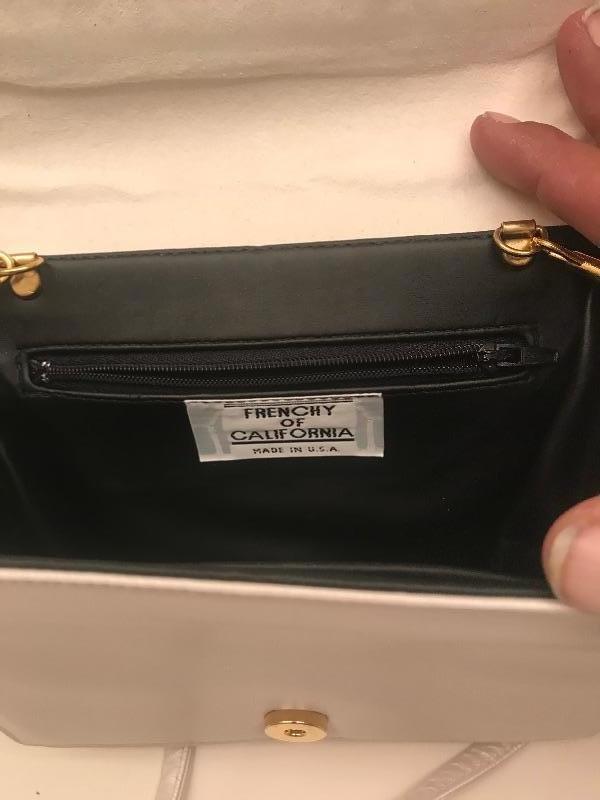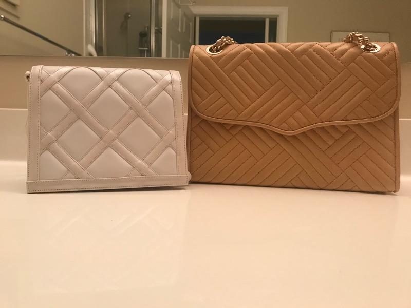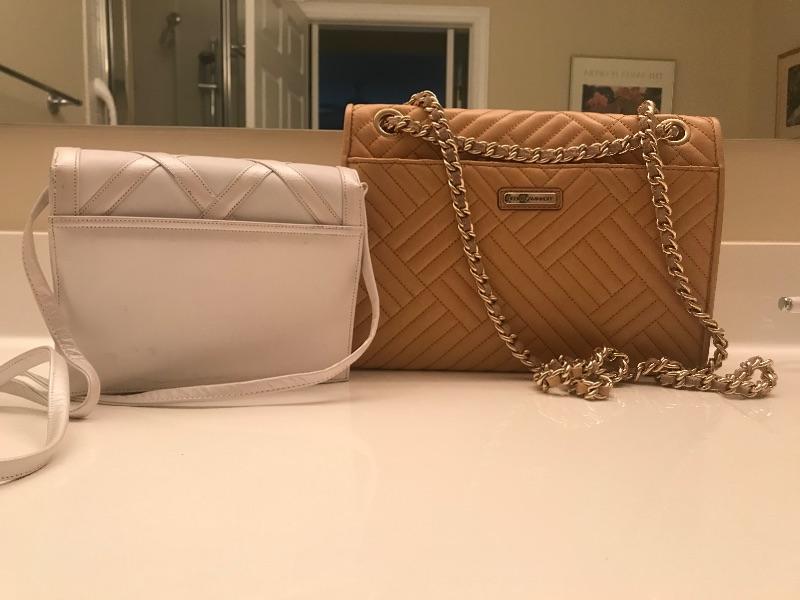 Rebecca Minkoff tan leather crossbody shoulder bag with woven leather and chain strap, measures 11” long 8” tall and 3-1/2” wide. Small white leather crossbody shoulder bag by Frenchy of California measures 7-1/2” long 6-1/2” tall and 2-1/2” wide
