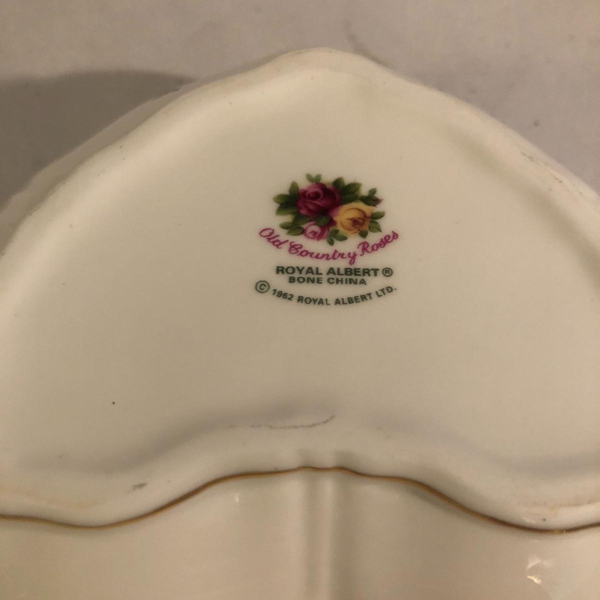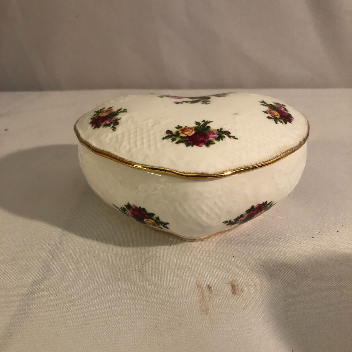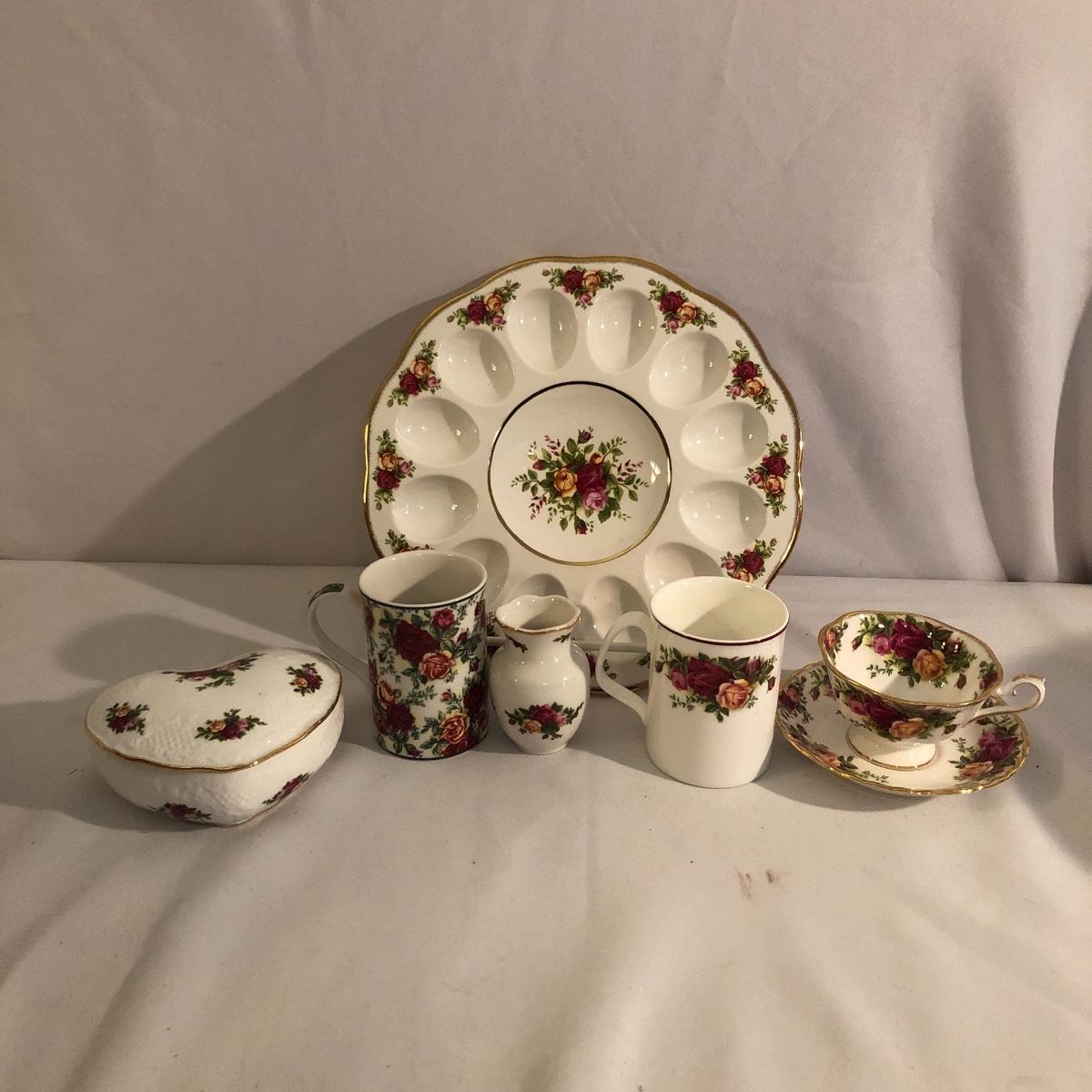 This lot is great for the person who’s is trying to add to their Royal Albert china collection. The lot includes a deviled egg plate, two mugs, a cup and saucer, mini vase, covered heart shaped bowl and a cardboard box all in the Old Country Rose pattern.