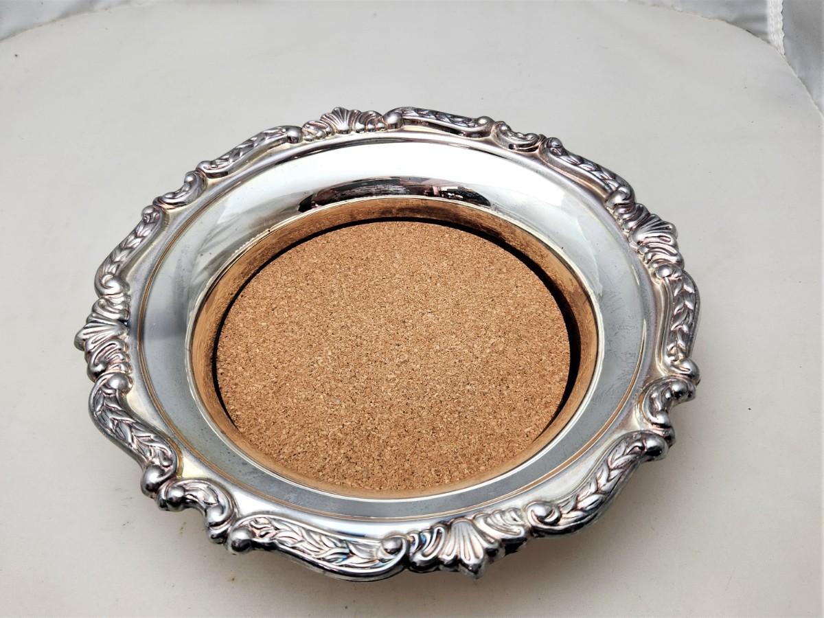 Lovely SHERIDAN silverplate Wine Bottle Coaster - removeable cork insert - 7.5" across, 1.5" tall.