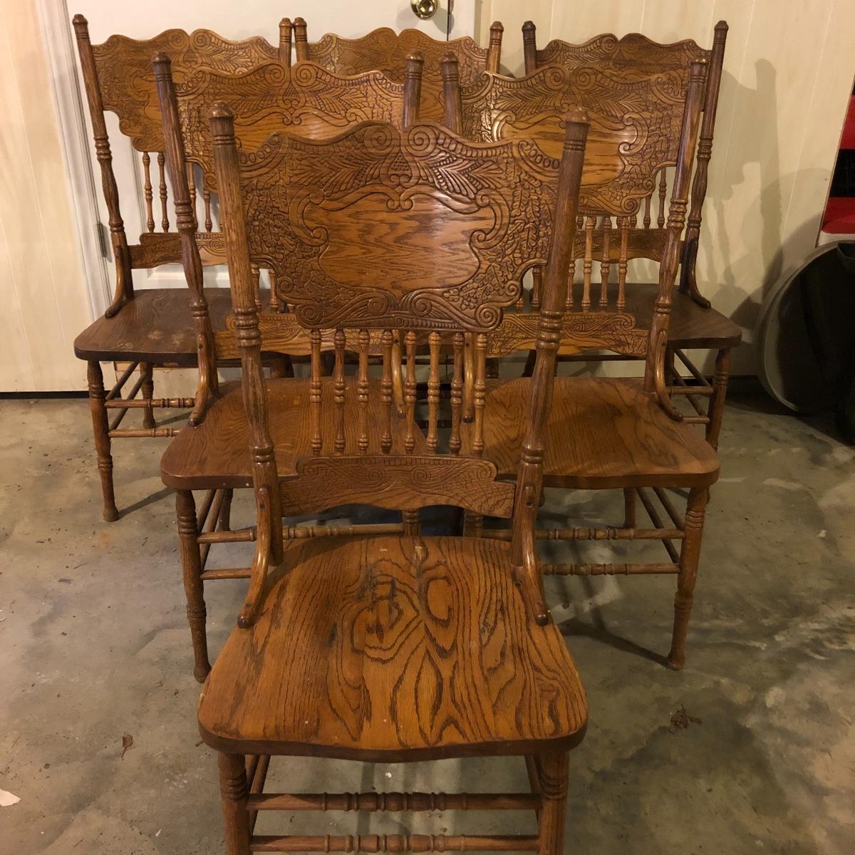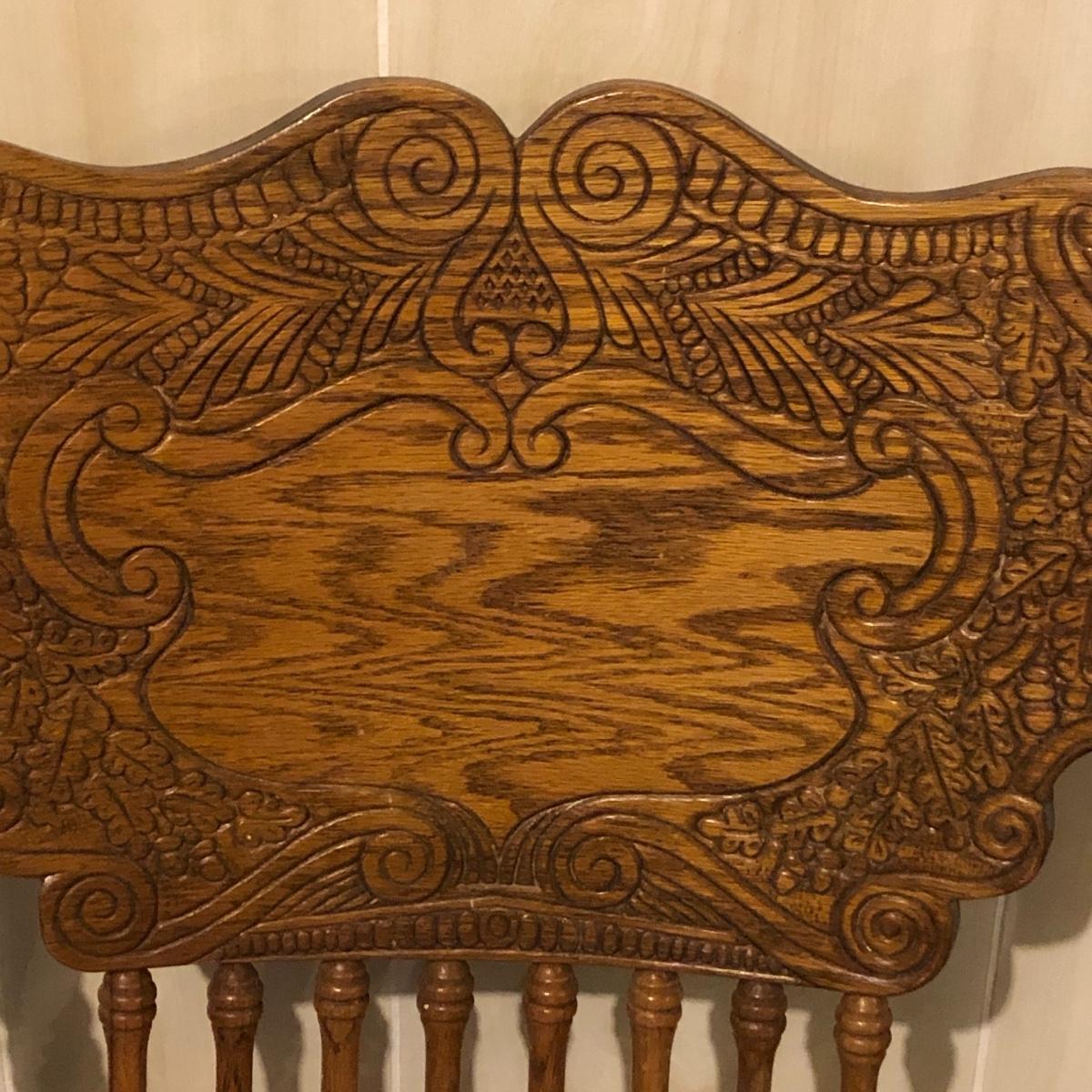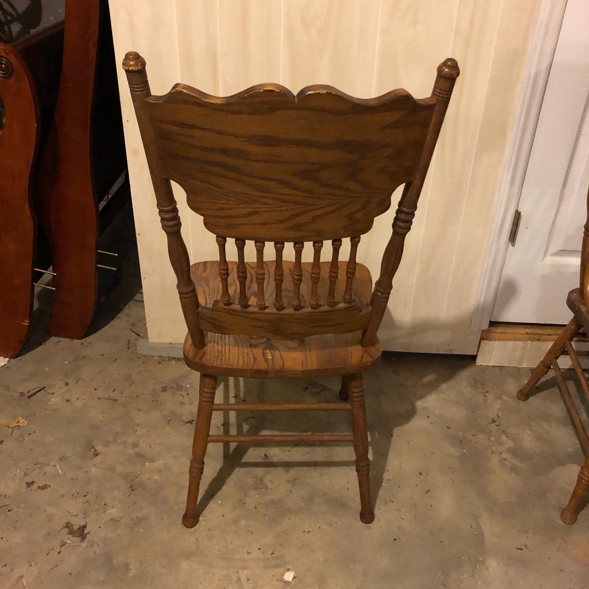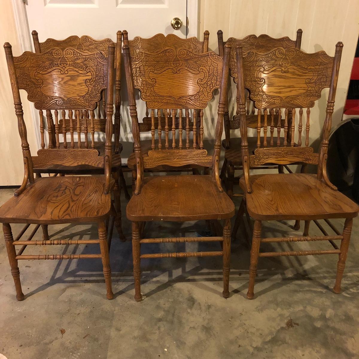This matching set of six solid wood chairs match the dining table in Lot 118. A lot of details can be found in these beautiful chairs with intricate carvings above and below the partial spindle backs. One chair has some scuff marks on the seat that some sanding would soon fix.