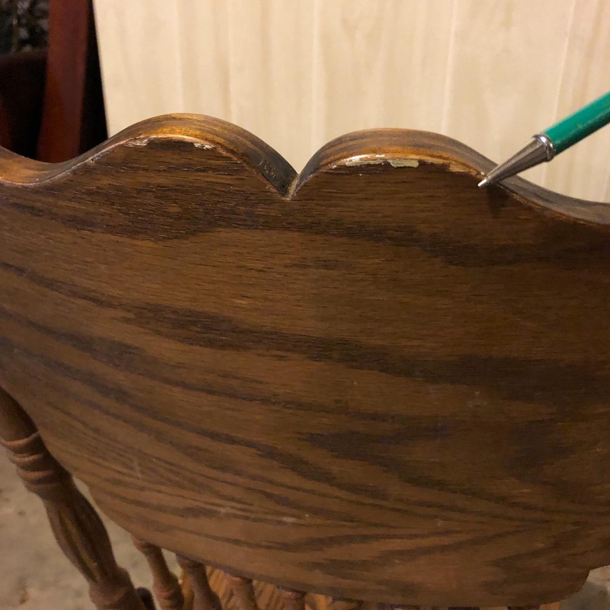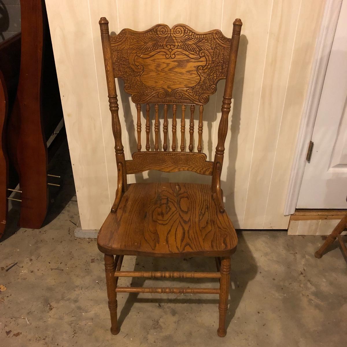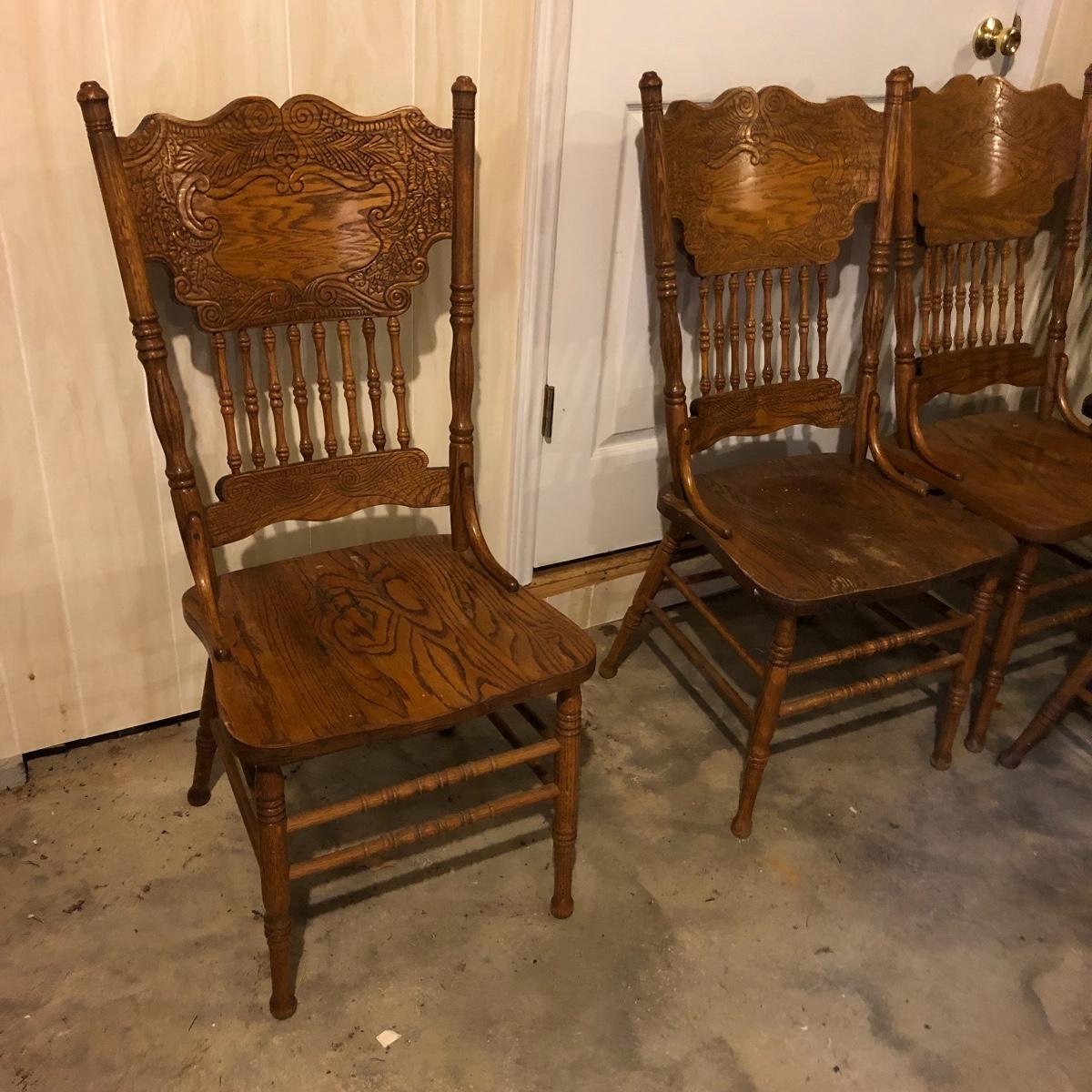 This matching set of six solid wood chairs match the dining table in Lot 118. A lot of details can be found in these beautiful chairs with intricate carvings above and below the partial spindle backs. One chair has some scuff marks on the seat that some sanding would soon fix.