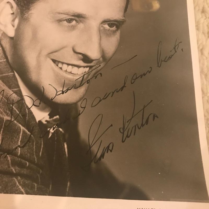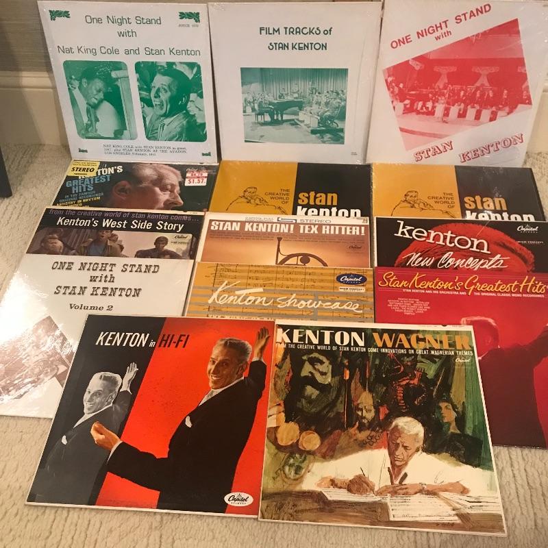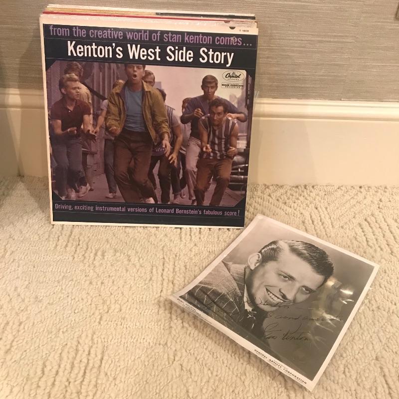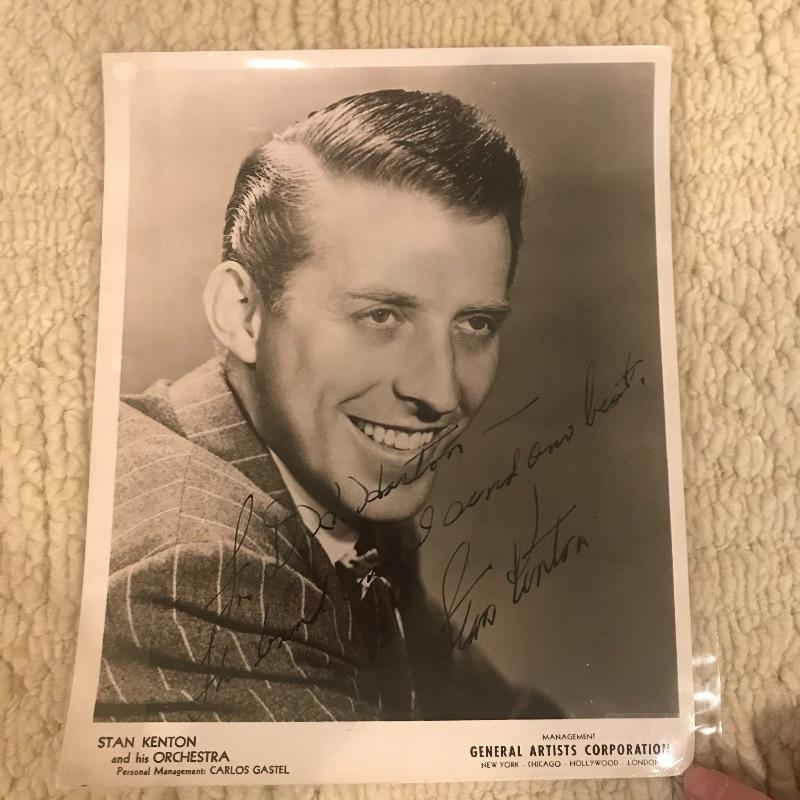 Autographed photo of Stan Kenton in plastic sleeve along with LP collection of his work. No COA for autograph. Total of fourteen LPs. Shipping available.
