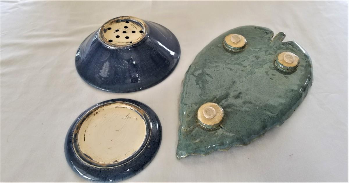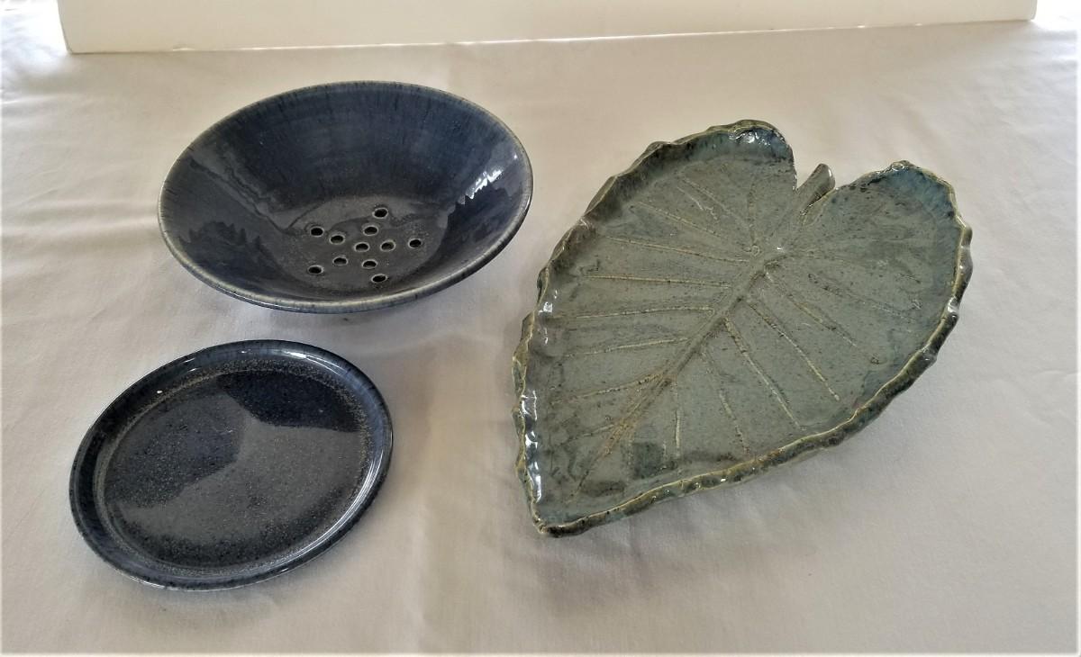 2 pieces of studio pottery - leaf platter and a 2-piece berry strainer (strainer and underplate). Well executed, nice glaze. Both are signed with an indistinguishable signature. Platter is 14" long, 8.5" across - berry bowl is 8.25" across, 2.75" tall. Good condition.