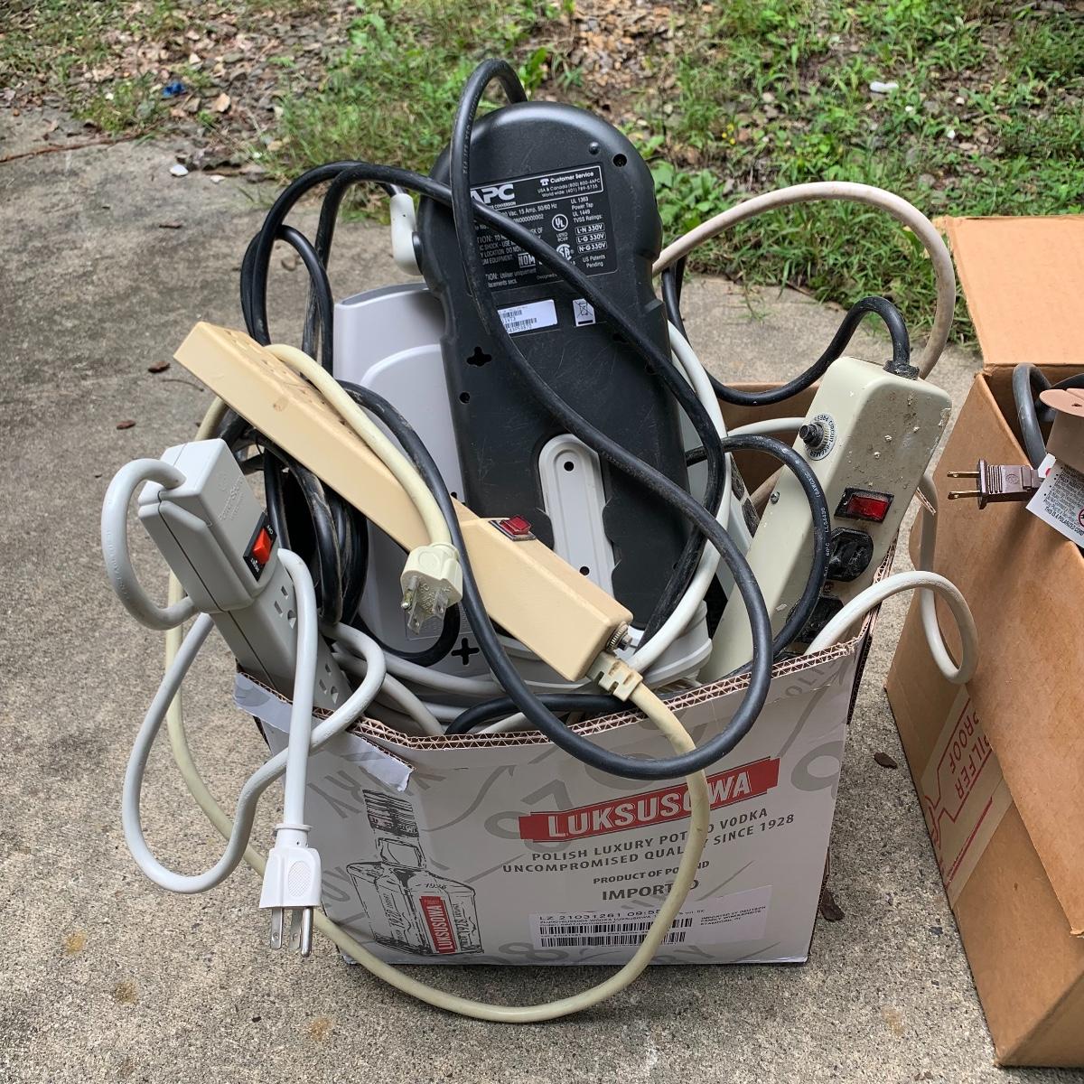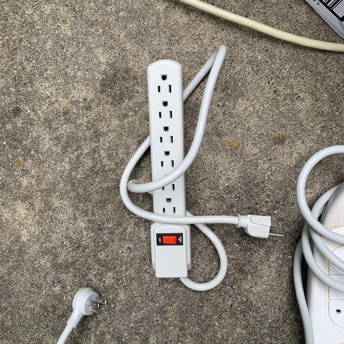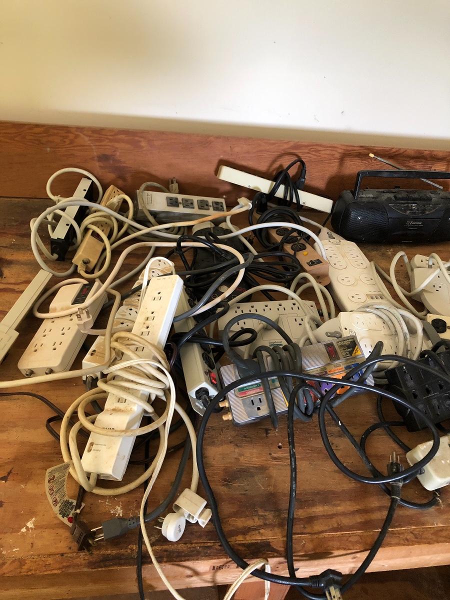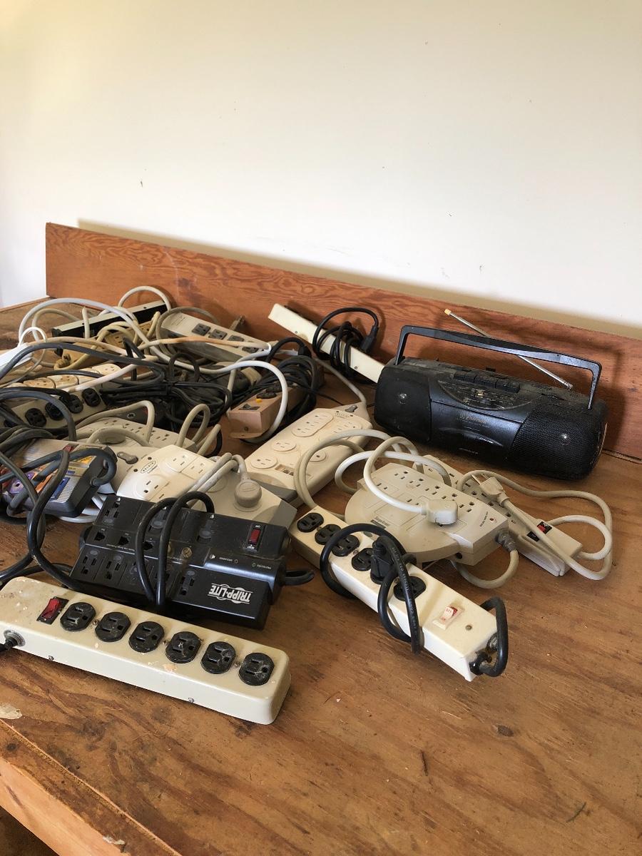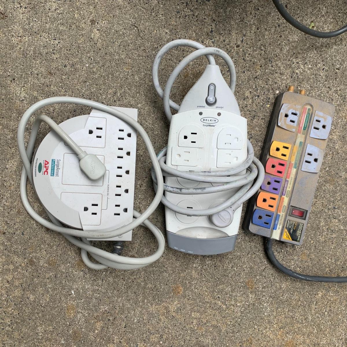 Do you need surge protection for your home, office, or shop? This lot includes twenty power strips, some with surge protection. Brands include Master Power, Belkin, and APC. There is also an Emerson portable am/fm cassette player in working condition. Local pickup only.