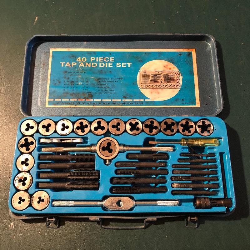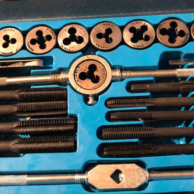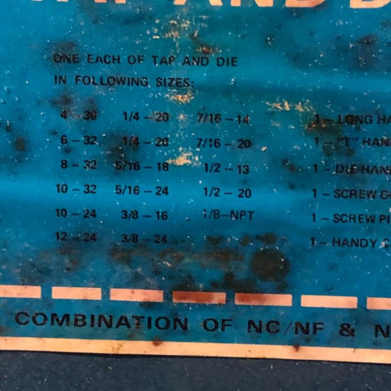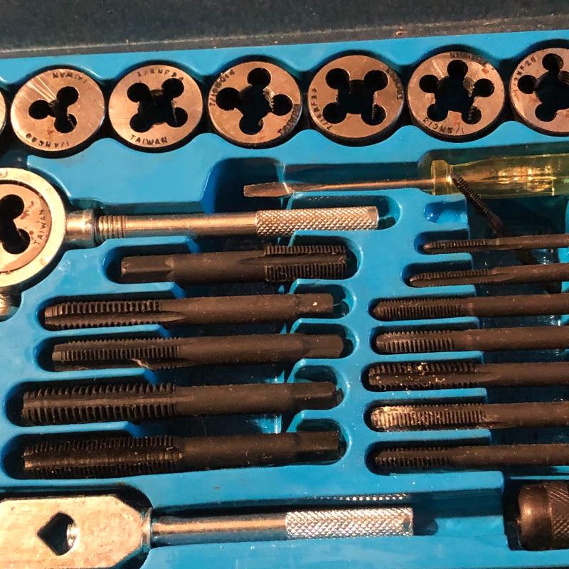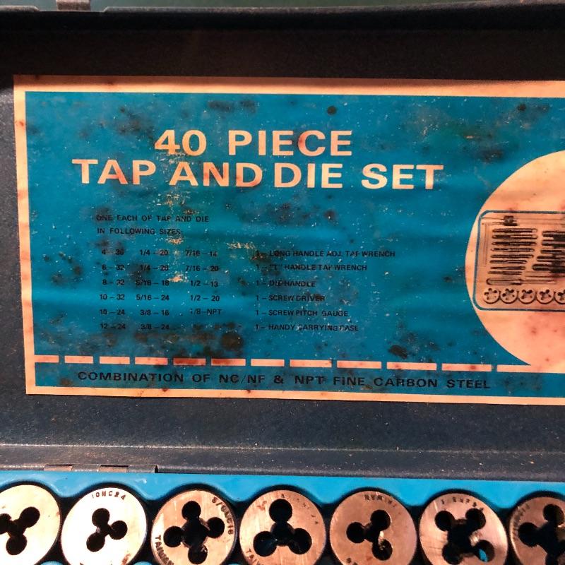 All pieces are included in this forty piece “tap and die set.” A little rusting but seems to be in good working order. Shipping Available.
