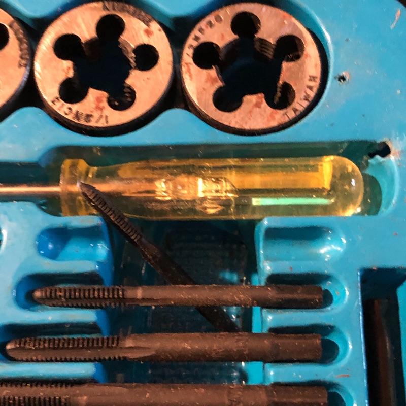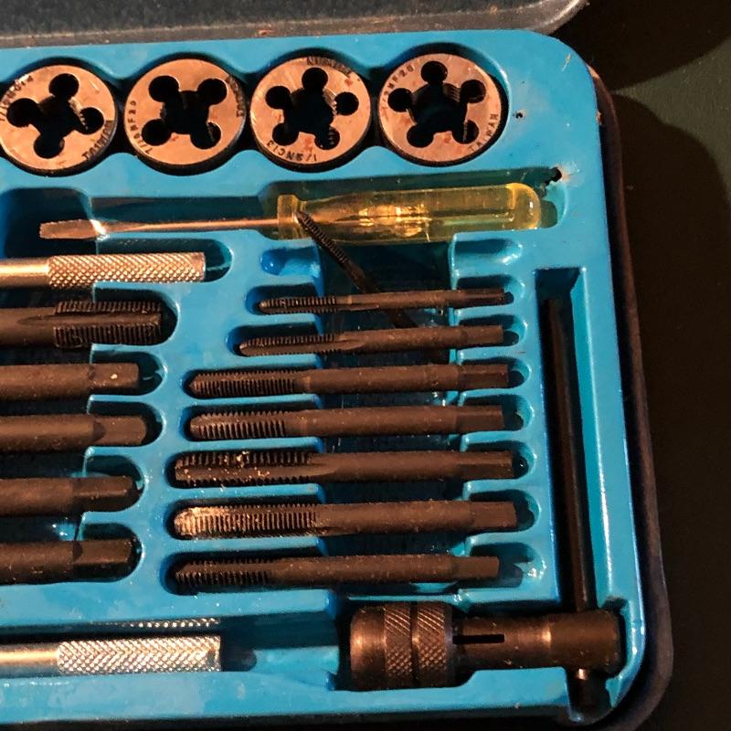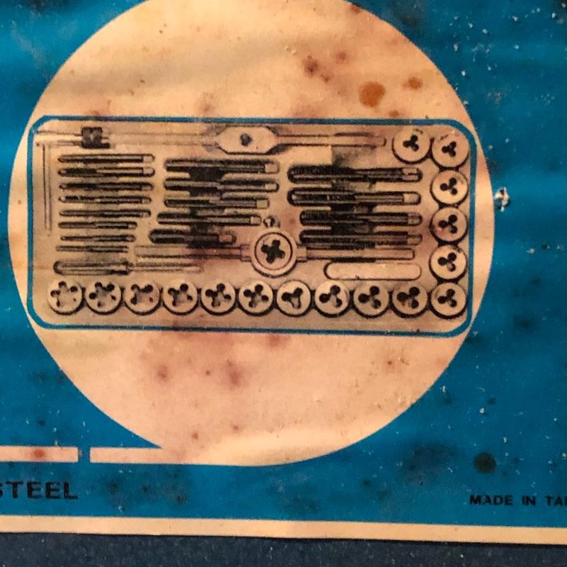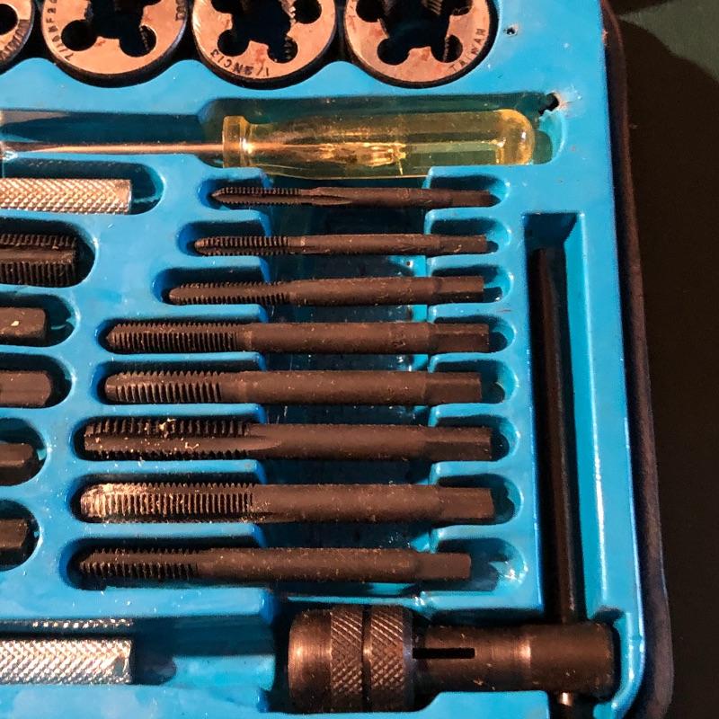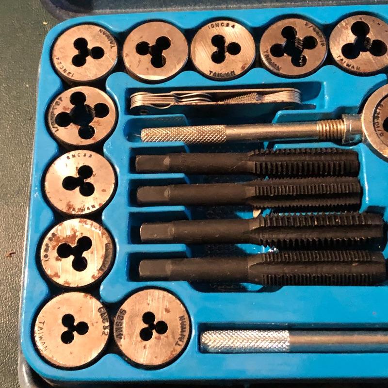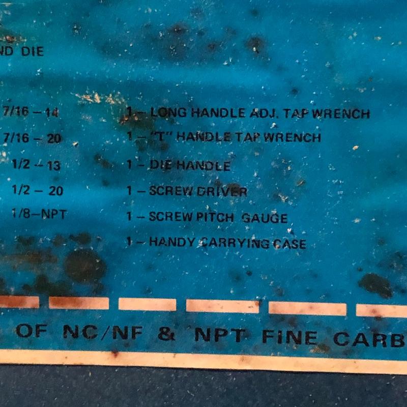 All pieces are included in this forty piece “tap and die set.” A little rusting but seems to be in good working order. Shipping Available.