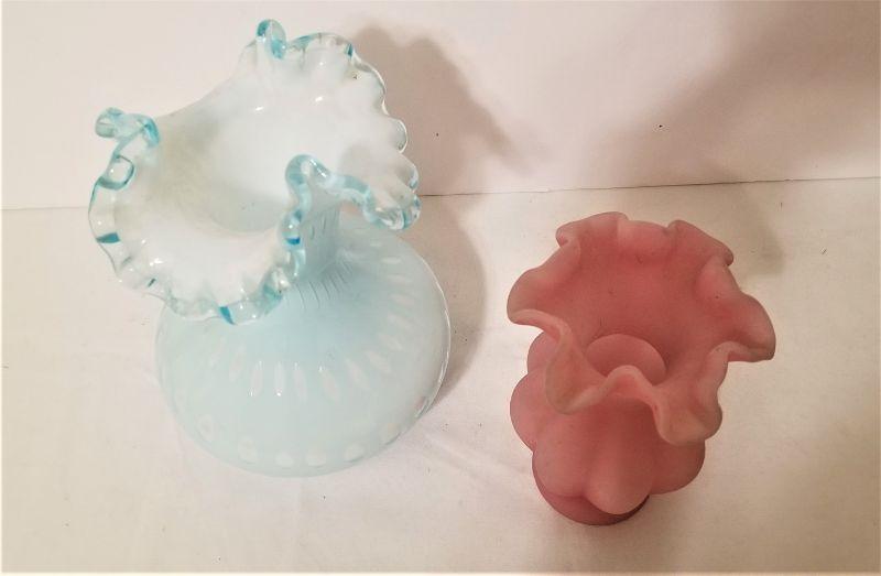 Two pretty vintage Fenton glass vases - the Fenton factory closed for good several years ago, so they aren't making any more! Pink one has the "satin" finish. Good condition. Larger is 8" tall. Smaller is 4" tall.