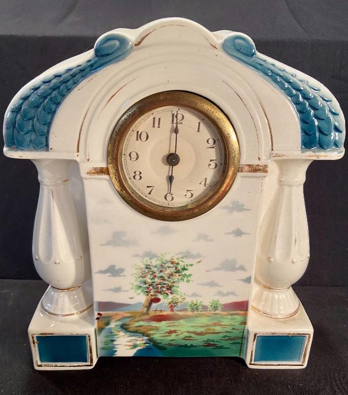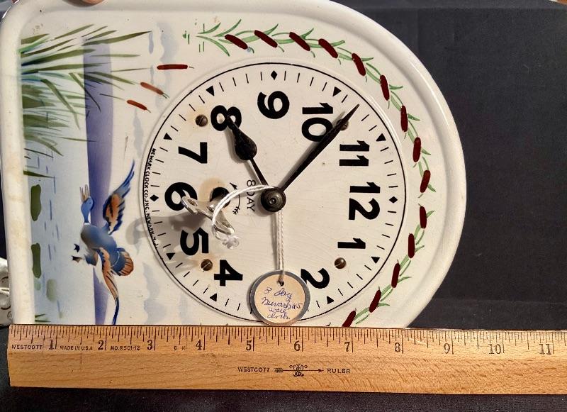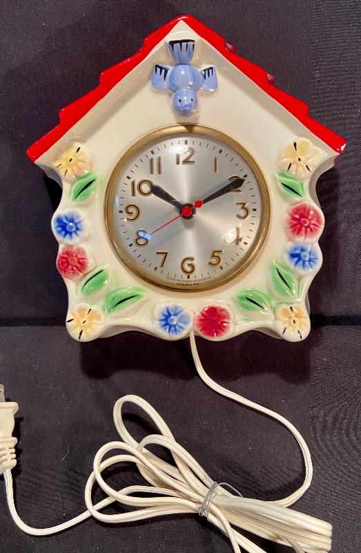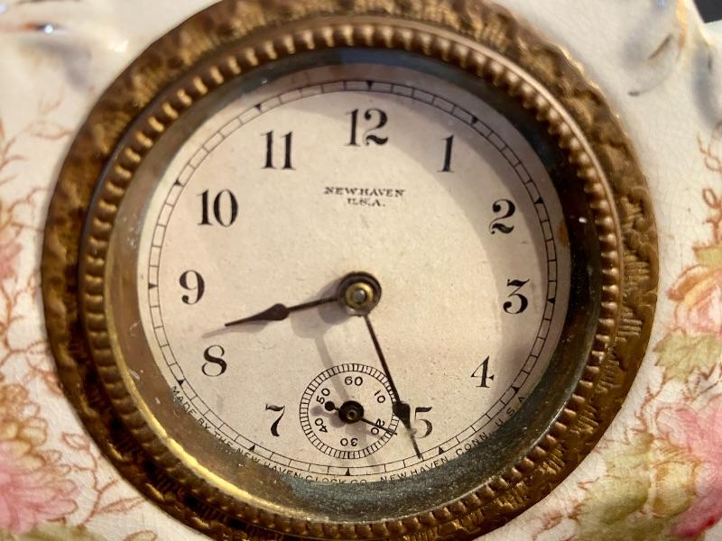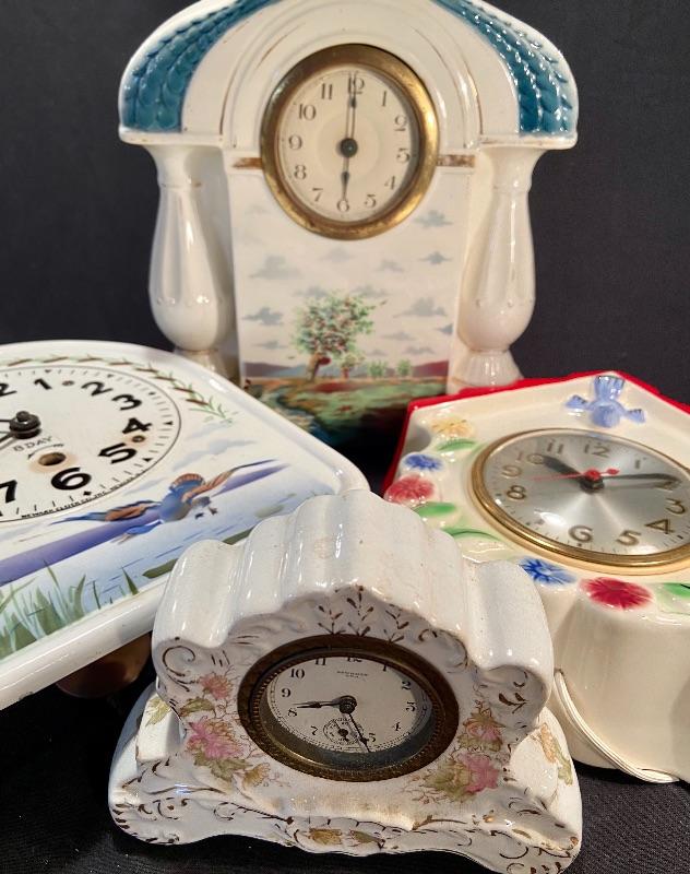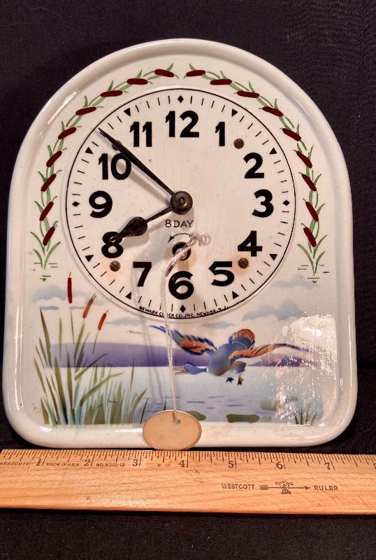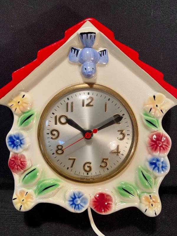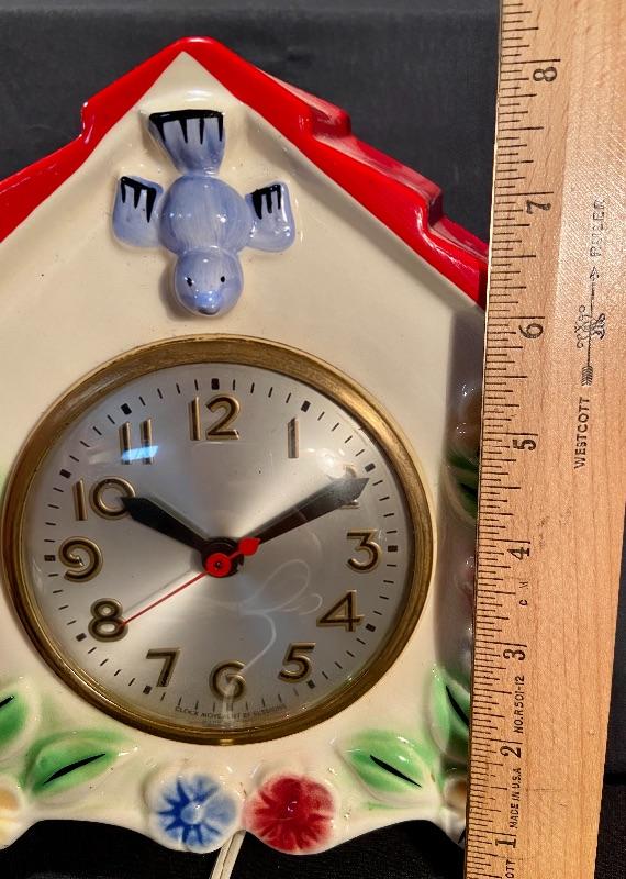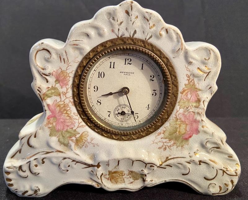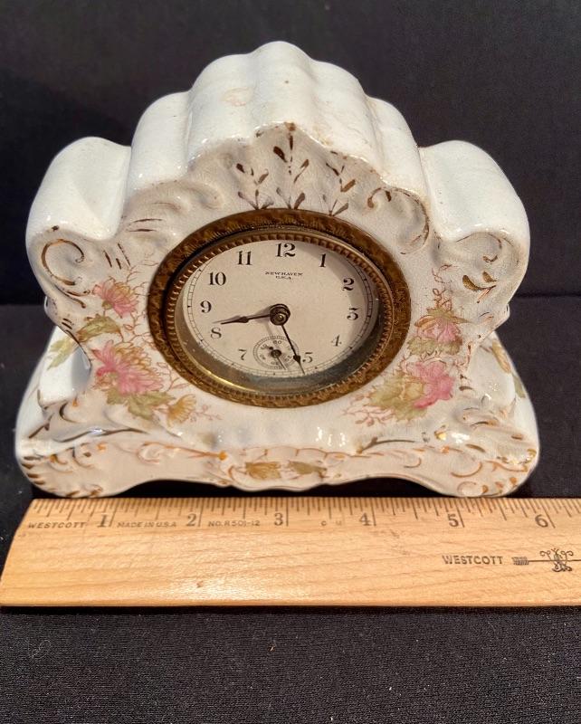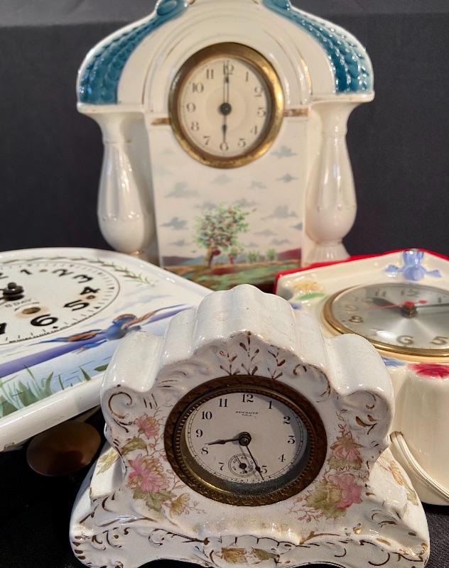 Vintage New Haven small mantel porcelain clock in working condition, Newark Clock Co 8 Days a week clock in working condition, made in Germany porcelain clock. Please see pictures for size and details, and Sessions ceramic electric birdhouse clock in working condition . MHW Please see all pictures for content of the lot, condition of the lot, and measurements if taken. Pictures are the best representation of the items listed and items are untested unless indicated in description. Thank you for looking and have fun bidding!