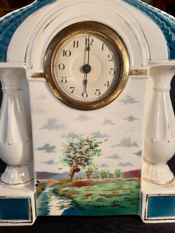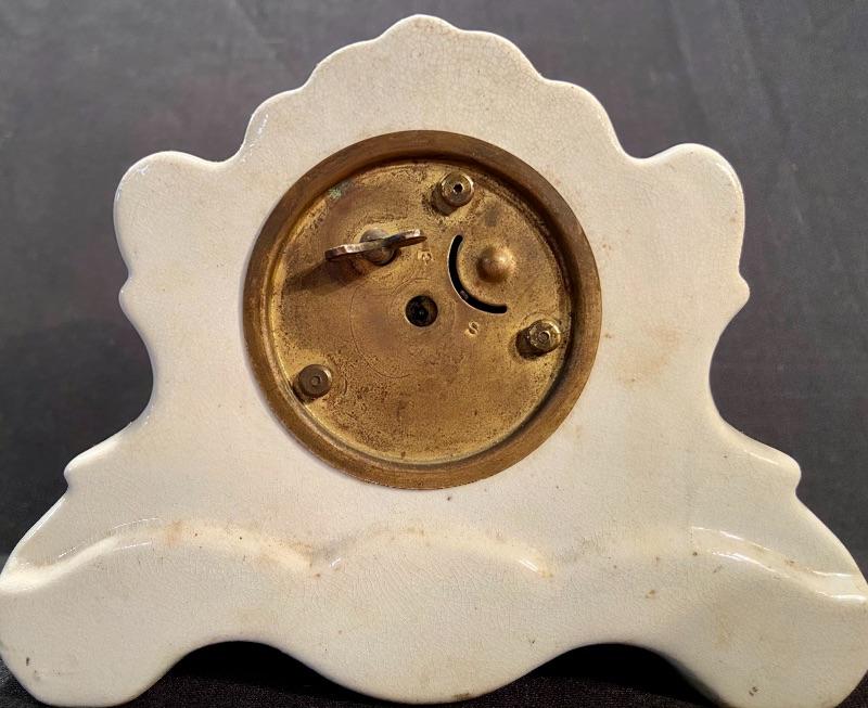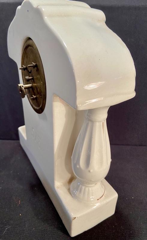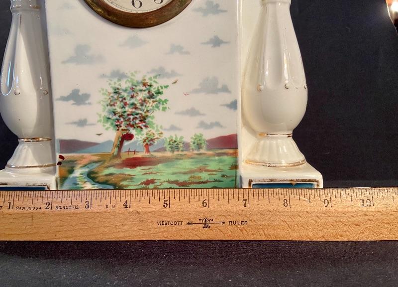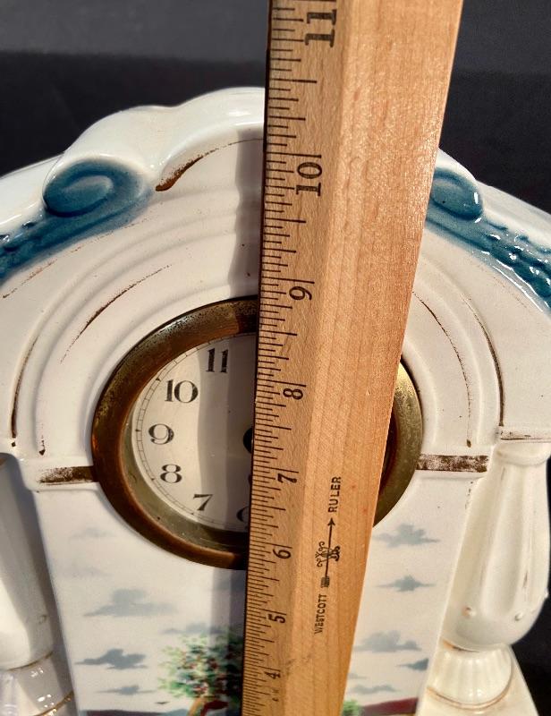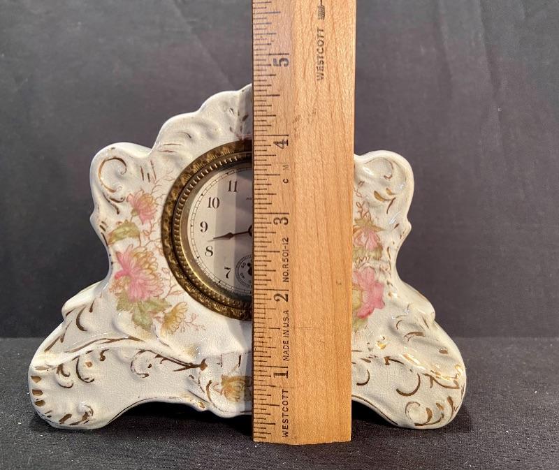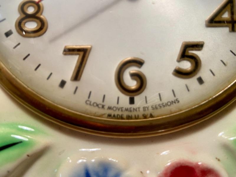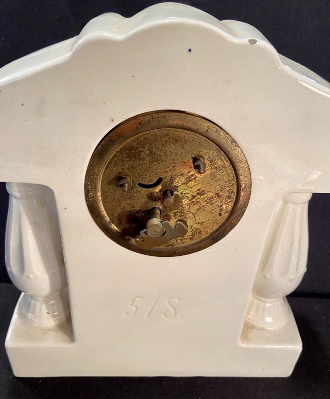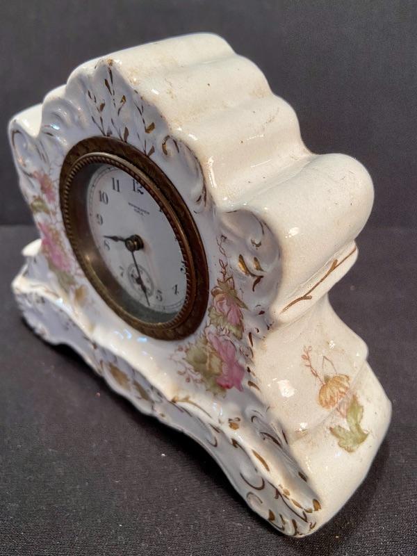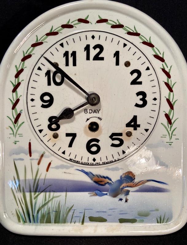 Vintage New Haven small mantel porcelain clock in working condition, Newark Clock Co 8 Days a week clock in working condition, made in Germany porcelain clock. Please see pictures for size and details, and Sessions ceramic electric birdhouse clock in working condition . MHW Please see all pictures for content of the lot, condition of the lot, and measurements if taken. Pictures are the best representation of the items listed and items are untested unless indicated in description. Thank you for looking and have fun bidding!