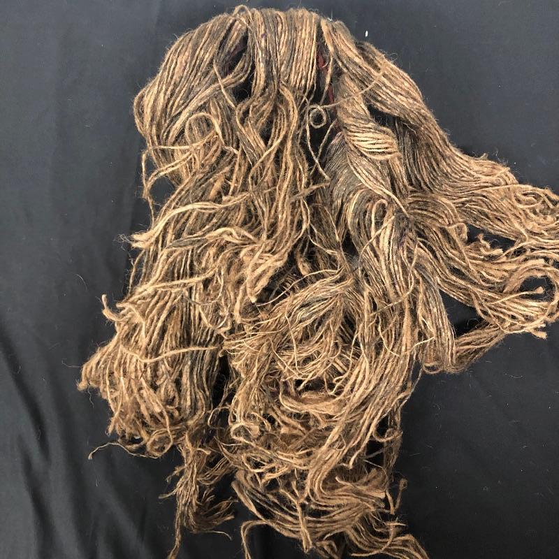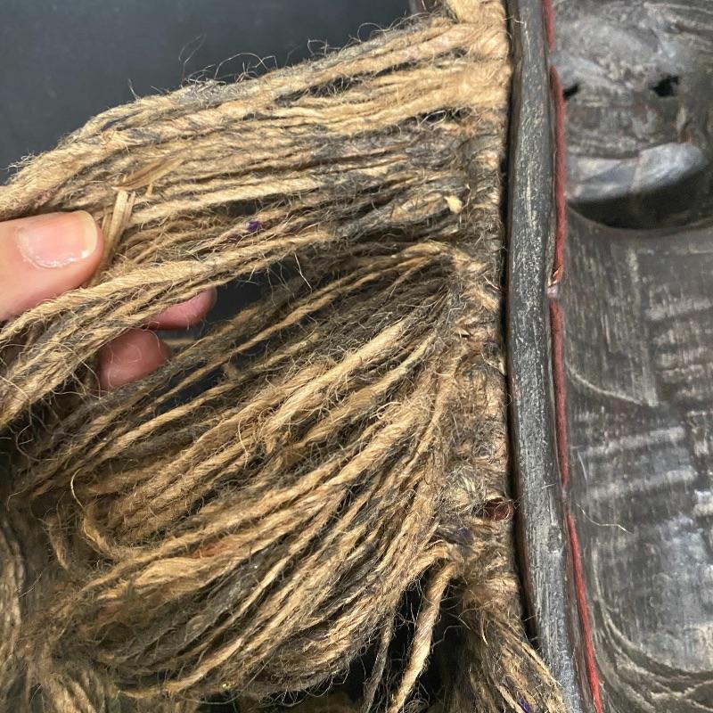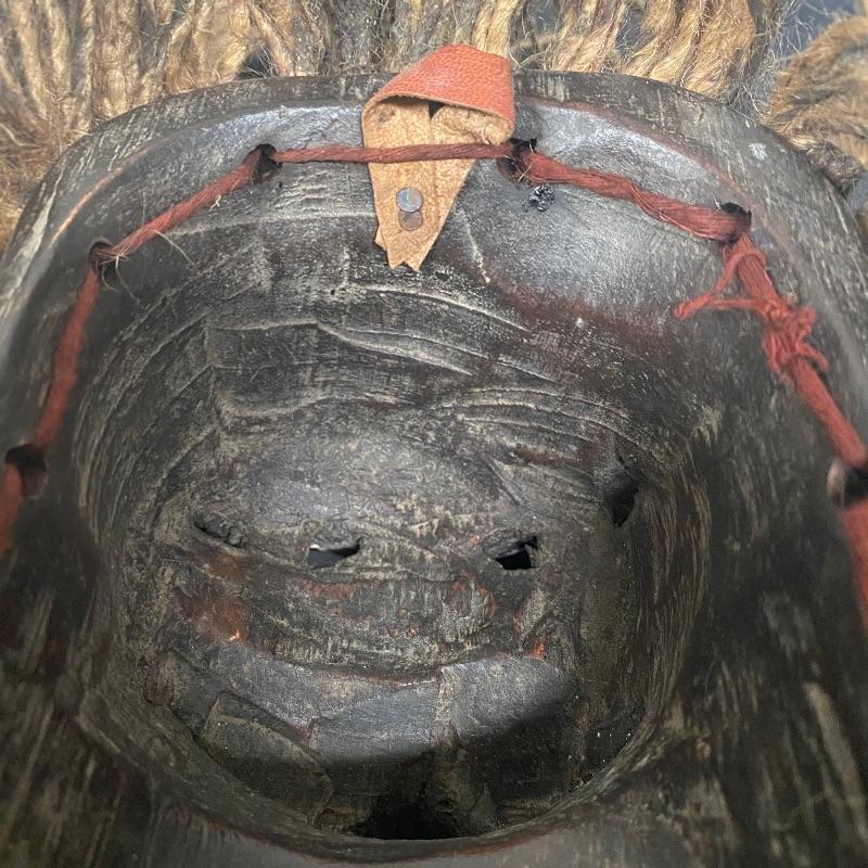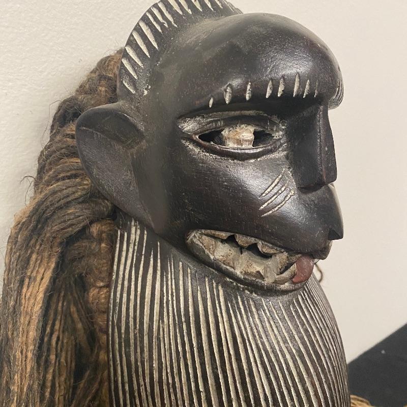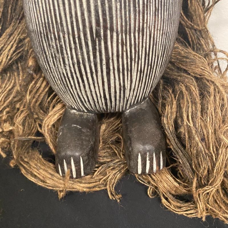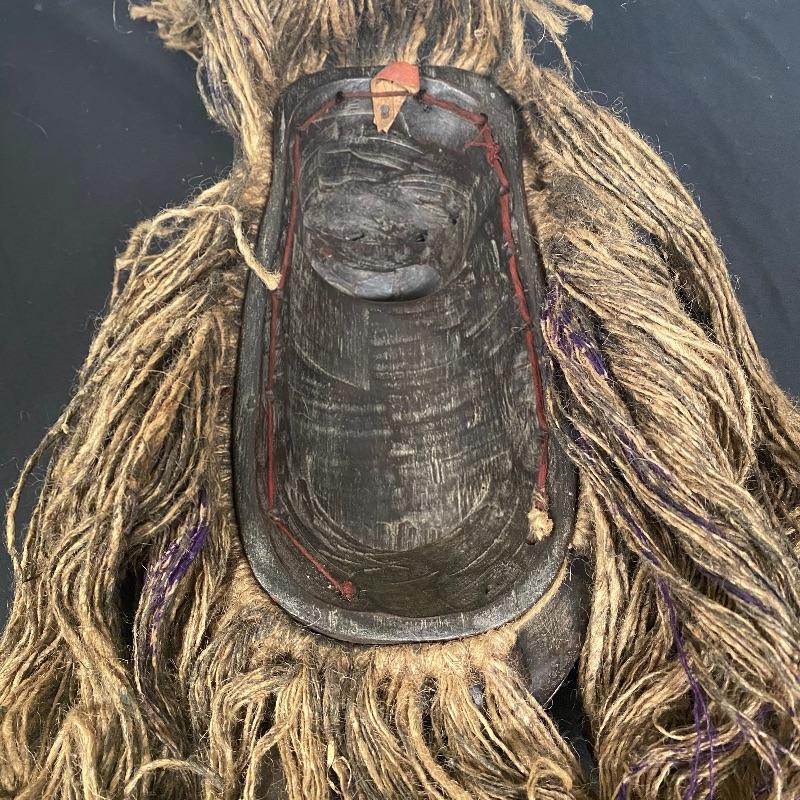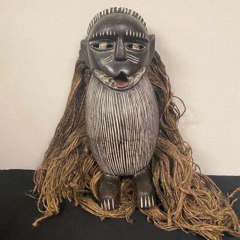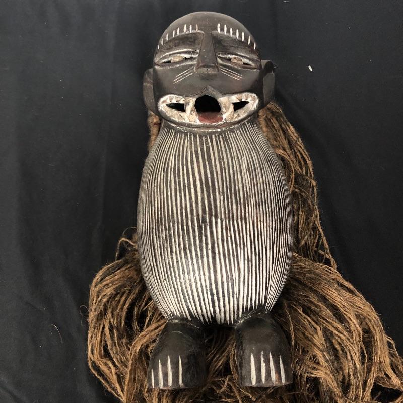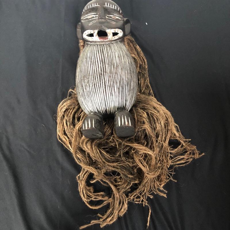This mask (7” x 14”) appears to be a small animal with hair attached to it. It has carved lines on the abdomen that seem to be painted white. It also has carved facial features that are painted white.