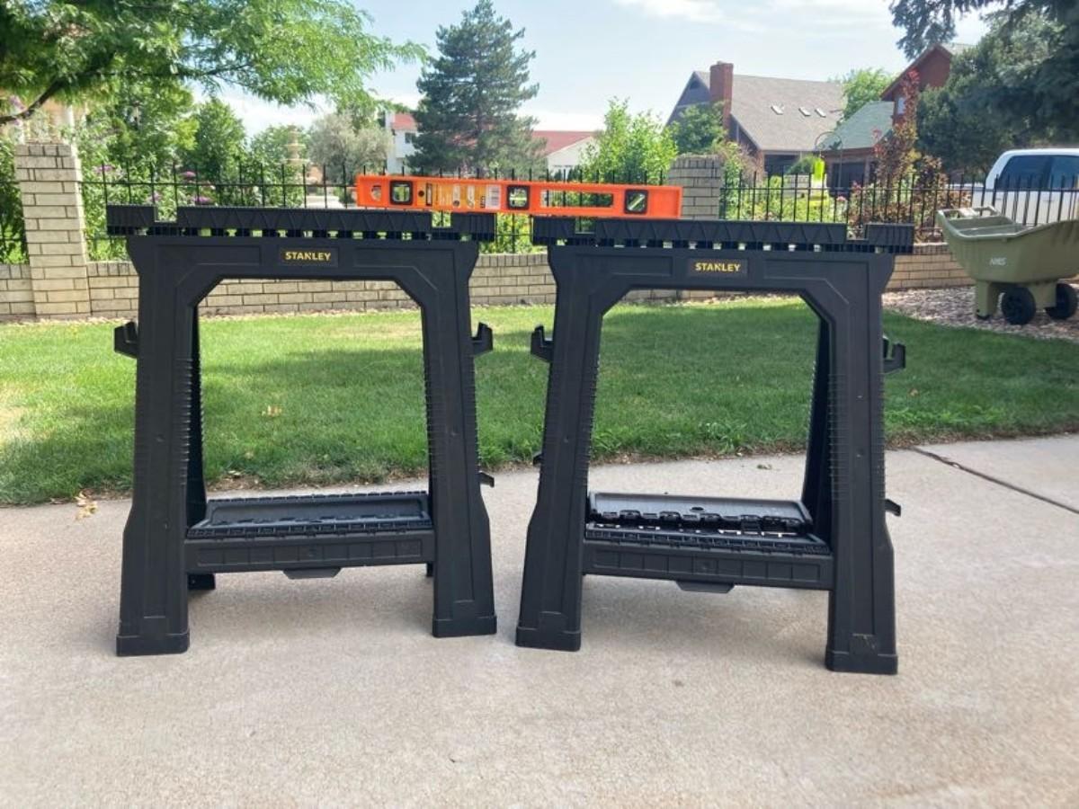 LOT 175  PAIR OF FOLDING SAW HORSES AND A LEVEL