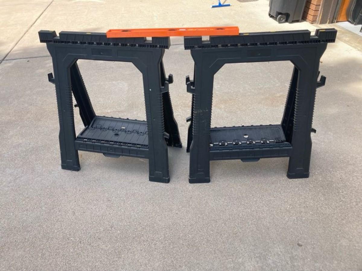 LOT 175 PAIR OF FOLDING SAW HORSES AND A LEVEL