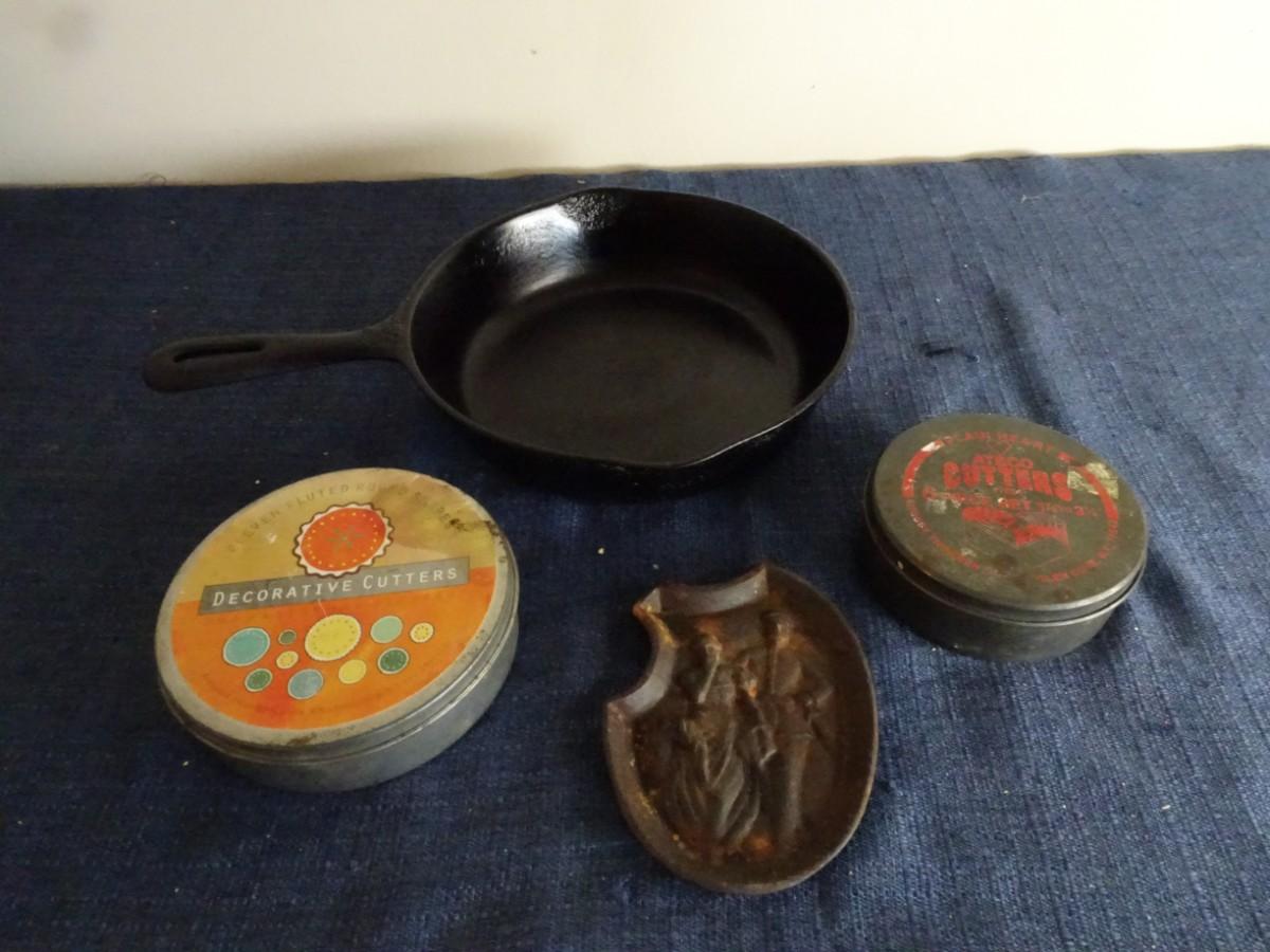 VINTAGE BRASS ASHTRAY AND CAST IRON PAN