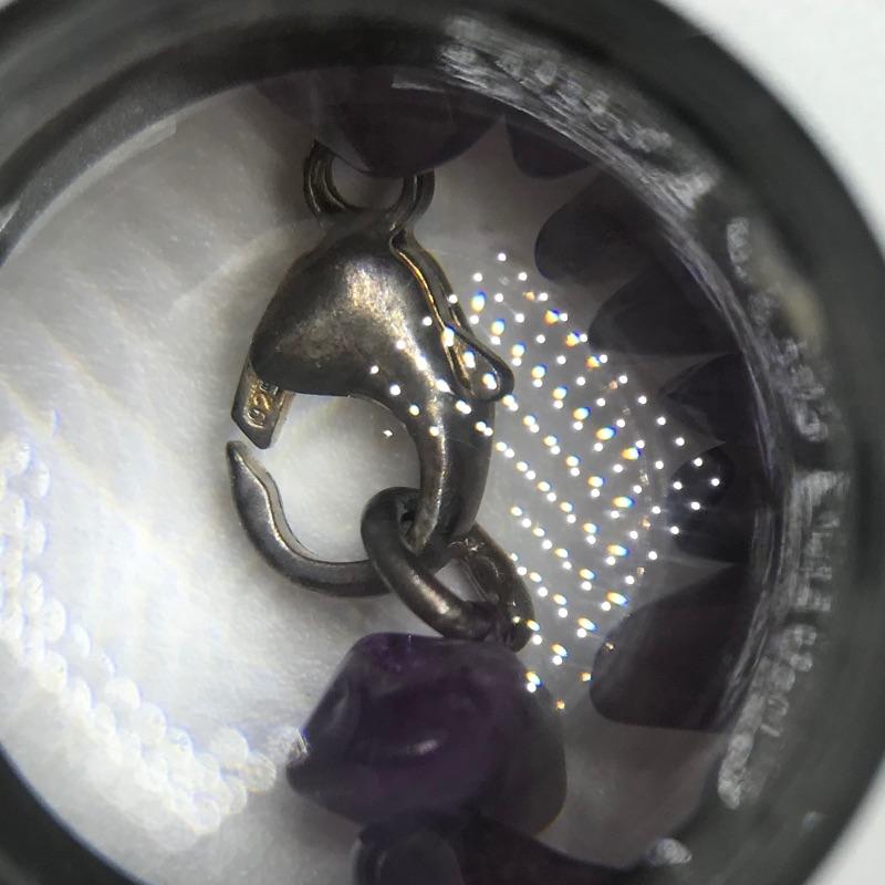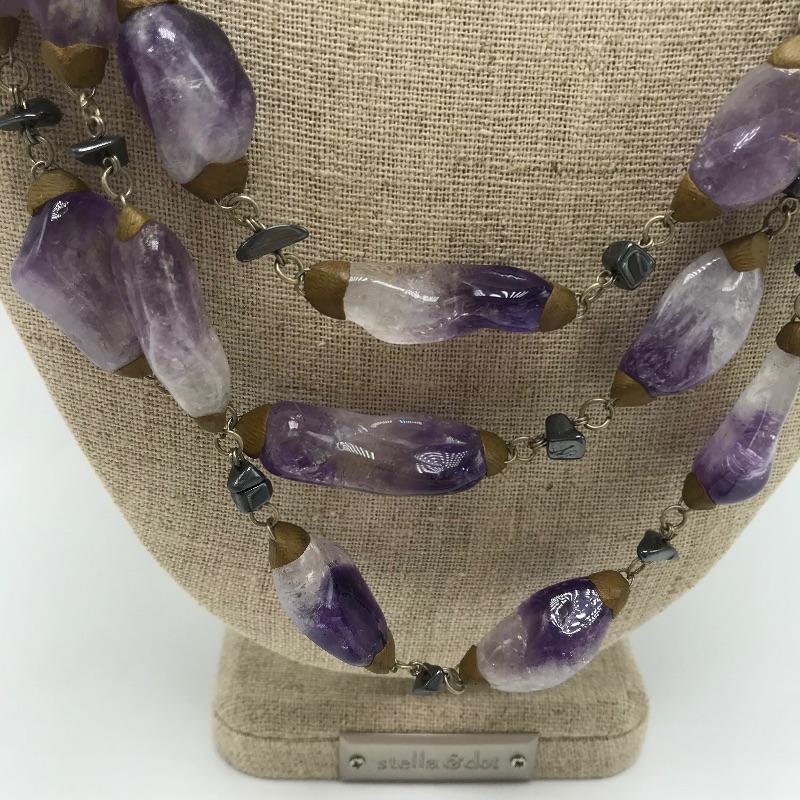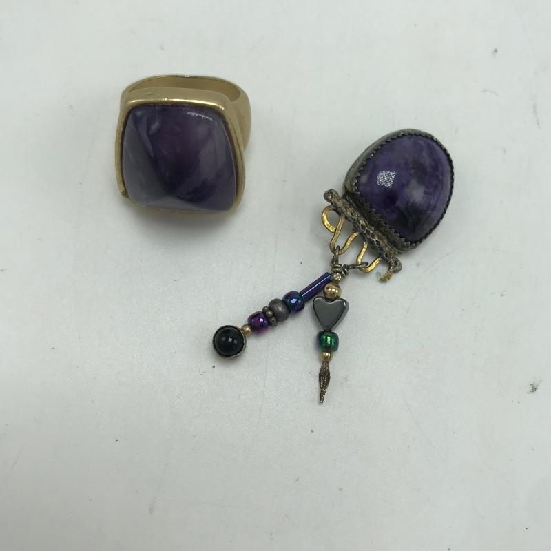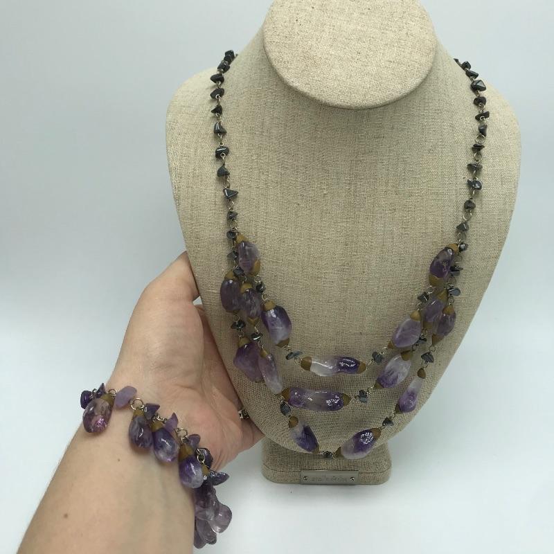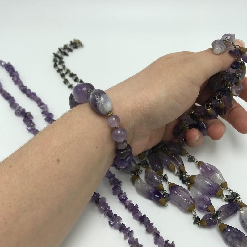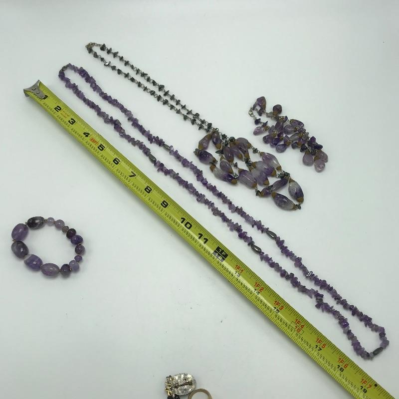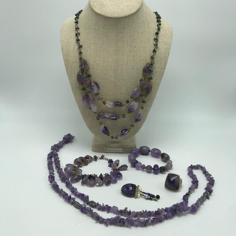 Beautiful pieces that are a purple amethyst color. One necklace and bracelet set each have S hook clasps. The other bracelet is a stretch bracelet. The long necklace has 925 stamped on its lobster clasp. Lastly a pin and ring, both do not appear to have markings. Can not verify which, if any, are authentic amethyst stones.