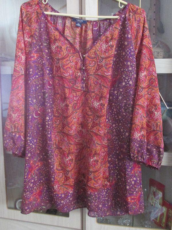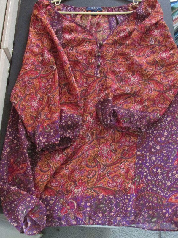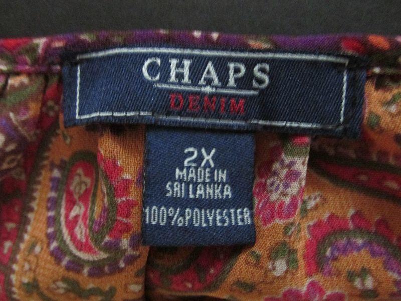 Multicolored patterned Chaps long sleeve blouse. Size 2X. No significant wear noticed.