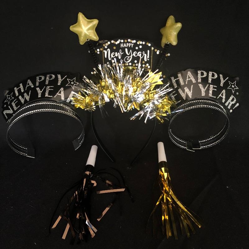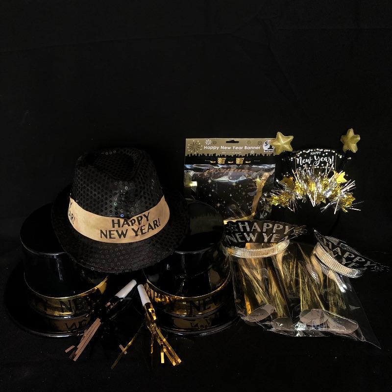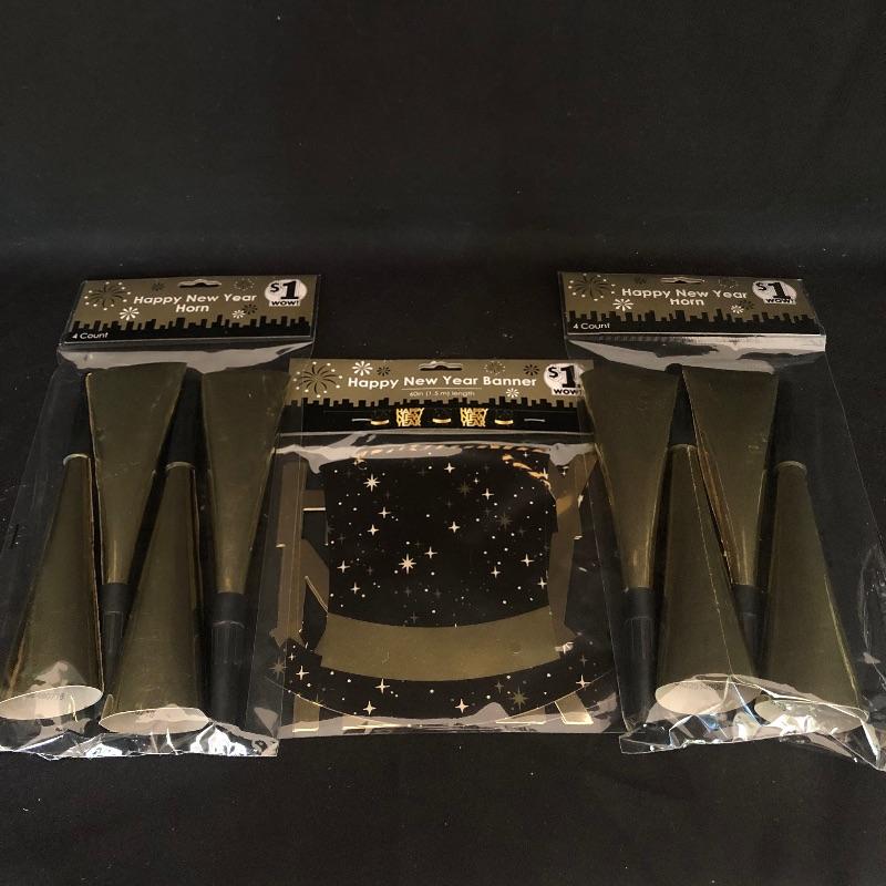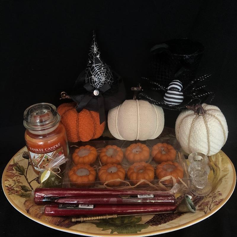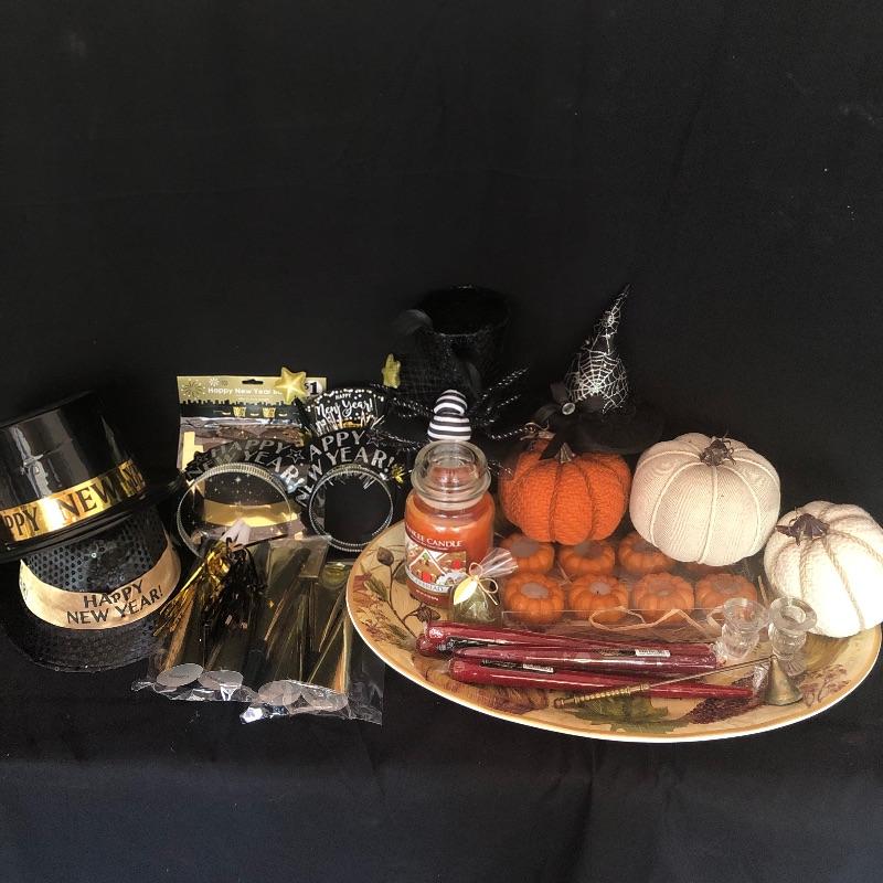 Lot includes an array of holiday decor and accessories. New Years accessories include 3 hats, 2 headbands, a banner, noisemakers, and a light up headband. Also included is a variety of fall decor and accessories including stuffed pumpkins, fall themed candles and candle accessories, 2 witch headbands. One of the New Years headbands has come apart (pictured). Pottery Barn Turkey dish measures 22” x 16” Candle holders measure 2” x 2.5”. Local pick up only.