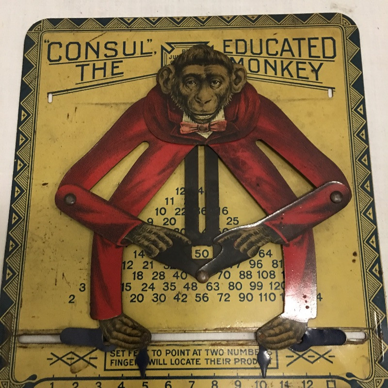 A great little assortment of collectors items here with a Consul The educated monkey tin toy, mechanical multiplication calculator, Starr Coca Cola bottle opener NIB and more. Show your kids how things were done before smartphones and calculators. Consul calculator measures 5.5” x 6”.