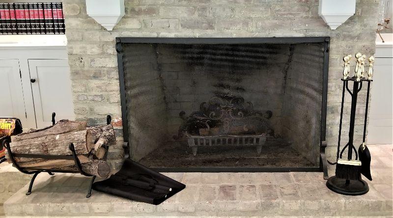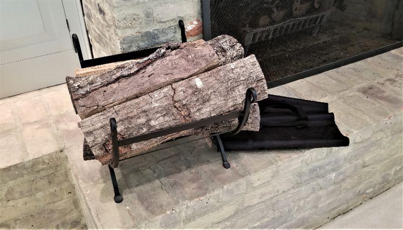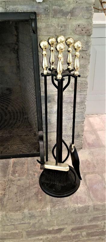 You get all you see here - nice screen, heavy brass-topped tool set, and wrought iron log holder with log carrier. Screen measures 40.5" across, 33 " tall. Tool set has 4 implements and is 30" tall. Log holder is 14" x 20" and 14.5" tall. All in good used condition.