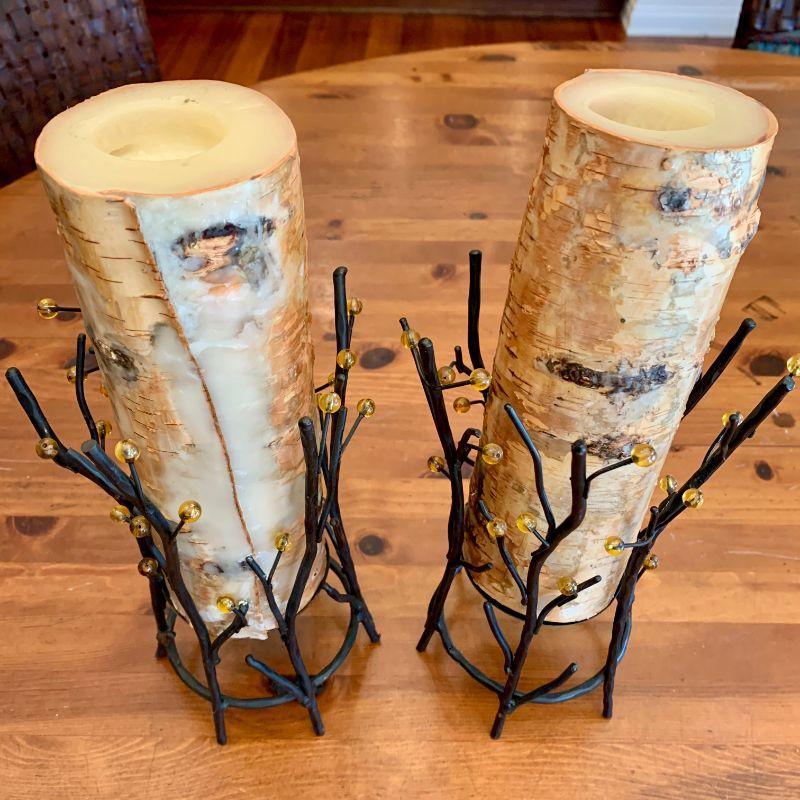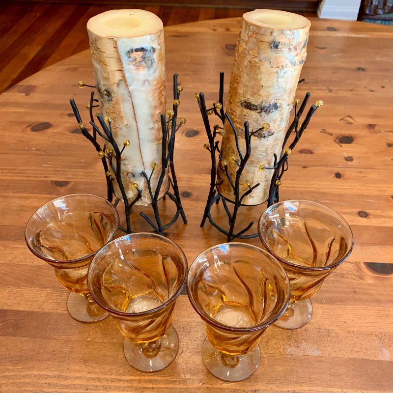 Fun candles look like birch logs in metal twig candle holders. Also 4 footed amber color water glasses.