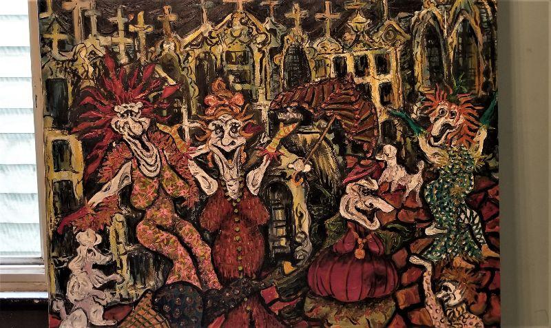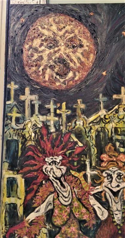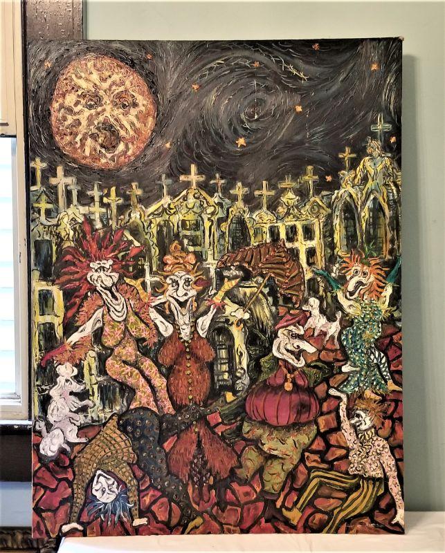 This is a large unframed oil on canvas that basically depicts a wild bacchanal in a New Orleans cemetery with the Man in the Moon lookin on in horror - hahahahah. Measures 3 feet x 4" unframed.