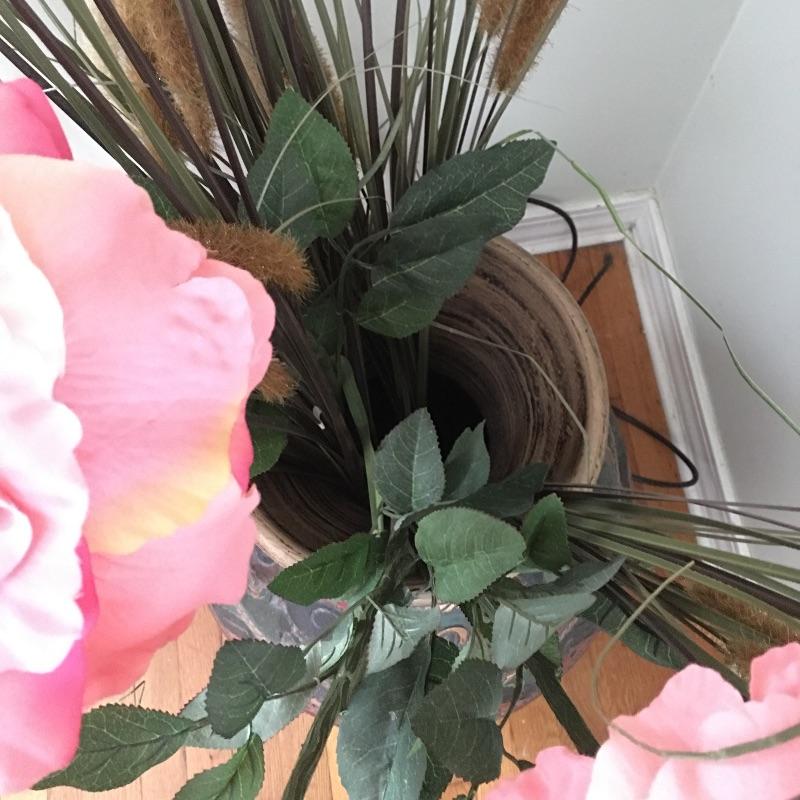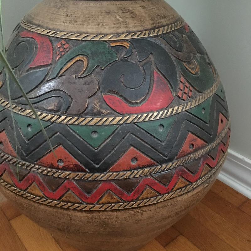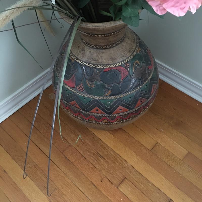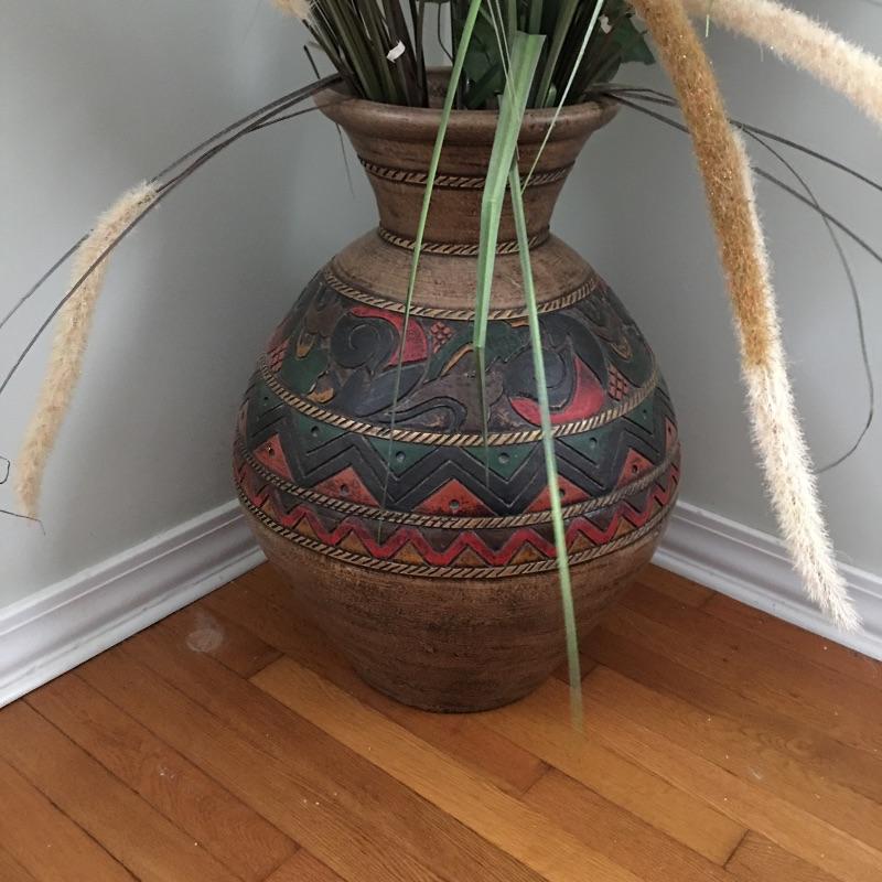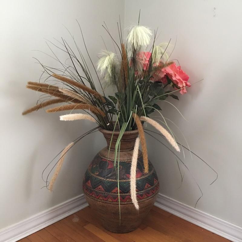 Large pot with geometric designs with faux flowers and greenery. You won’t need a green thumb to keep these flowers looking good. Great looking pot that would even look great with nothing in it. Pot measures 18”D x 24” tall.