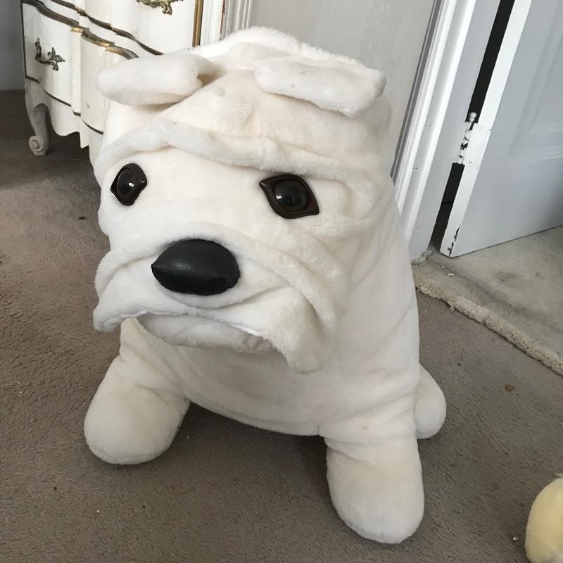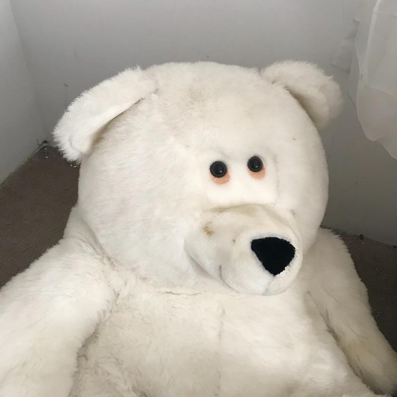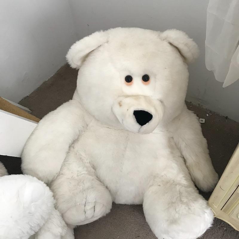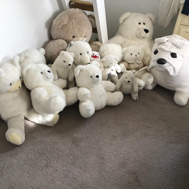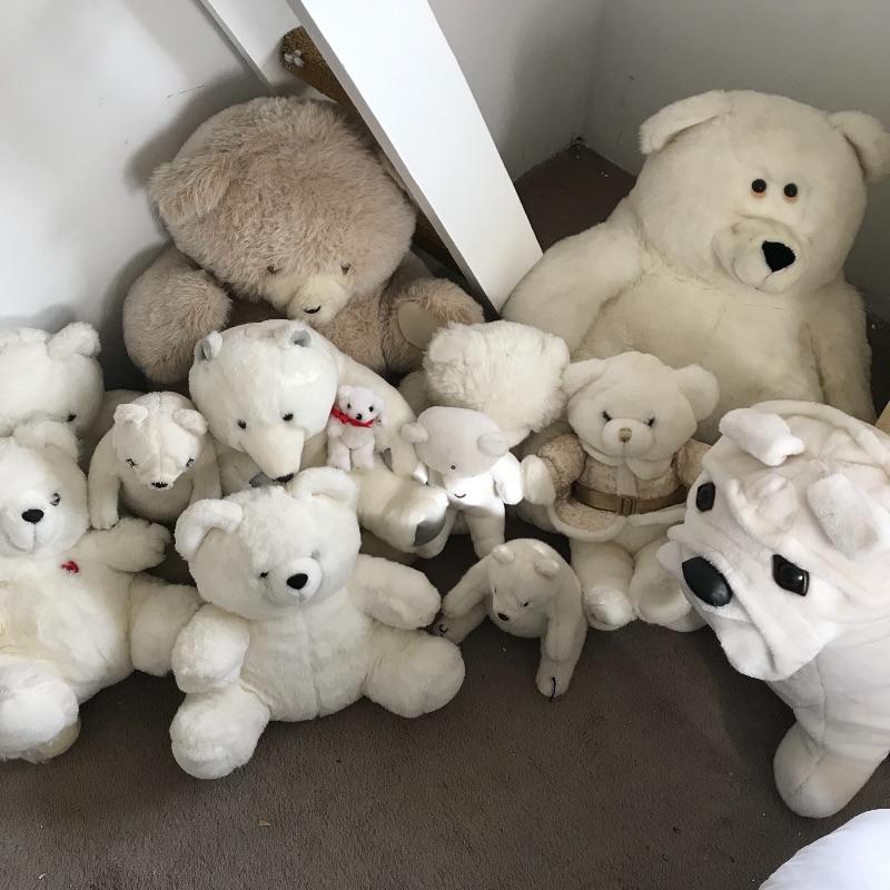 12 white stuffed bears of different sizes and shapes and one large white stuffed bulldog. This collection has a few repeats and some are unique to the collection. The largest is 30” x16” x24”. A bit dusty but all are in good condition. Local pick up only.