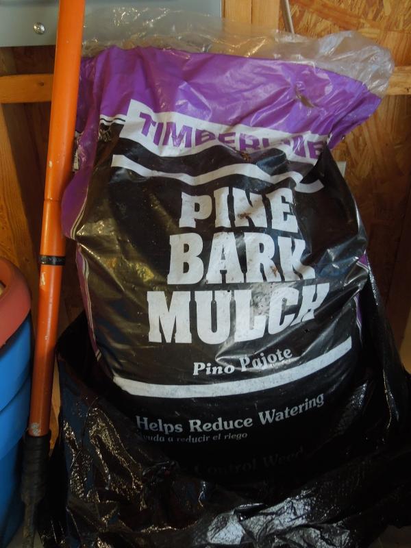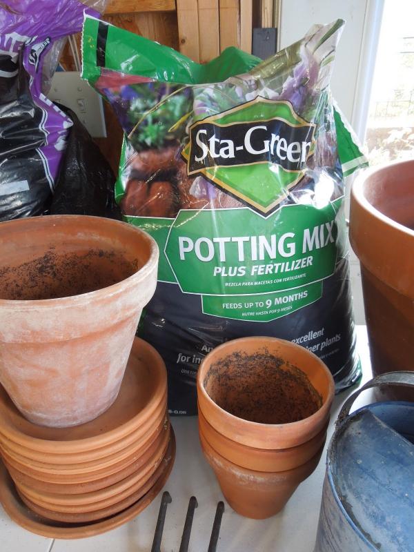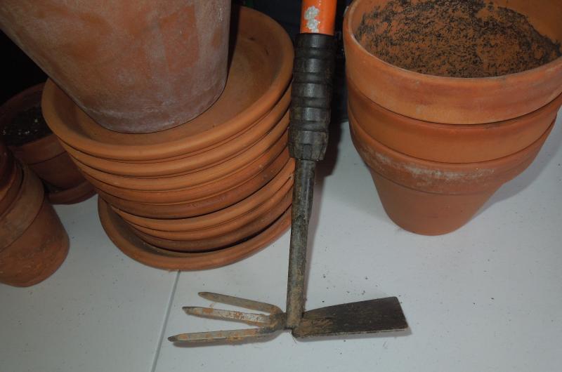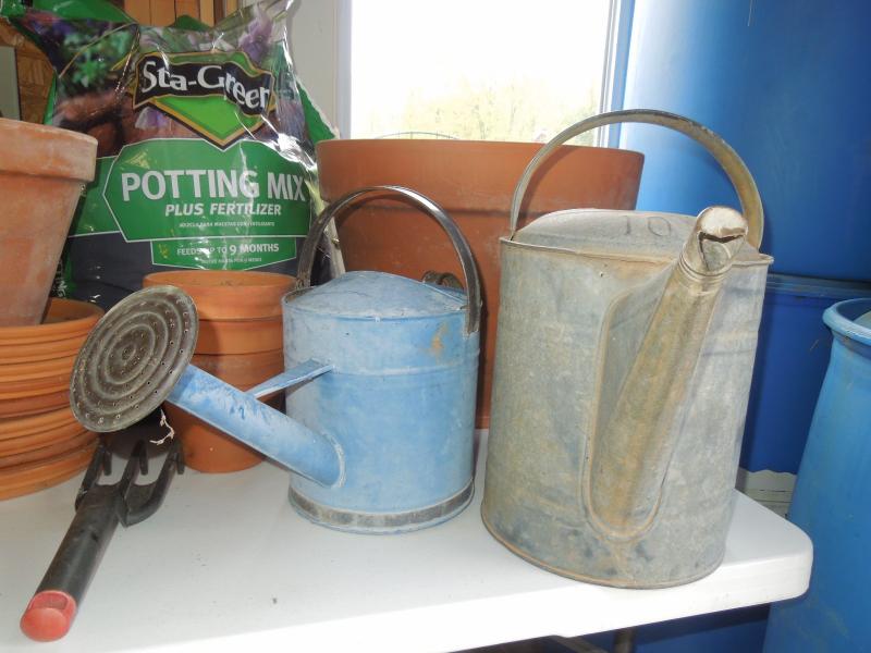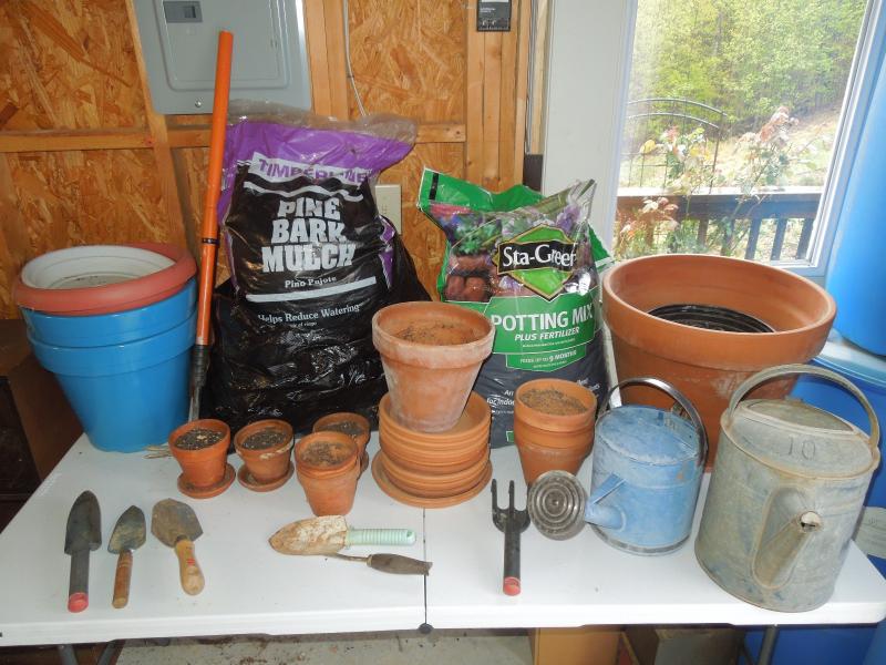 Unopened pine bark mulch; Potting Mix; 2 galvanized metal watering cans; 4 hand trowels; 1 digging tool; 1 double hoe with long handle; terra cotta pots and saucers; pair of Dawgs Size Eur 44 rubber clogs, and more.