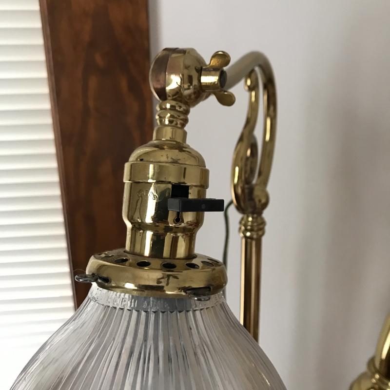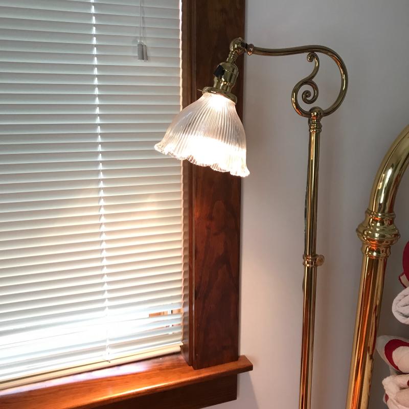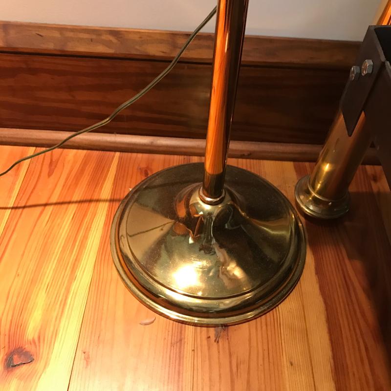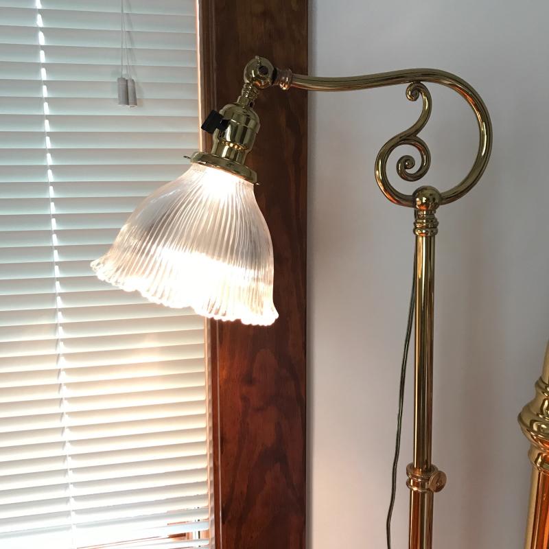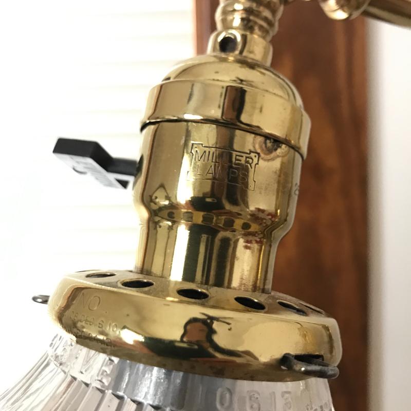 Beautiful antique brass floor lamp made by Miller Lamps. Manufacturer stamp on lamp. Adjustable height. Measures 15”wide at shade. 10” diameter at base. Height adjust from 50.5” to approximately 63”high. No shipping