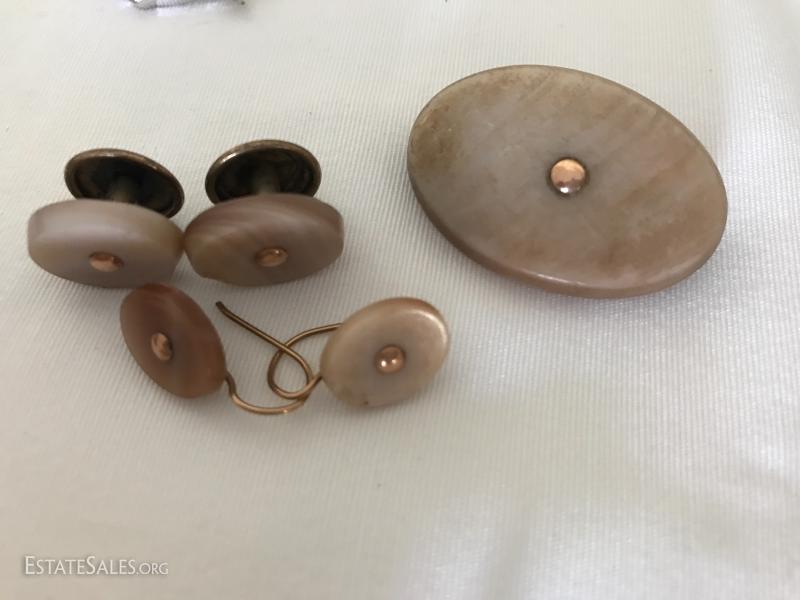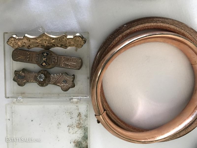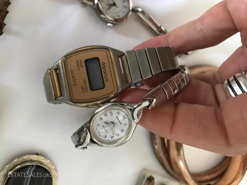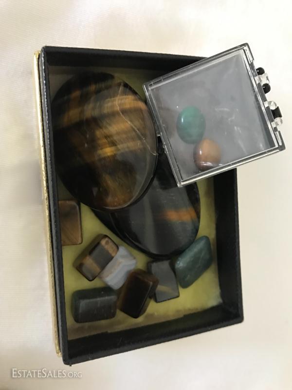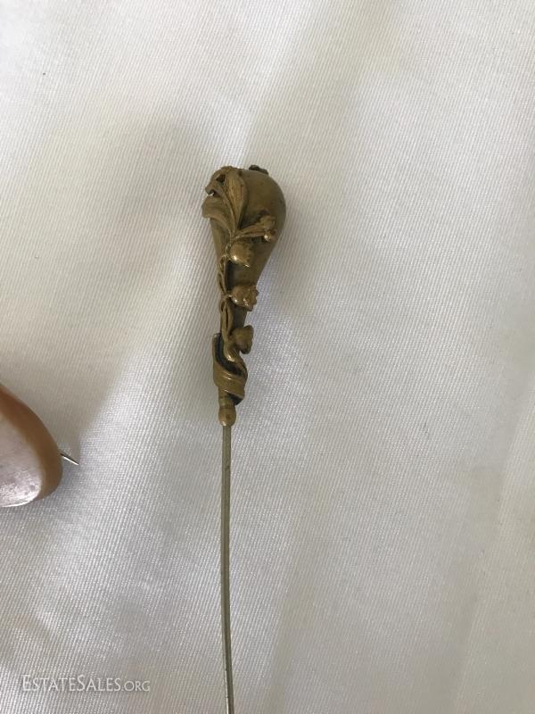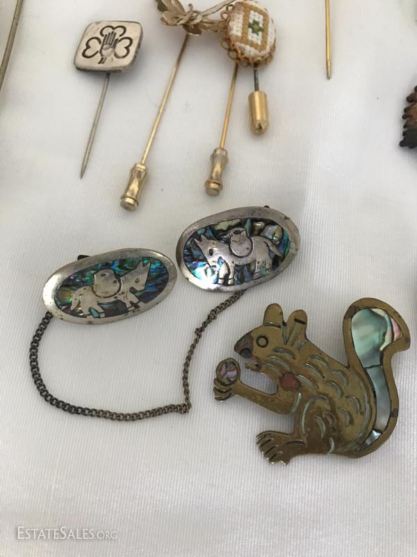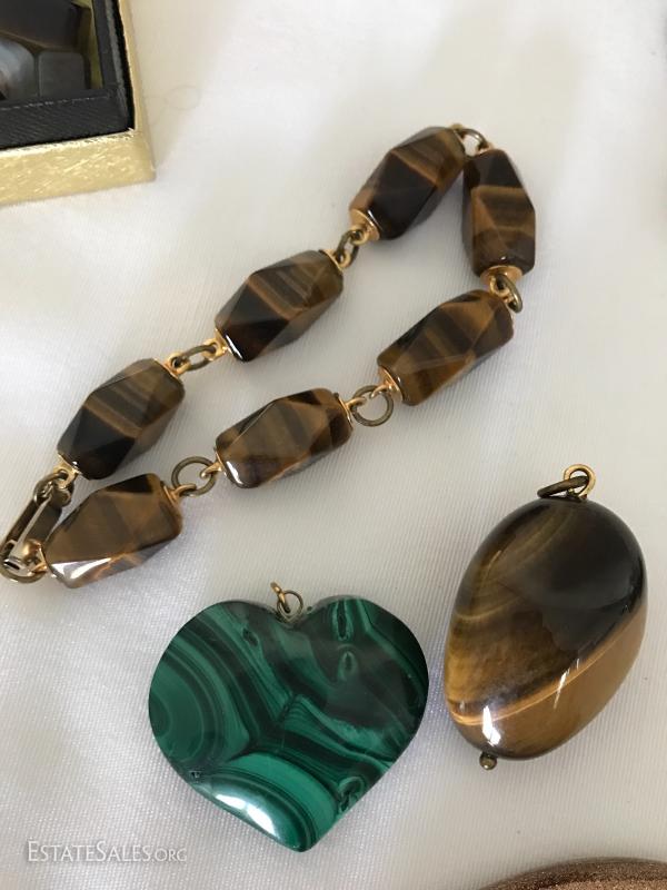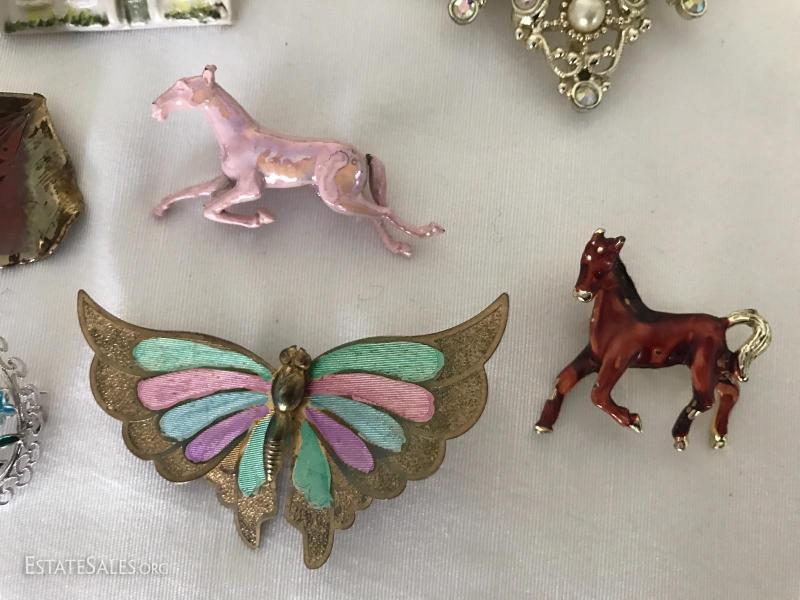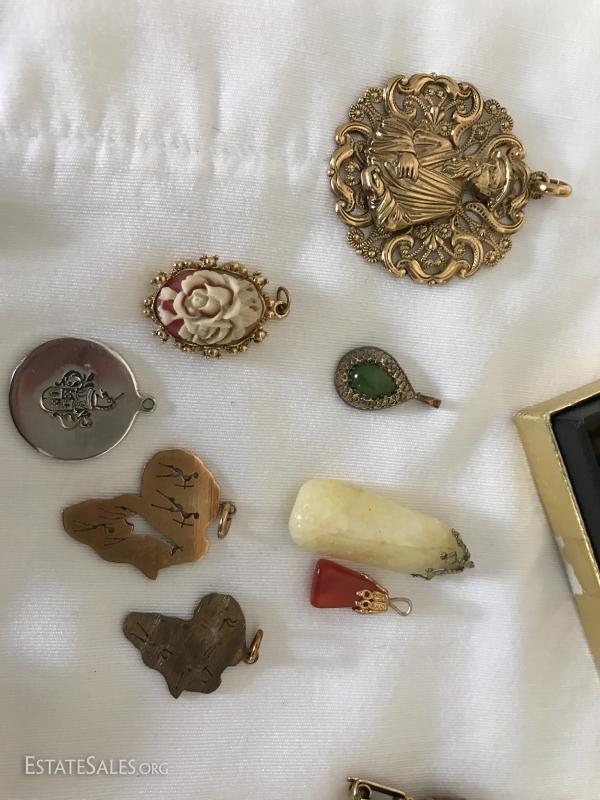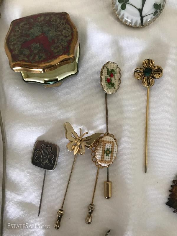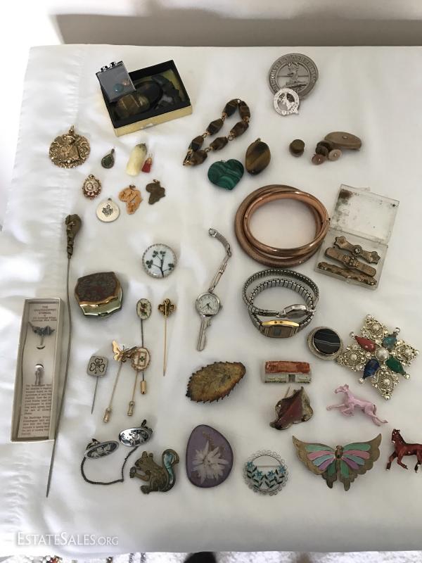 Many pins, pendants, hat pin, pill box, watches and stones. See photos for details.