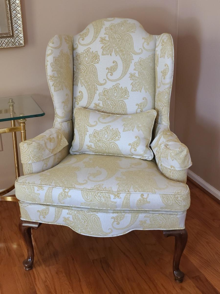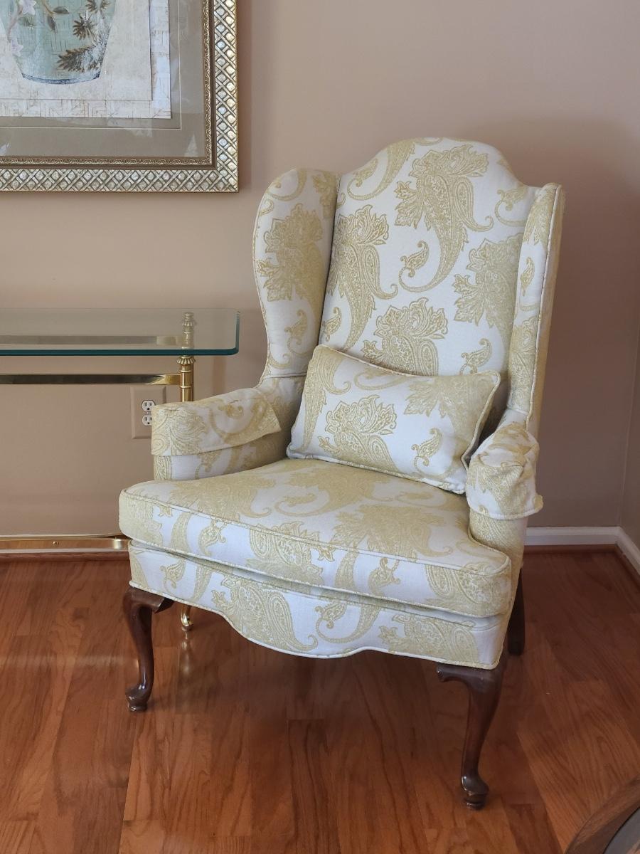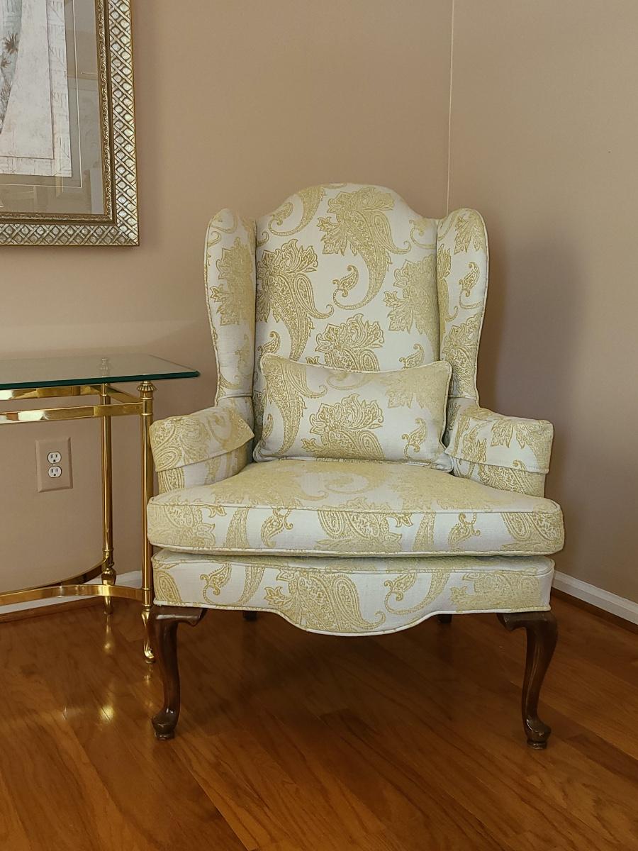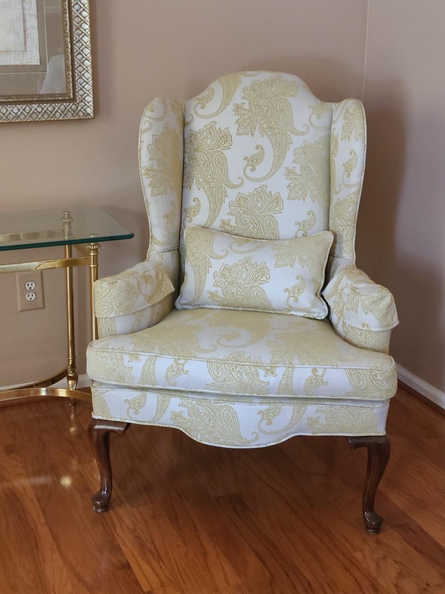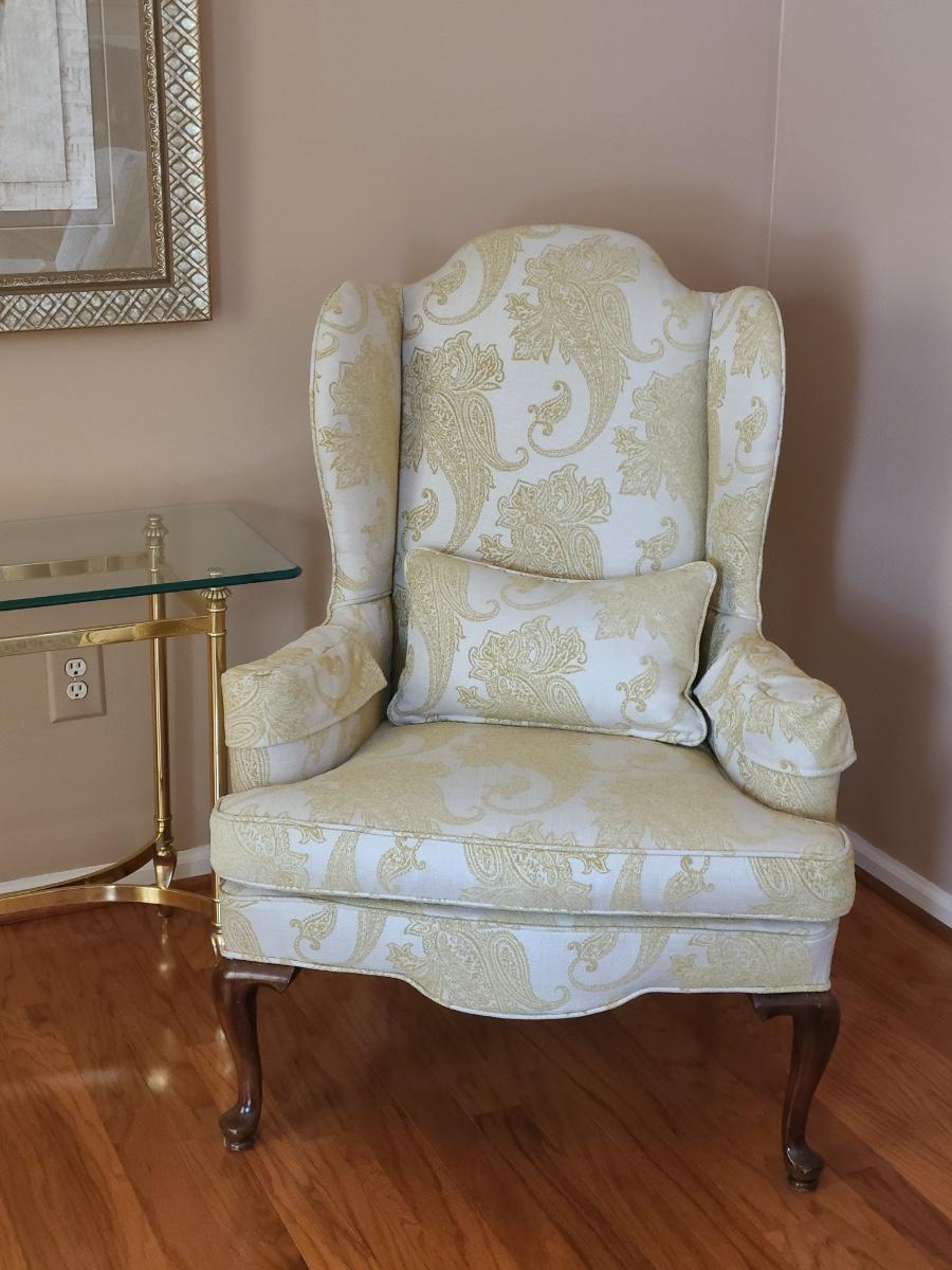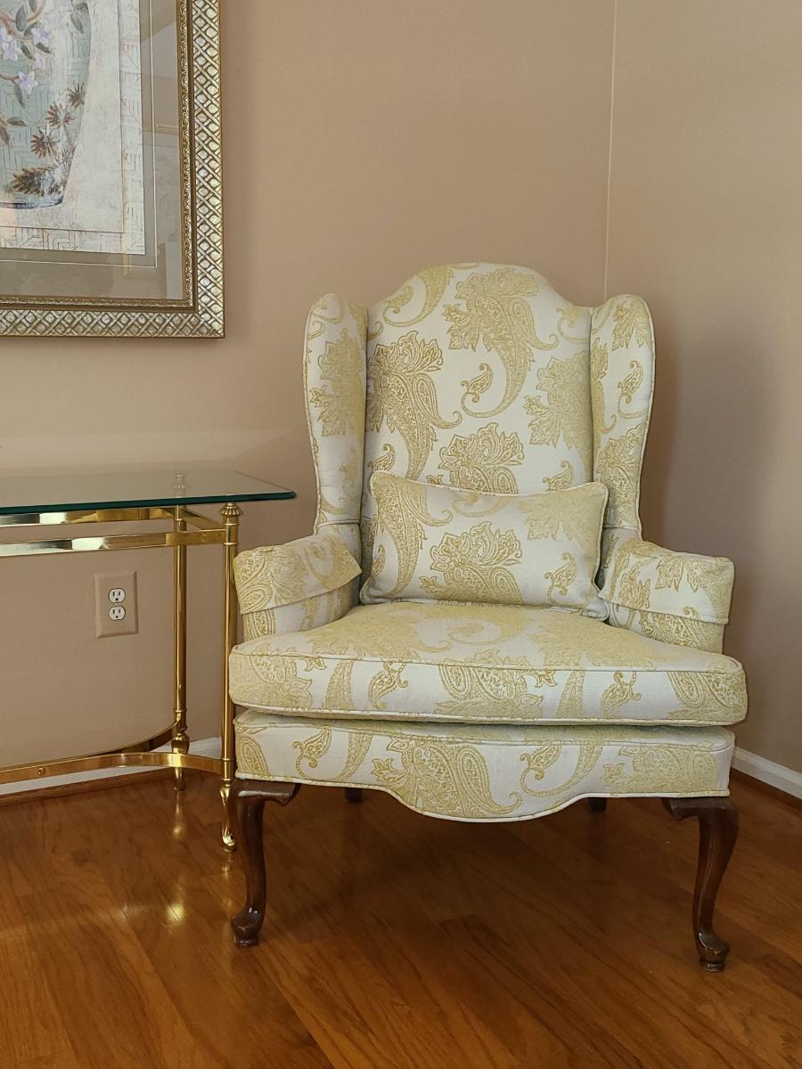 This chair was in a formal sitting room and still looks new! Gorgeous chair in soft yellow and cream. Perfect for any room of the home! Very comfortable. Please see all pictures as they are the best representation of the items. The pictures show condition, measurements if taken, and what is included in the lot. Due to the large amount that we photograph and the time frame, we are not always able to take measurements. All items unless noted, are pre-owned and have been used. If you purchased furniture, you must bring help. We do not allow one person to carry large furniture out on their own. Bring help, tools and a truck for the safety of our client’s homes, and your personal safety. Any damages that result to the property including walls, and floors due to moving of the furniture will be charged to the buyer. Company policy. Thank you.