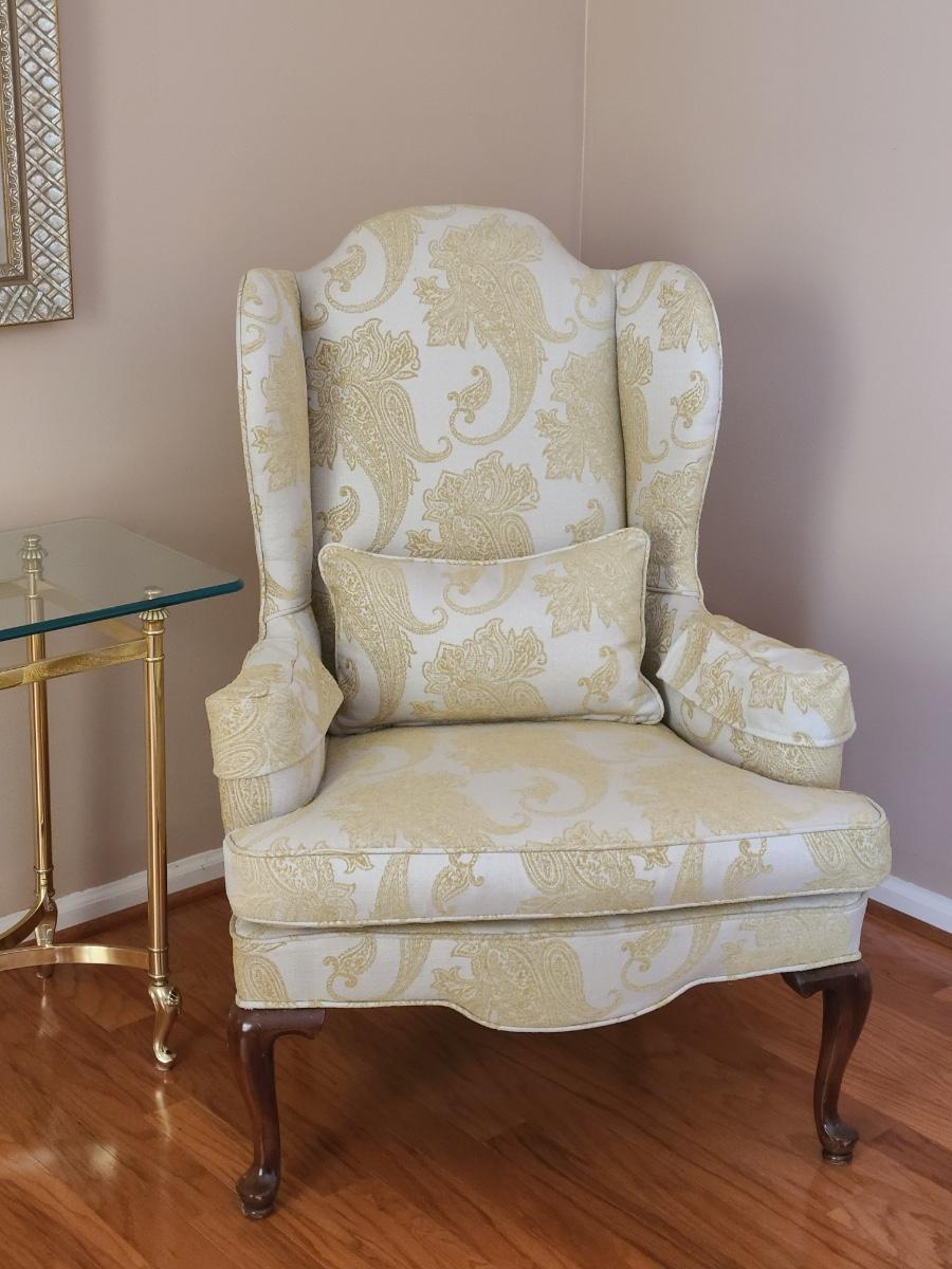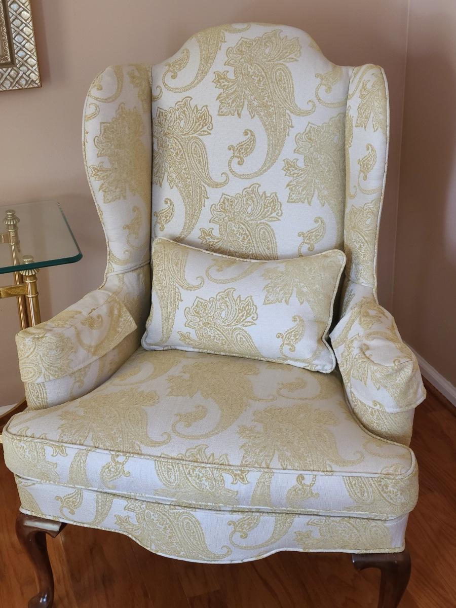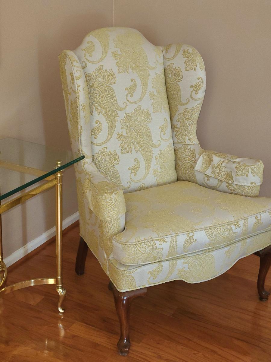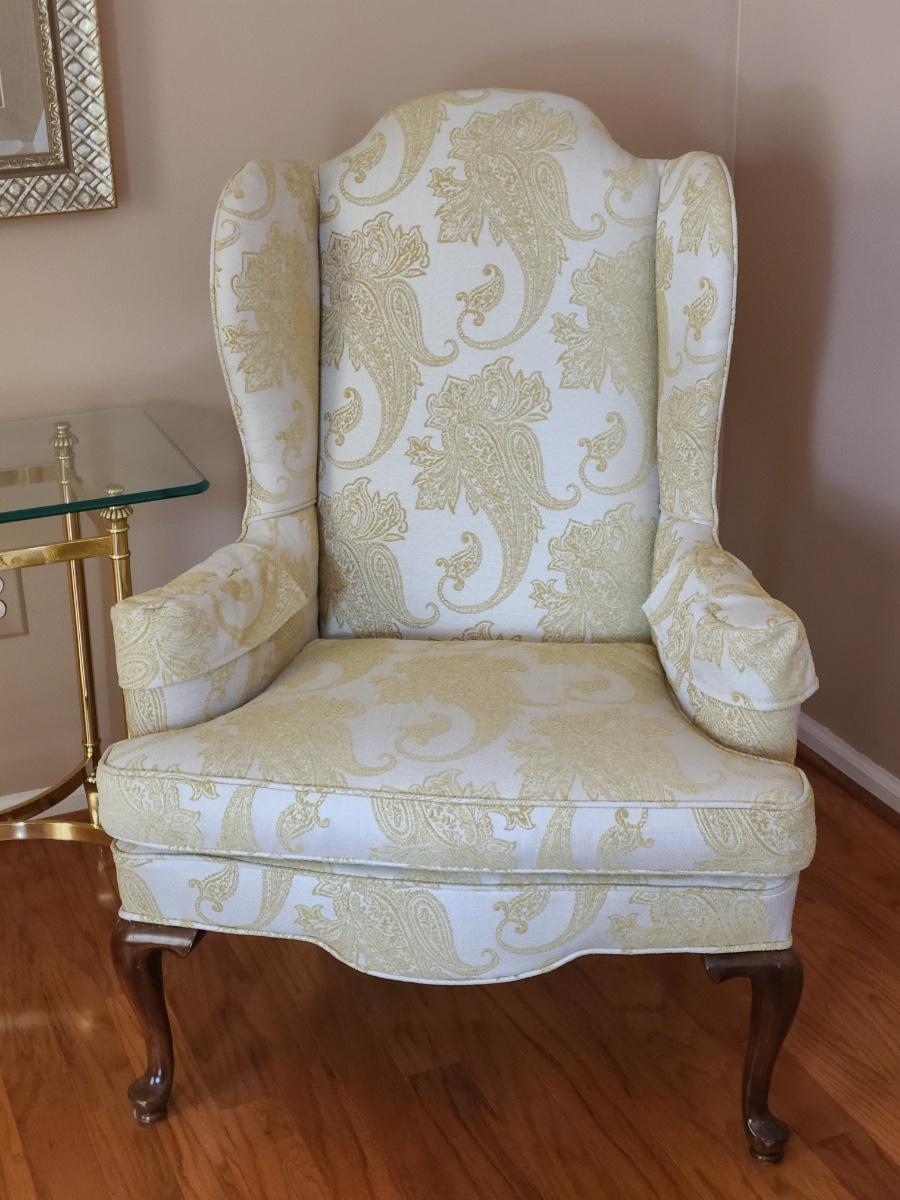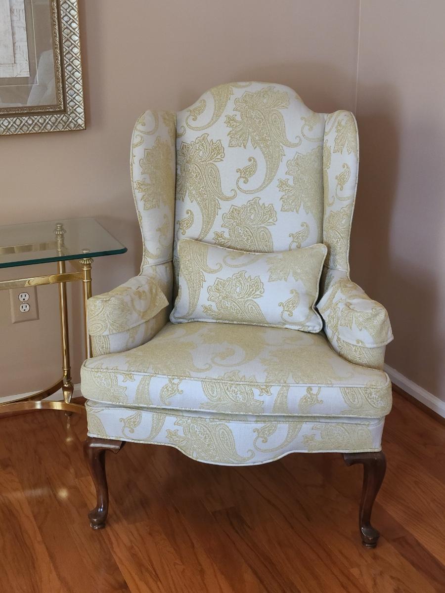 This chair was in a formal sitting room and still looks new! Gorgeous chair in soft yellow and cream. Perfect for any room of the home! Very comfortable. Please see all pictures as they are the best representation of the items. The pictures show condition, measurements if taken, and what is included in the lot. Due to the large amount that we photograph and the time frame, we are not always able to take measurements. All items unless noted, are pre-owned and have been used. If you purchased furniture, you must bring help. We do not allow one person to carry large furniture out on their own. Bring help, tools and a truck for the safety of our client’s homes, and your personal safety. Any damages that result to the property including walls, and floors due to moving of the furniture will be charged to the buyer. Company policy. Thank you.