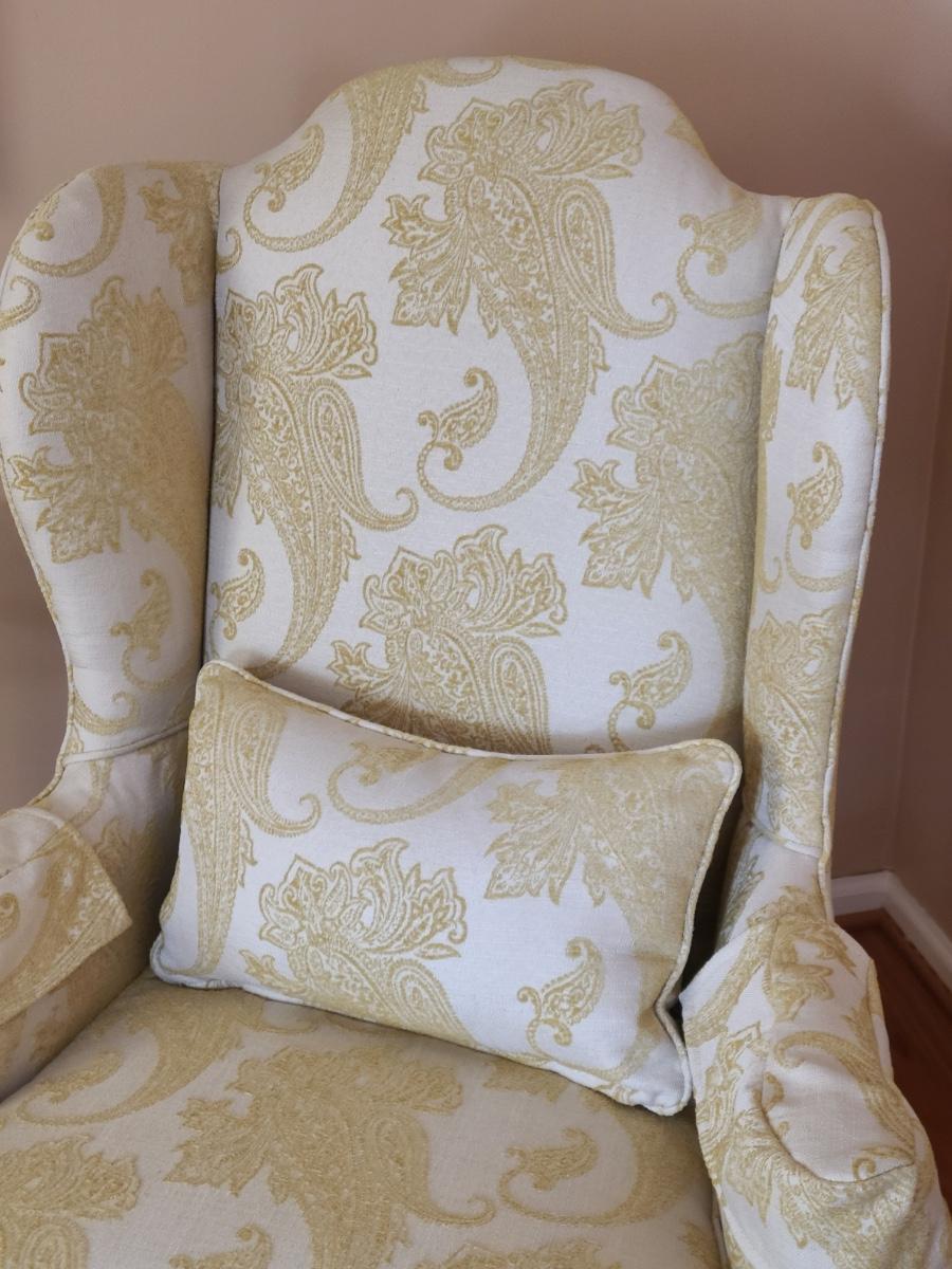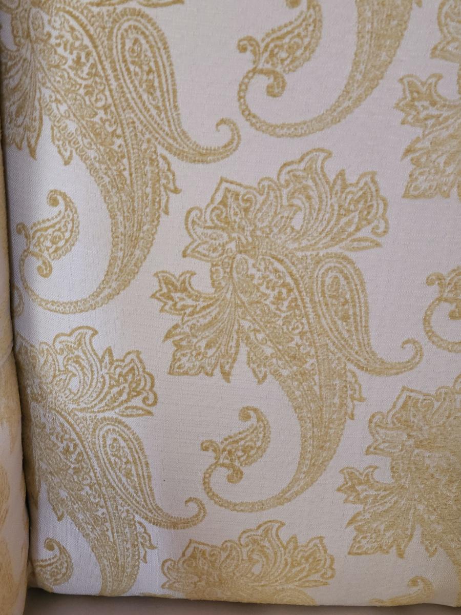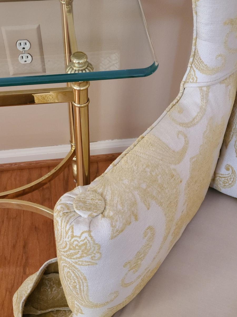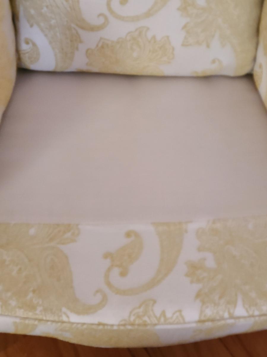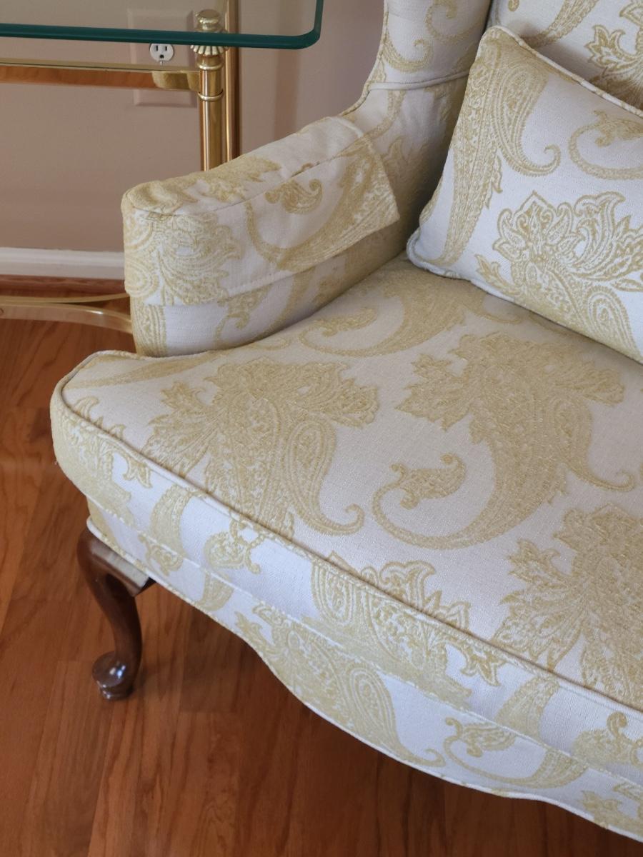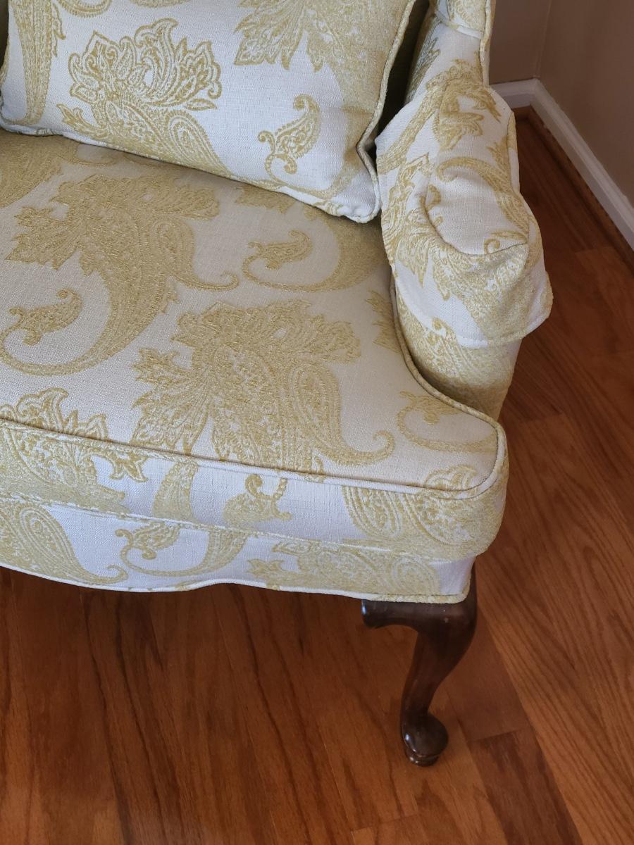 This chair was in a formal sitting room and still looks new! Gorgeous chair in soft yellow and cream. Perfect for any room of the home! Very comfortable. Please see all pictures as they are the best representation of the items. The pictures show condition, measurements if taken, and what is included in the lot. Due to the large amount that we photograph and the time frame, we are not always able to take measurements. All items unless noted, are pre-owned and have been used. If you purchased furniture, you must bring help. We do not allow one person to carry large furniture out on their own. Bring help, tools and a truck for the safety of our client’s homes, and your personal safety. Any damages that result to the property including walls, and floors due to moving of the furniture will be charged to the buyer. Company policy. Thank you.