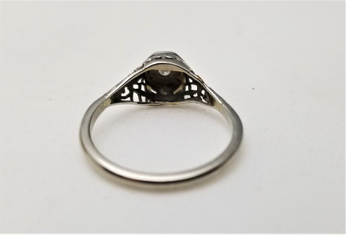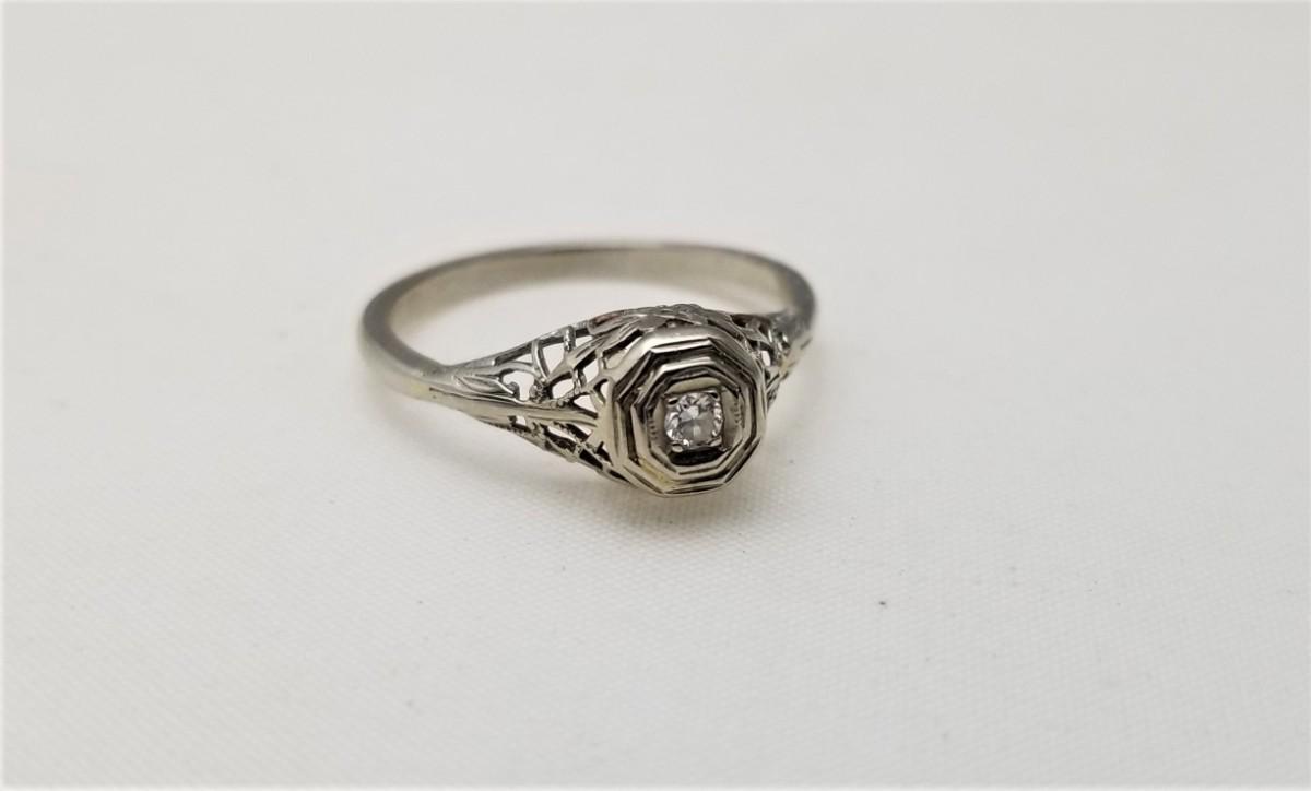 Unmarked (tested) 14kt white gold - filigree style engagement ring - ca. 1920 - with small diamond. Size 7.