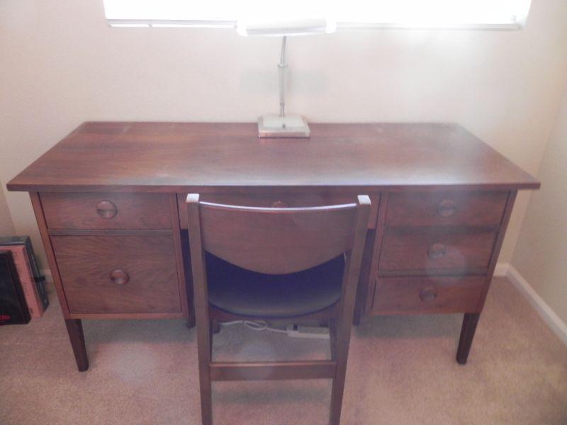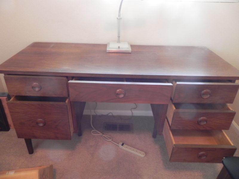 WOODEN DESK WITH A TOTAL OF 6 DRAWERS, 1 IS A FILING CABINET. ALL DRAWERS ARE DOVE TAILED AND DESK IS IN VERY GOOD CONDITION