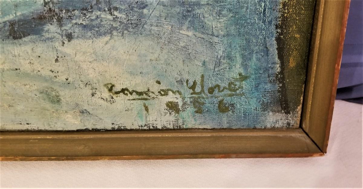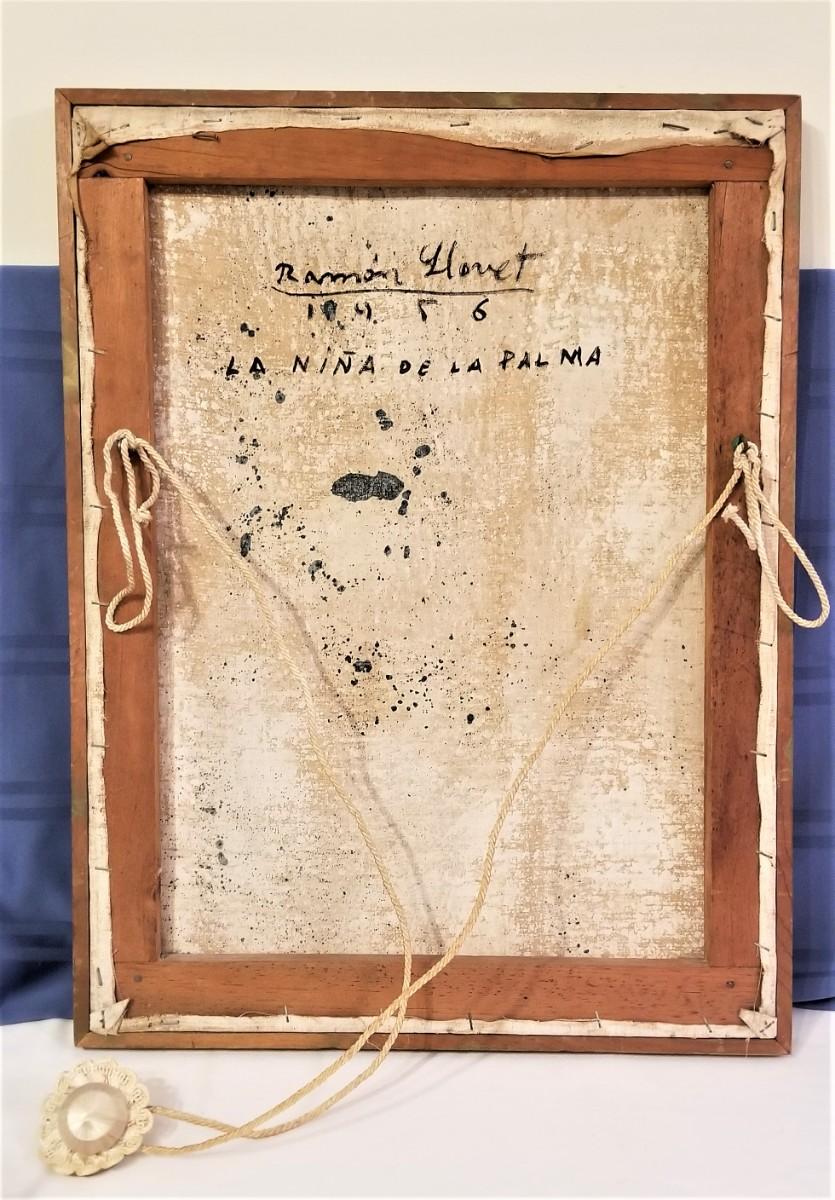 This oil on canvas, dated 1956 and entitles "La Nina de la Palmas" was done by Listed Artist Ramon Hovet. Vintage frame has a small gouge out of it - looks as though it may have been reframed at some point. His work has been auctioned at Christie's in New York.