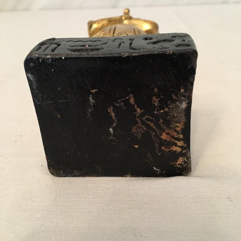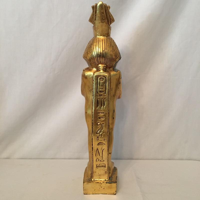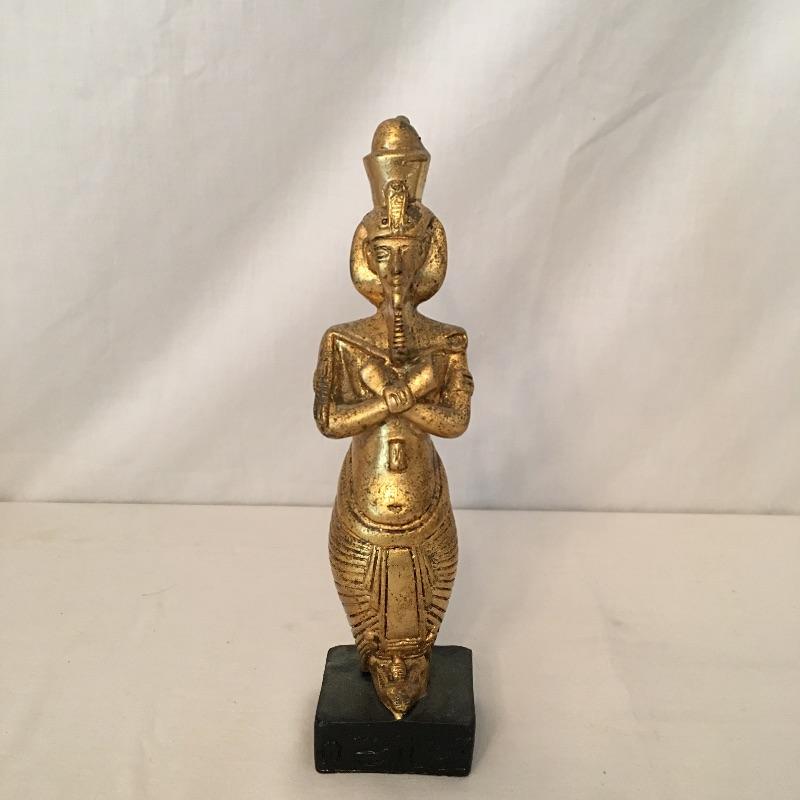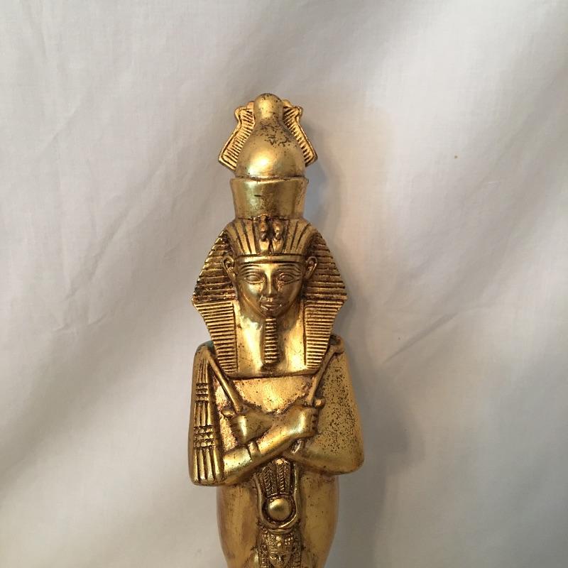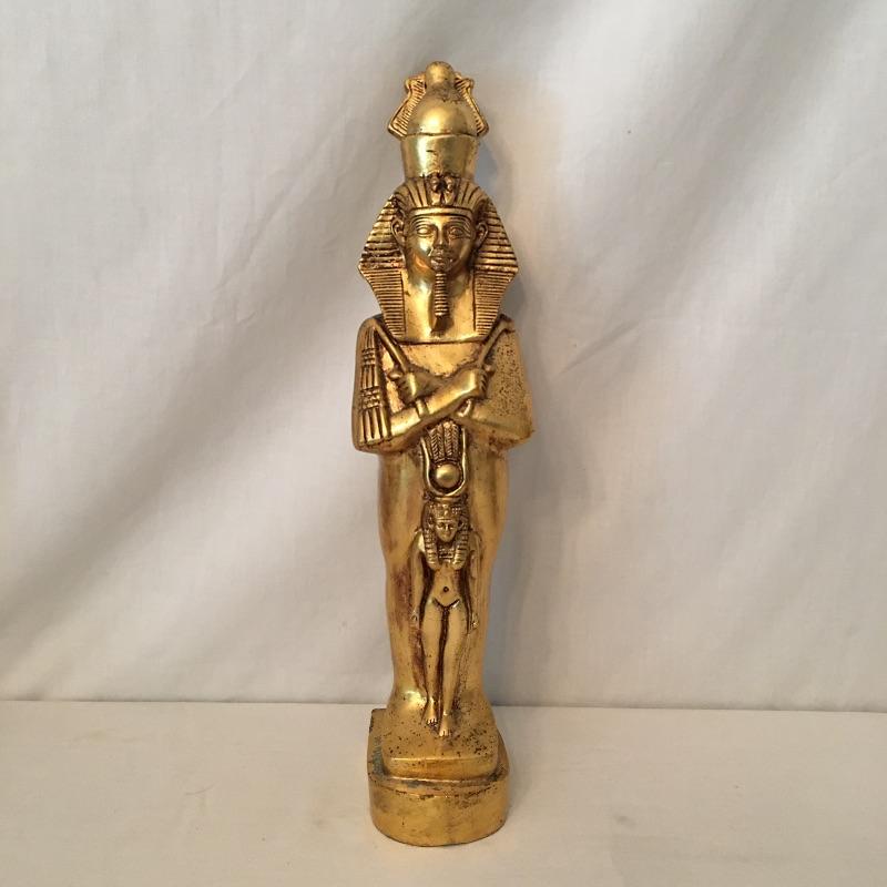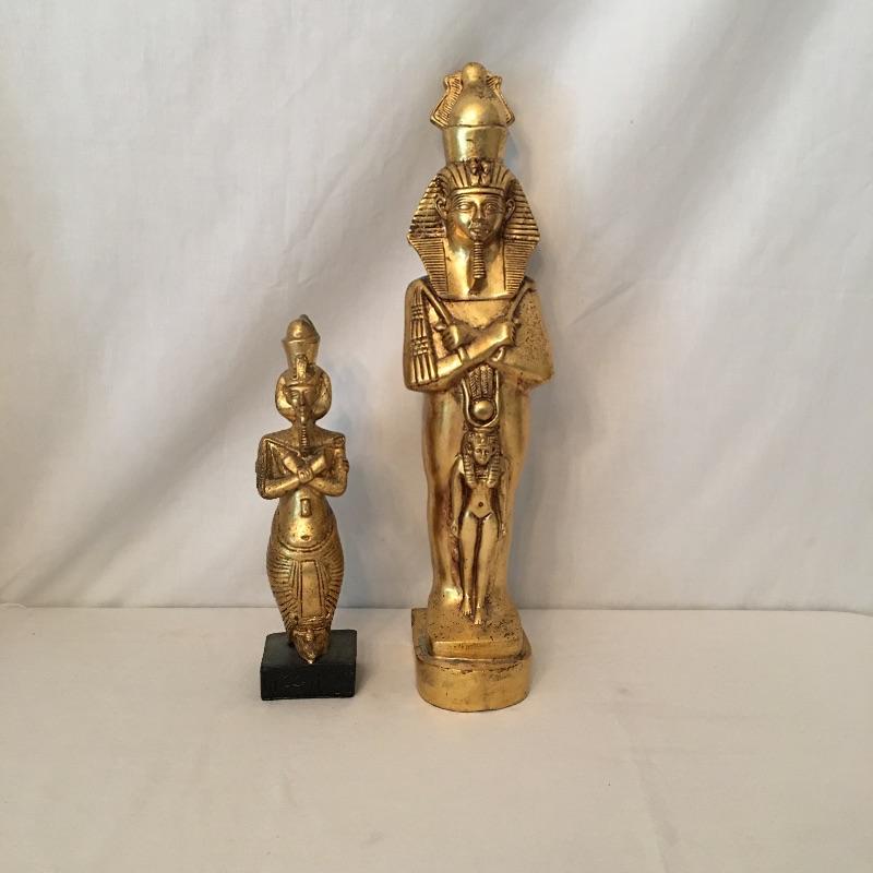 Striking pair of Egyptian gold colored statues. These two eye-catching Pharaohs will add glamor and history to your space. Larger statue is very heavy and appears to be stone underneath, but cannot be verified. Smaller statue is much lighter with a black base. Largest statue measure 18” tall with a 3.5” x 5” base.