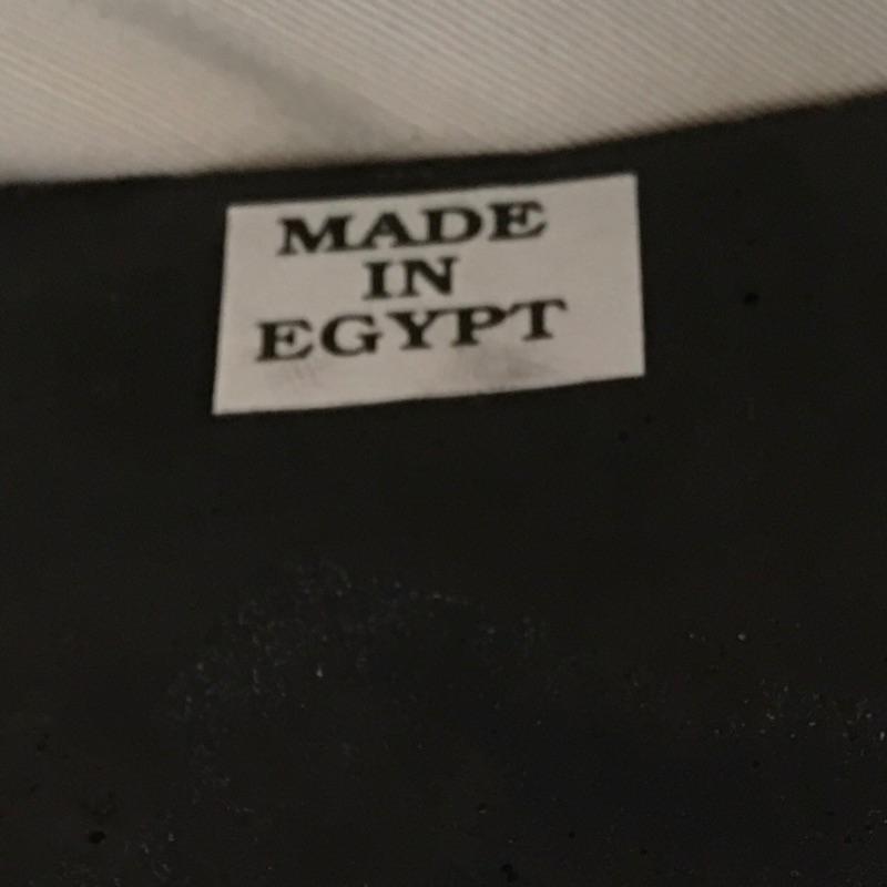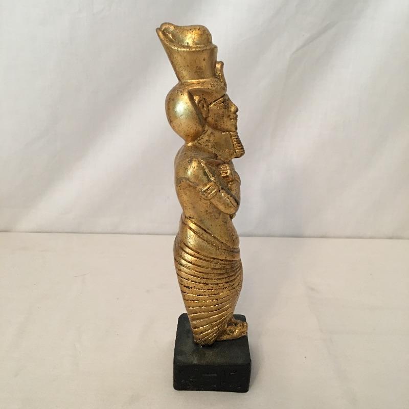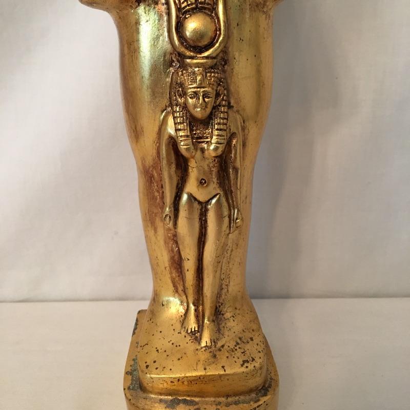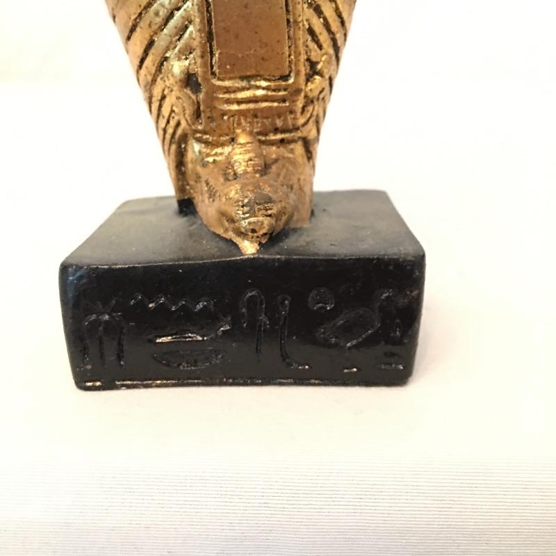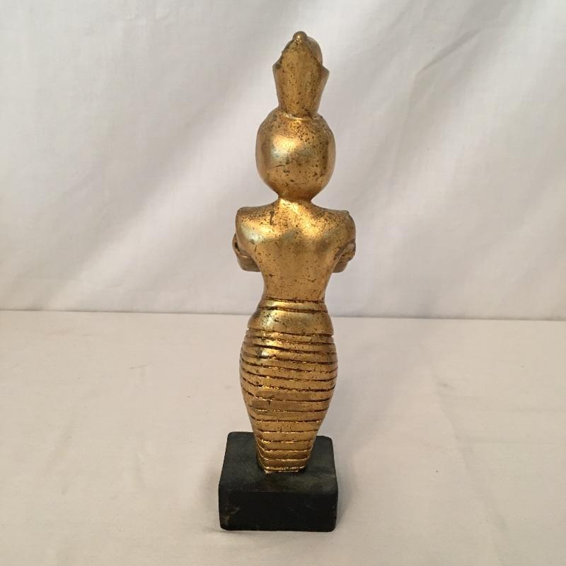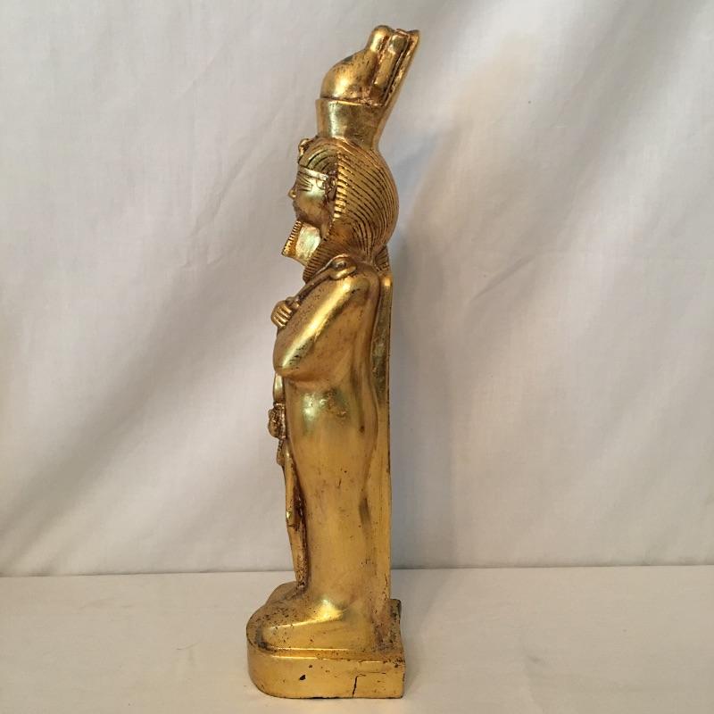 Striking pair of Egyptian gold colored statues. These two eye-catching Pharaohs will add glamor and history to your space. Larger statue is very heavy and appears to be stone underneath, but cannot be verified. Smaller statue is much lighter with a black base. Largest statue measure 18” tall with a 3.5” x 5” base.
