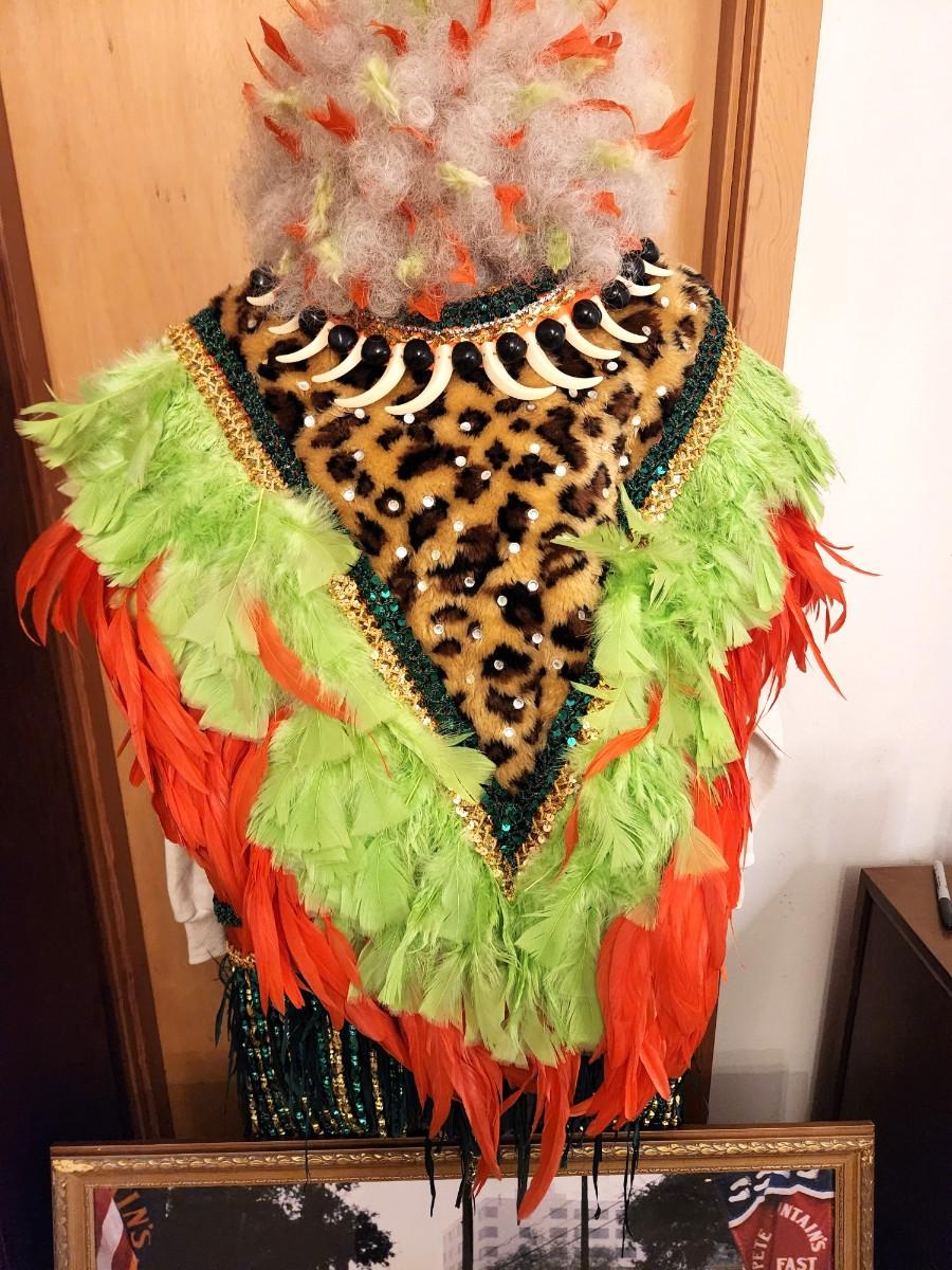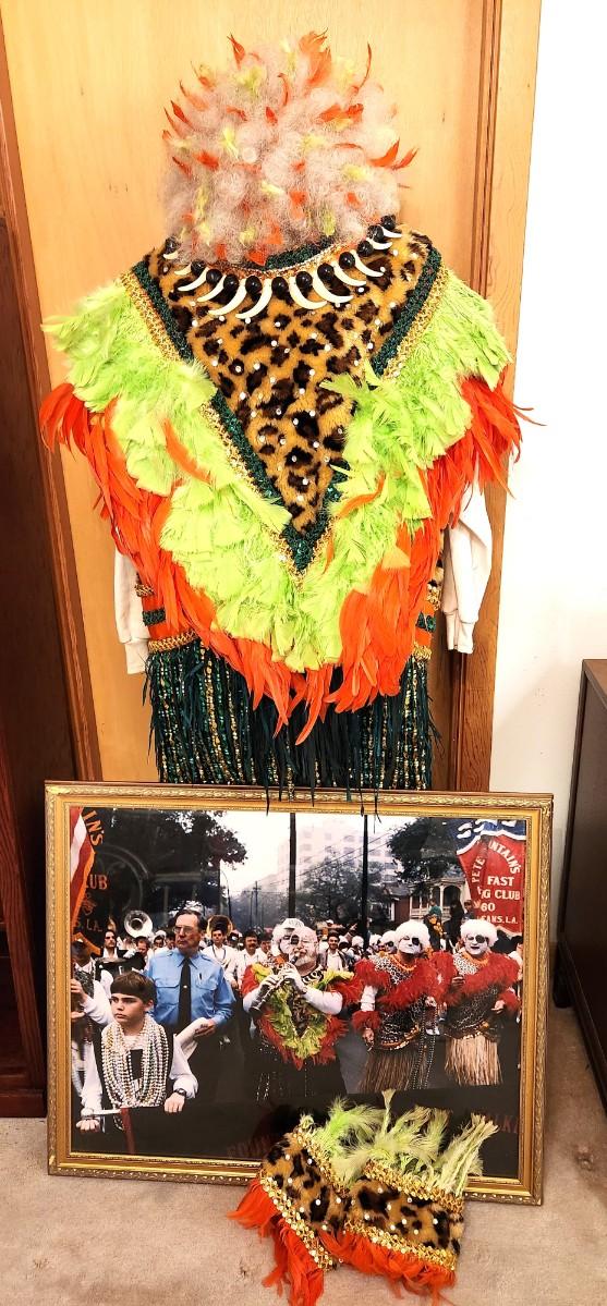 Witch Doctor Performance Costume worn by Pete - Half Fast Marching Club - You get all you see here. Lot of feathers on the top - if you shake it up some will come off! - including a large color framed photo of Pete wearing the costume and performing with his club.