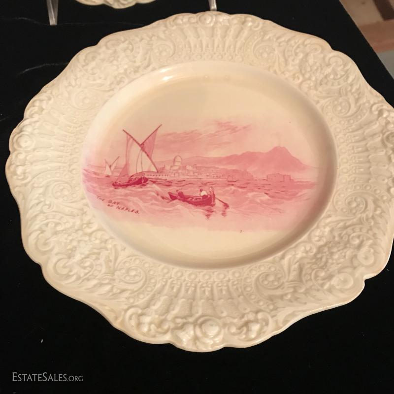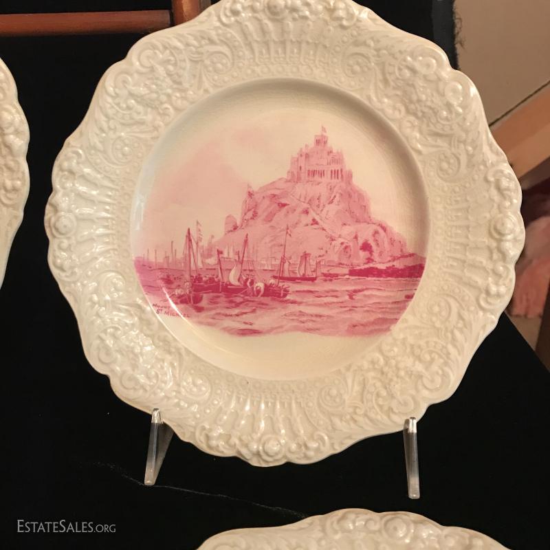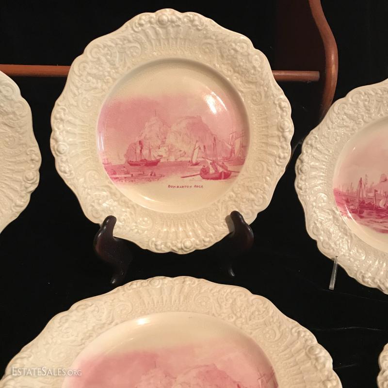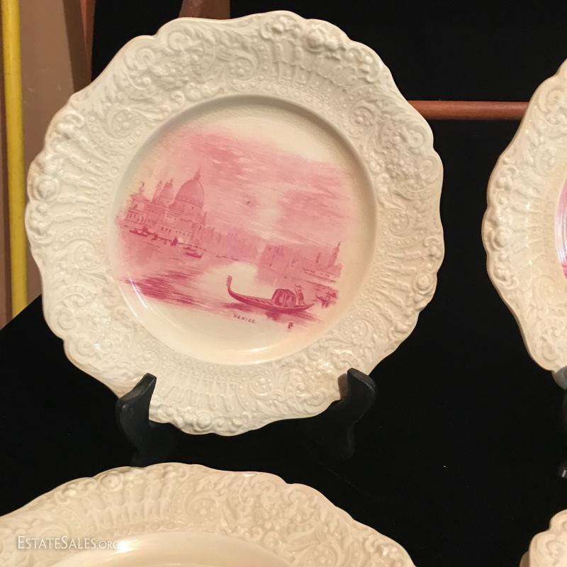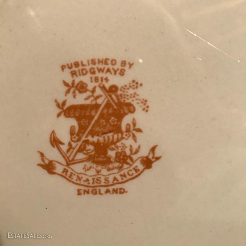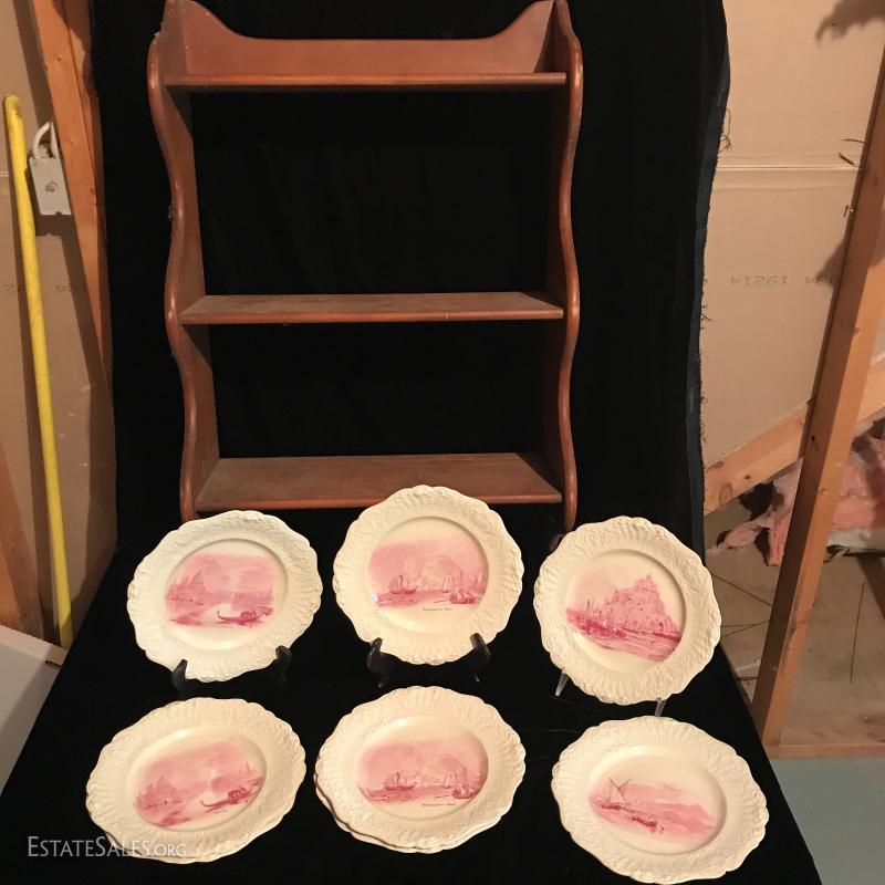 8 Ridgways Renaissance plates in 4 scenes with wood plate rack to mount on wall. Rack measures 20" x 30" x 8". This lot is available for shipping or local pick up in Flat Rock, NC.