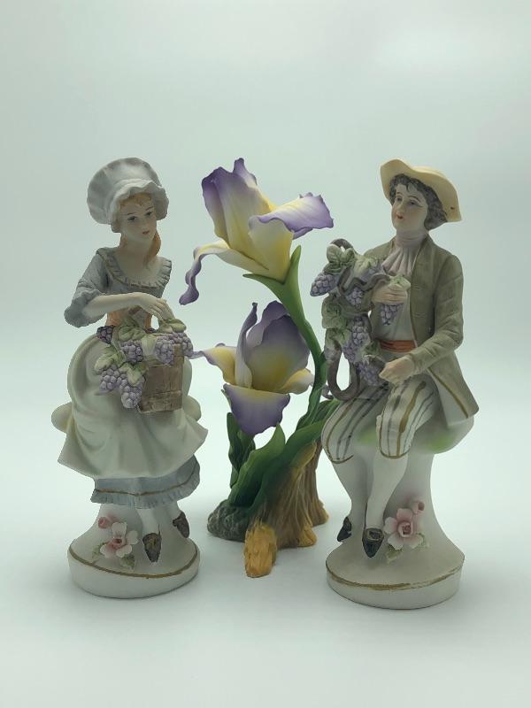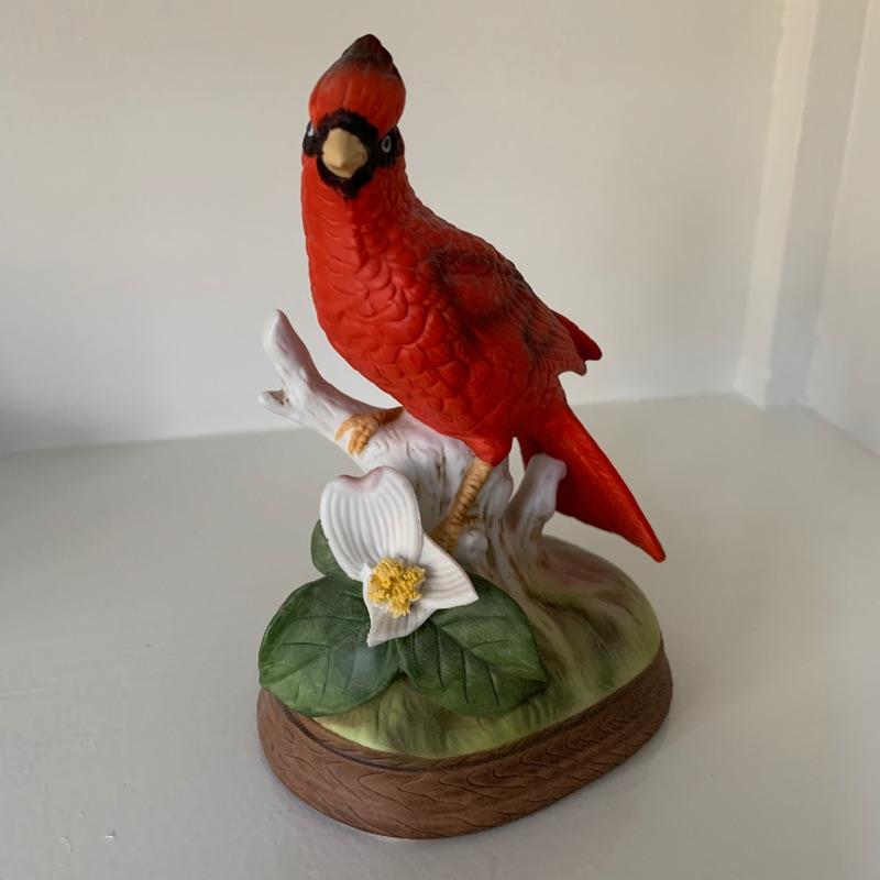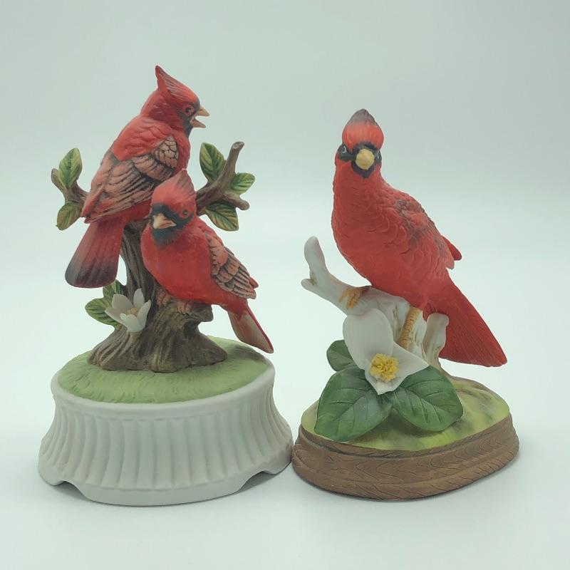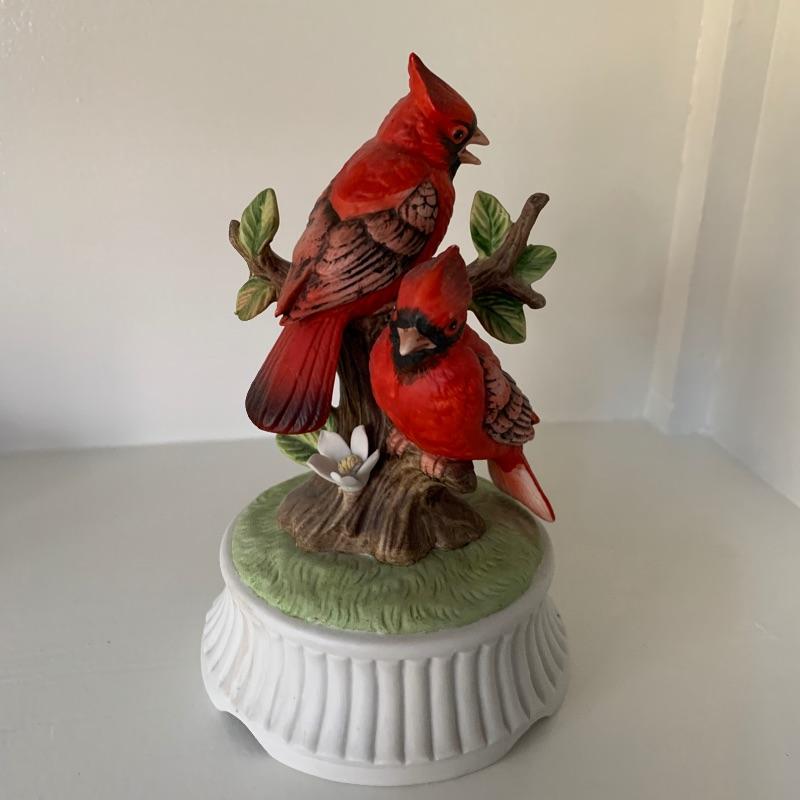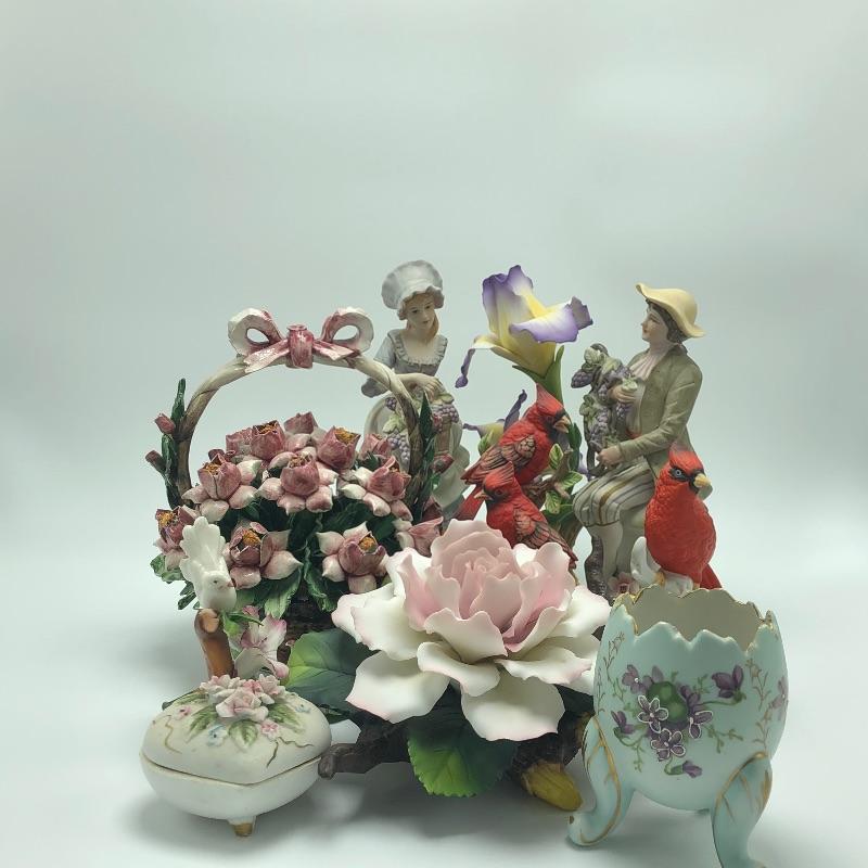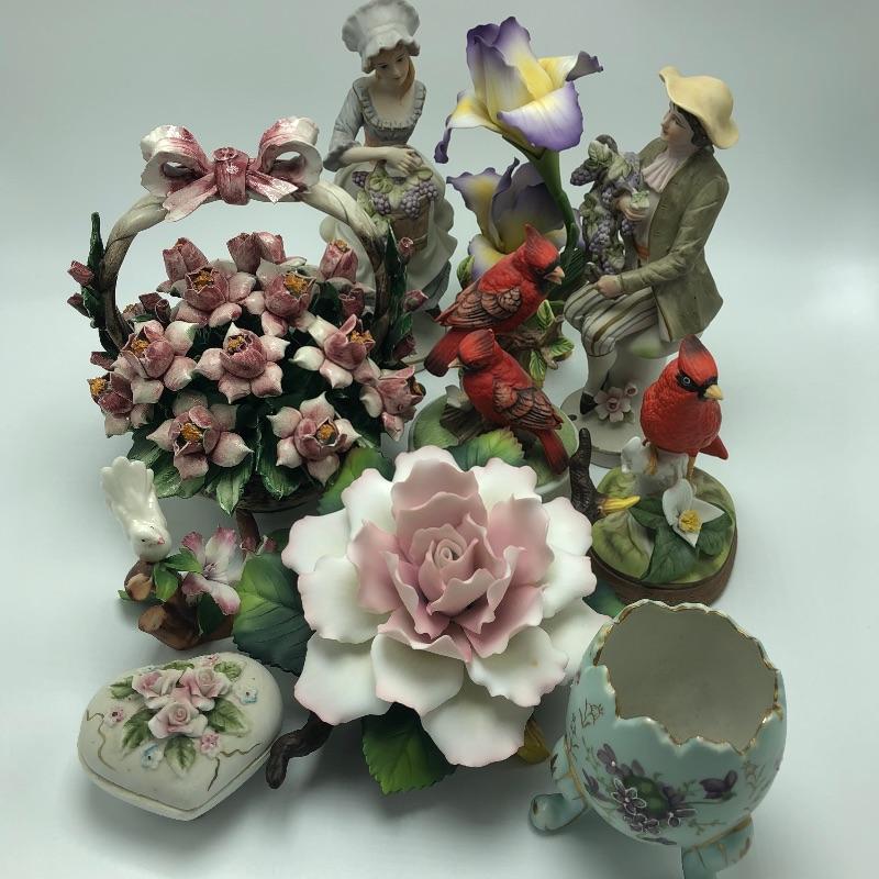 This collection of porcelain birds, floral pieces, and figurines will land just right on the shelf of someone special this holiday season. Heart shaped piece is a candle. Lady figurine has a broken arm that may be easily glued back on see photo. One with two Cardinals piece is a music box that plays “tomorrow” and the single cardinal has a broken flower. The Italian dove piece has broke flower also. The rest appear to be in great shape and even these are hardly noticeable. Largest piece measures 7” x 6” x 8”. Shipping available.