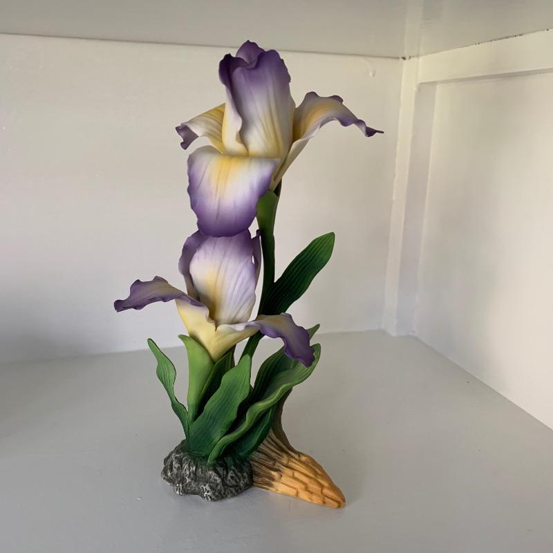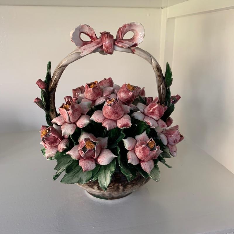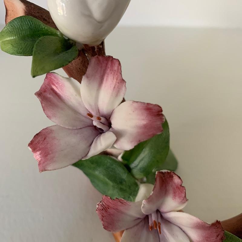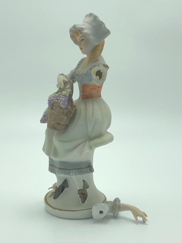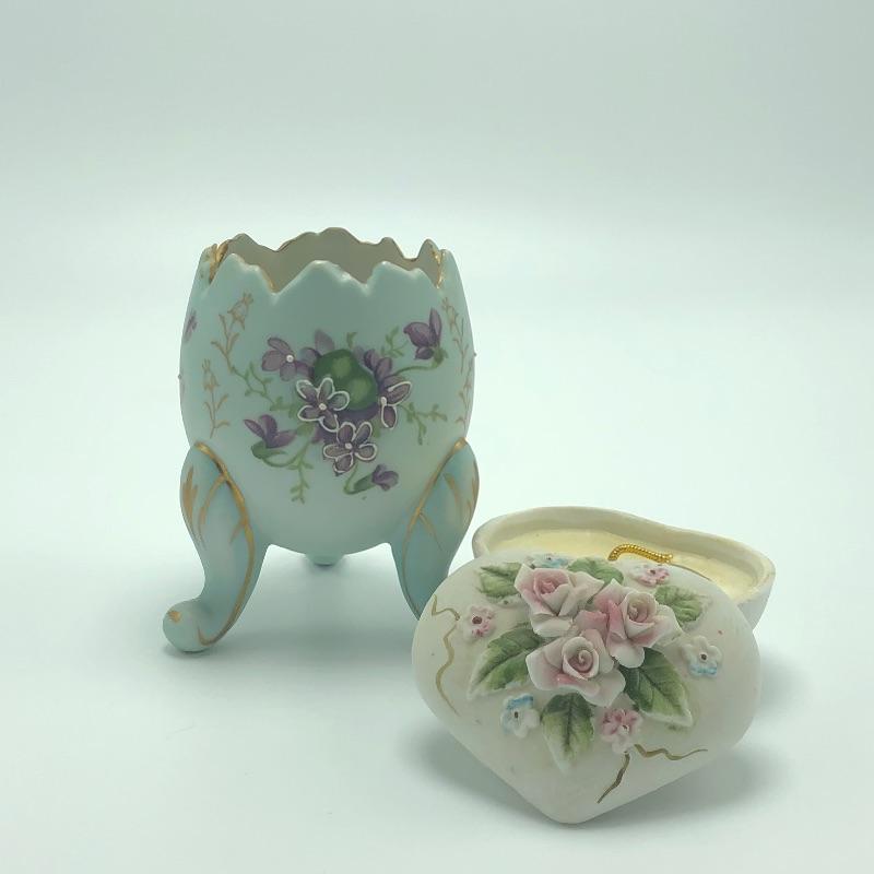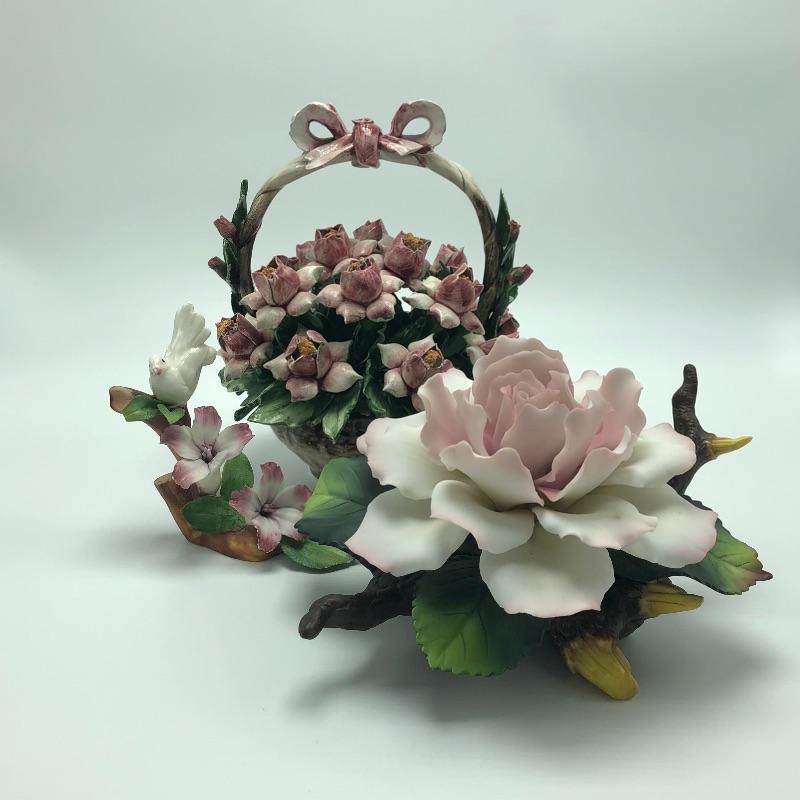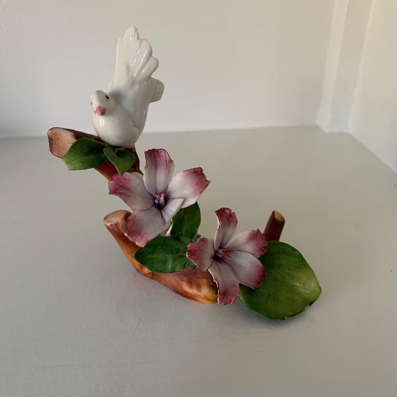 This collection of porcelain birds, floral pieces, and figurines will land just right on the shelf of someone special this holiday season. Heart shaped piece is a candle. Lady figurine has a broken arm that may be easily glued back on see photo. One with two Cardinals piece is a music box that plays “tomorrow” and the single cardinal has a broken flower. The Italian dove piece has broke flower also. The rest appear to be in great shape and even these are hardly noticeable. Largest piece measures 7” x 6” x 8”. Shipping available.