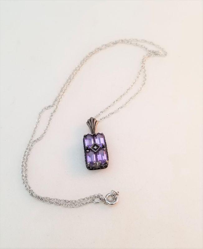 Contemporary piece with antique styling - sterling silver, marcasite, and square cut amethyst necklace. VERY pretty. Chain is about 18" long.